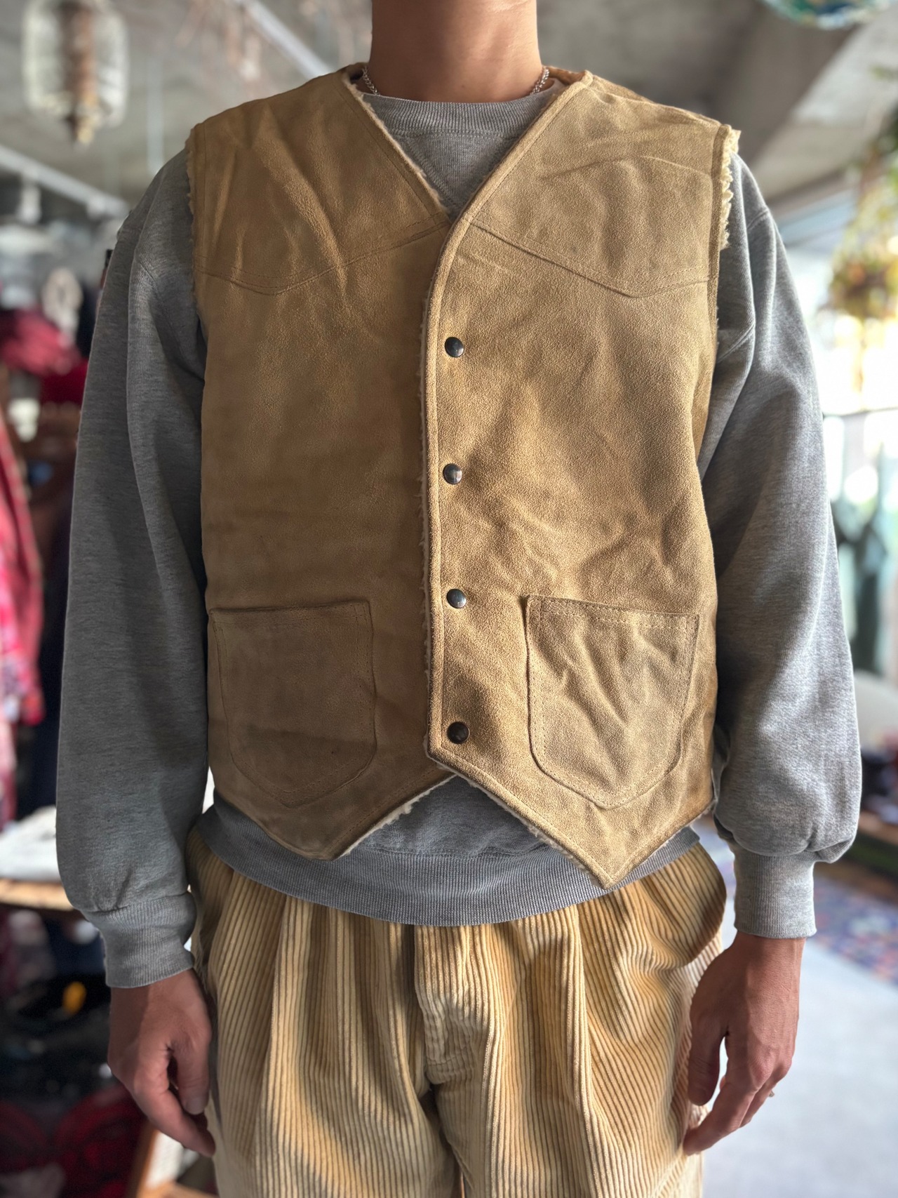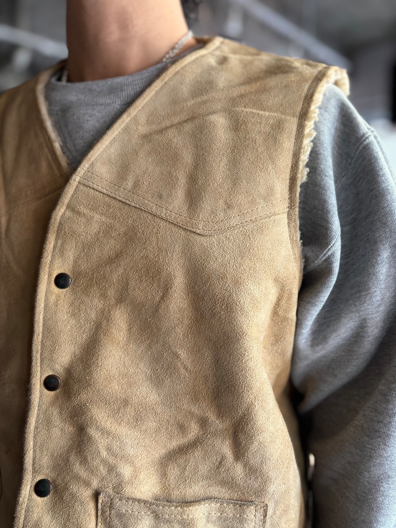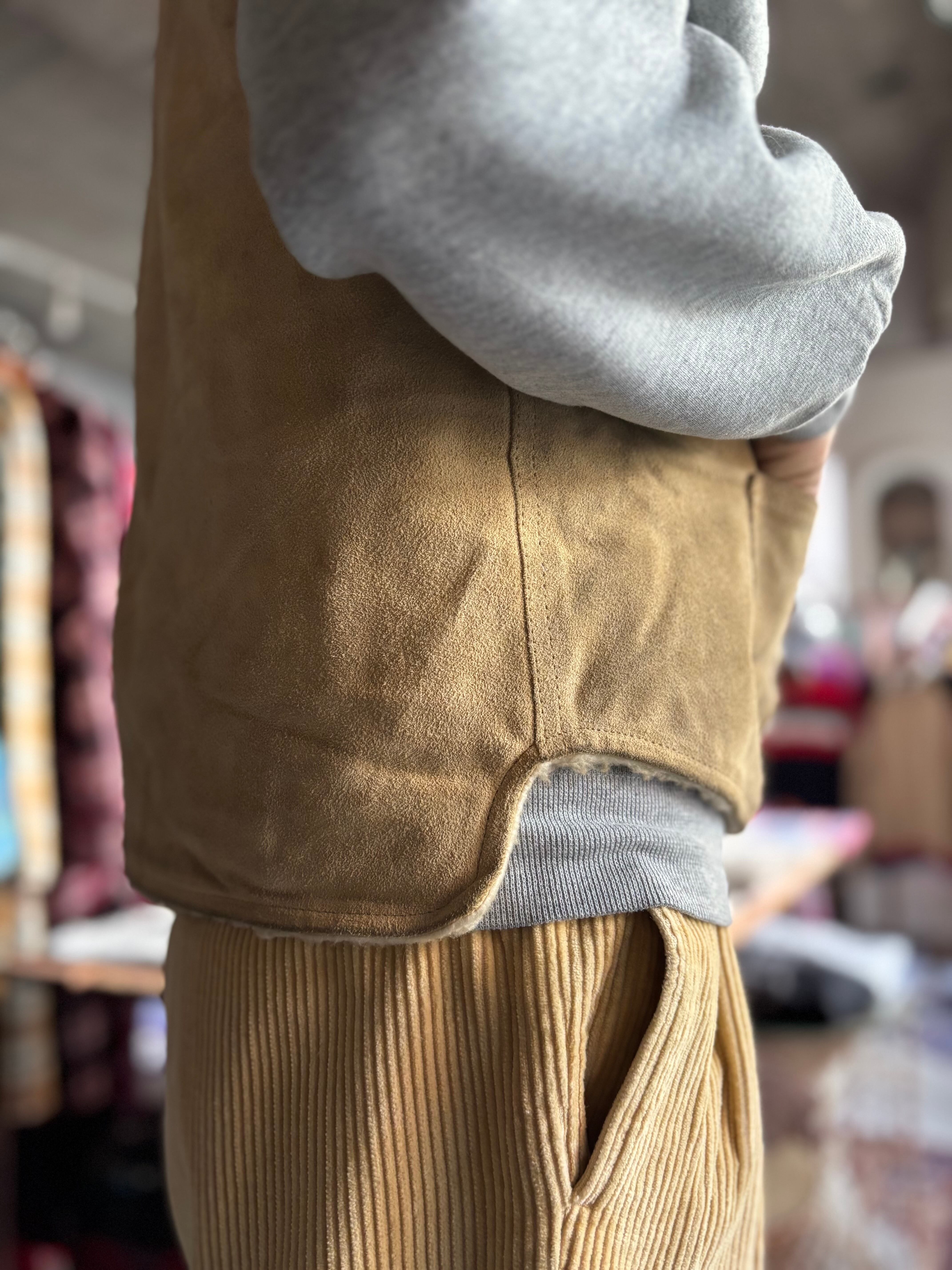 革質の良いヌバックレザーに、暖かいボアライナー。オーセンティックフィット。小ぶりのスナップボタンとパチポケが可愛いです。