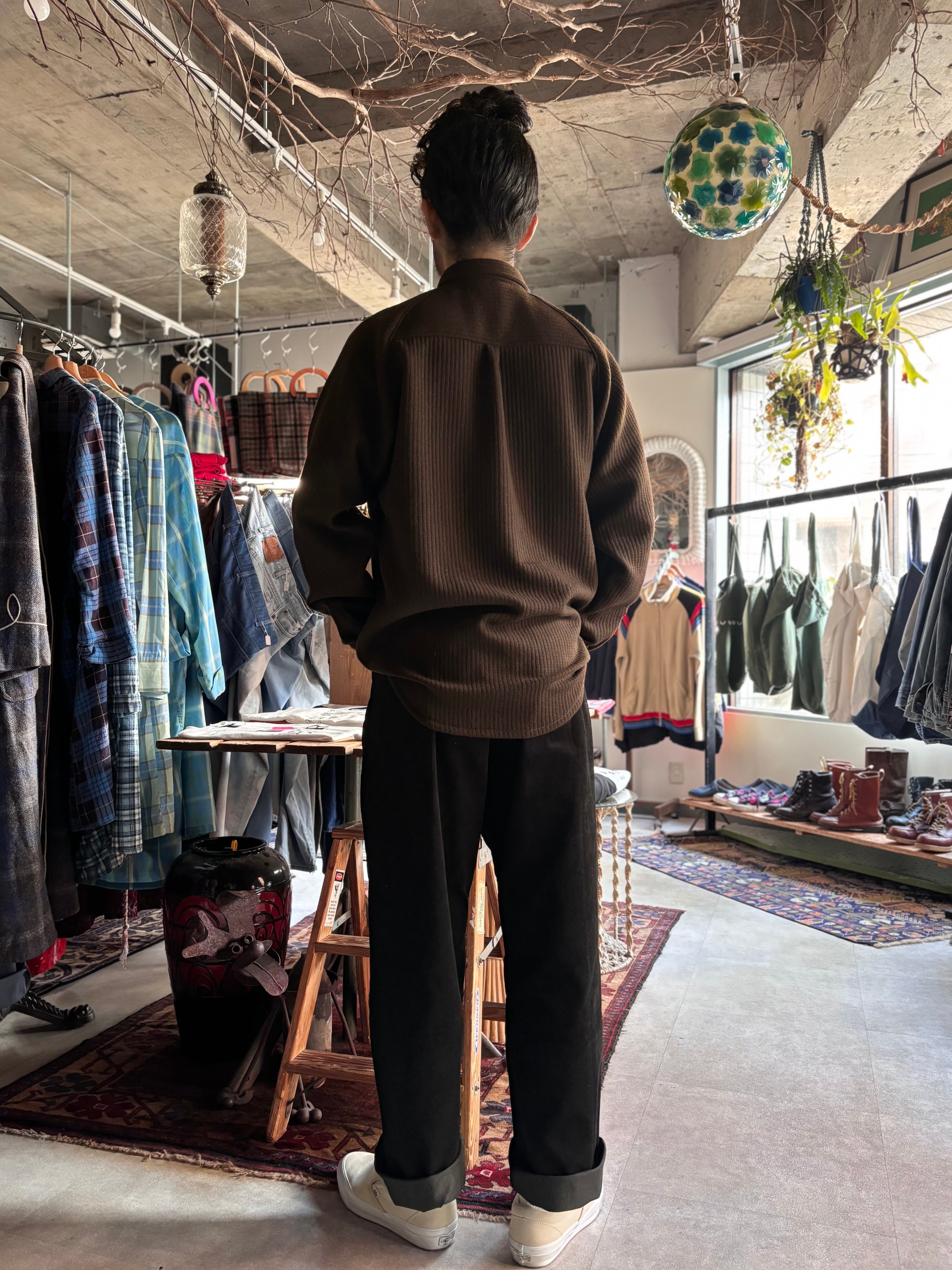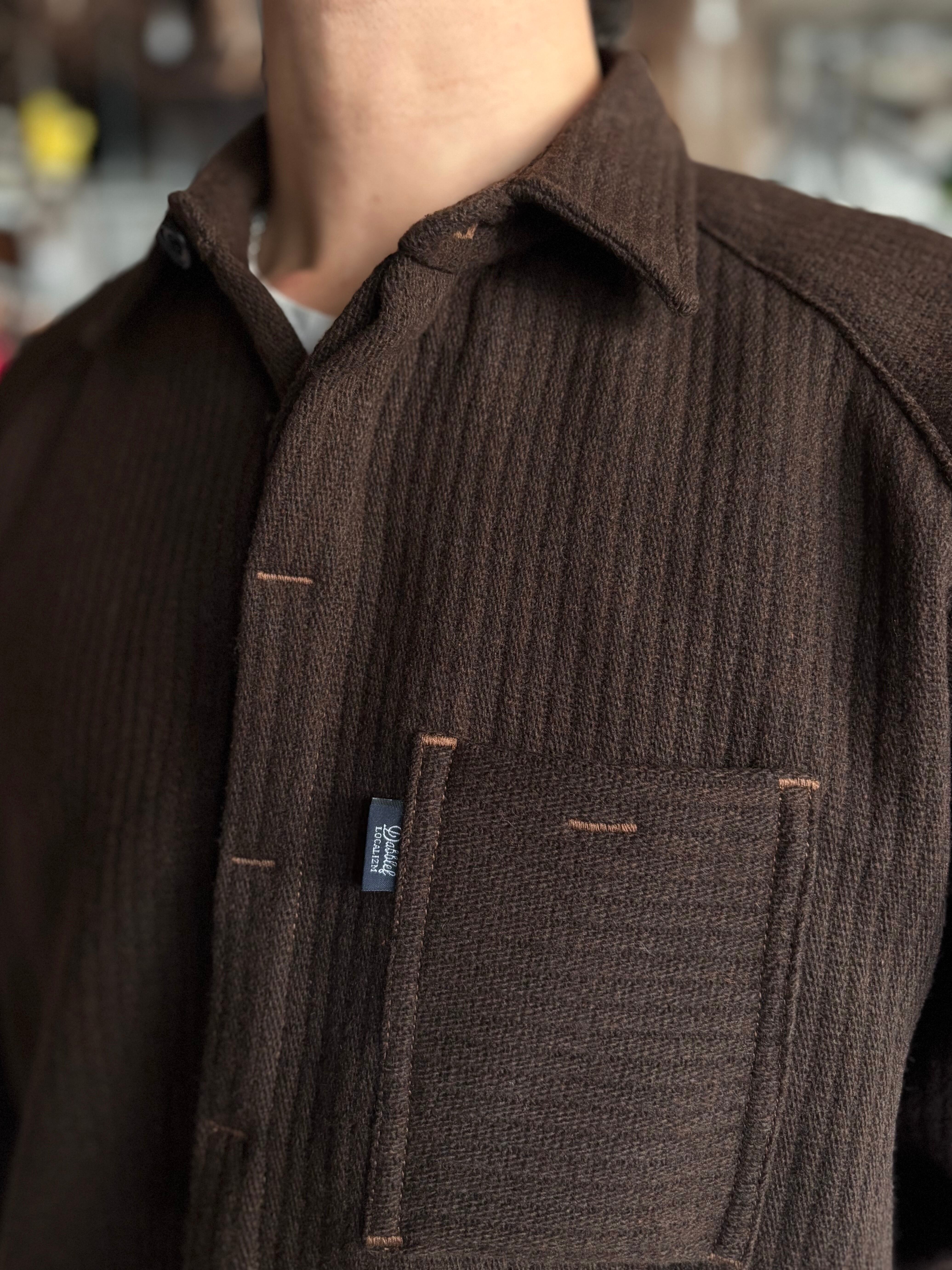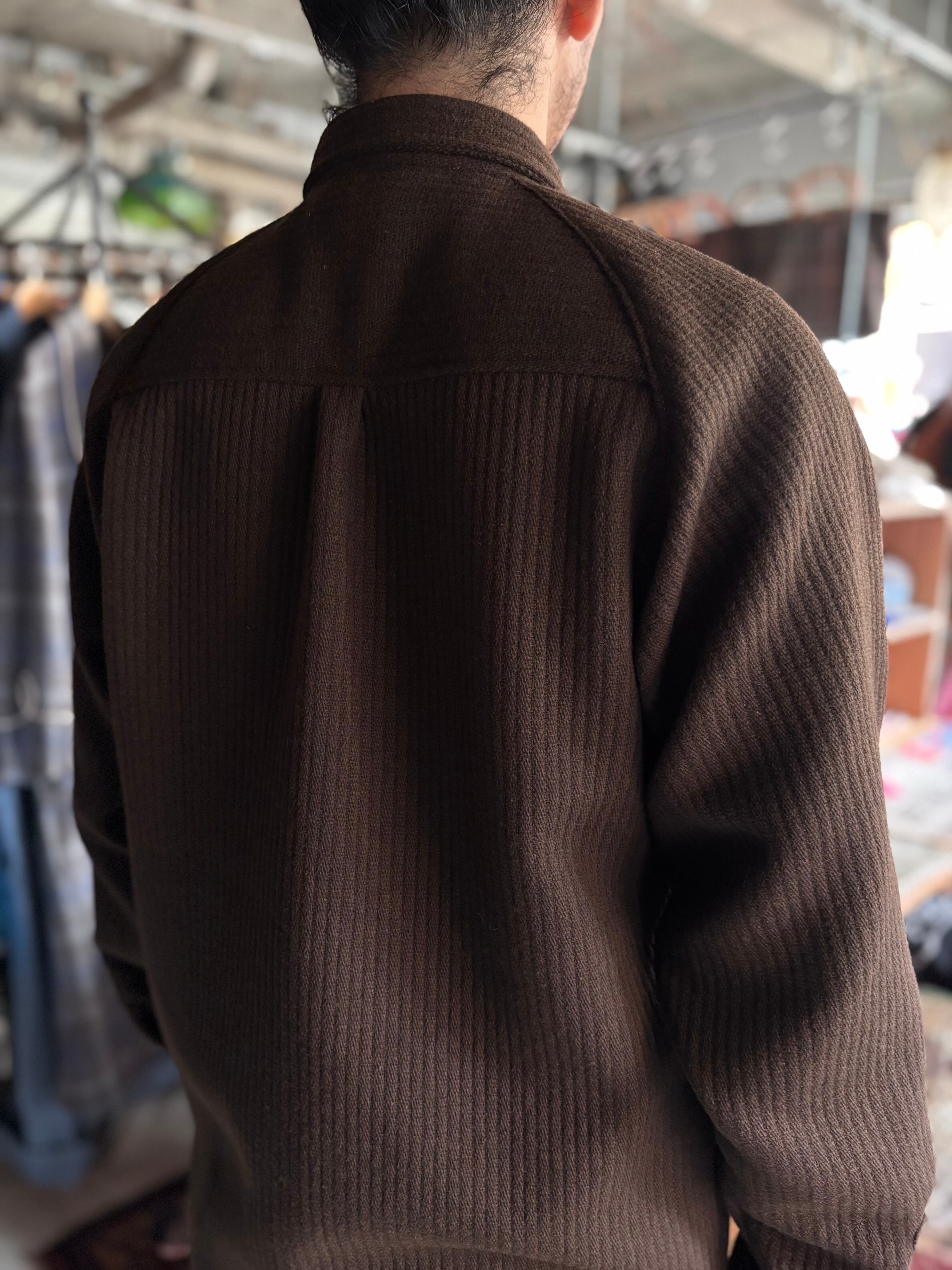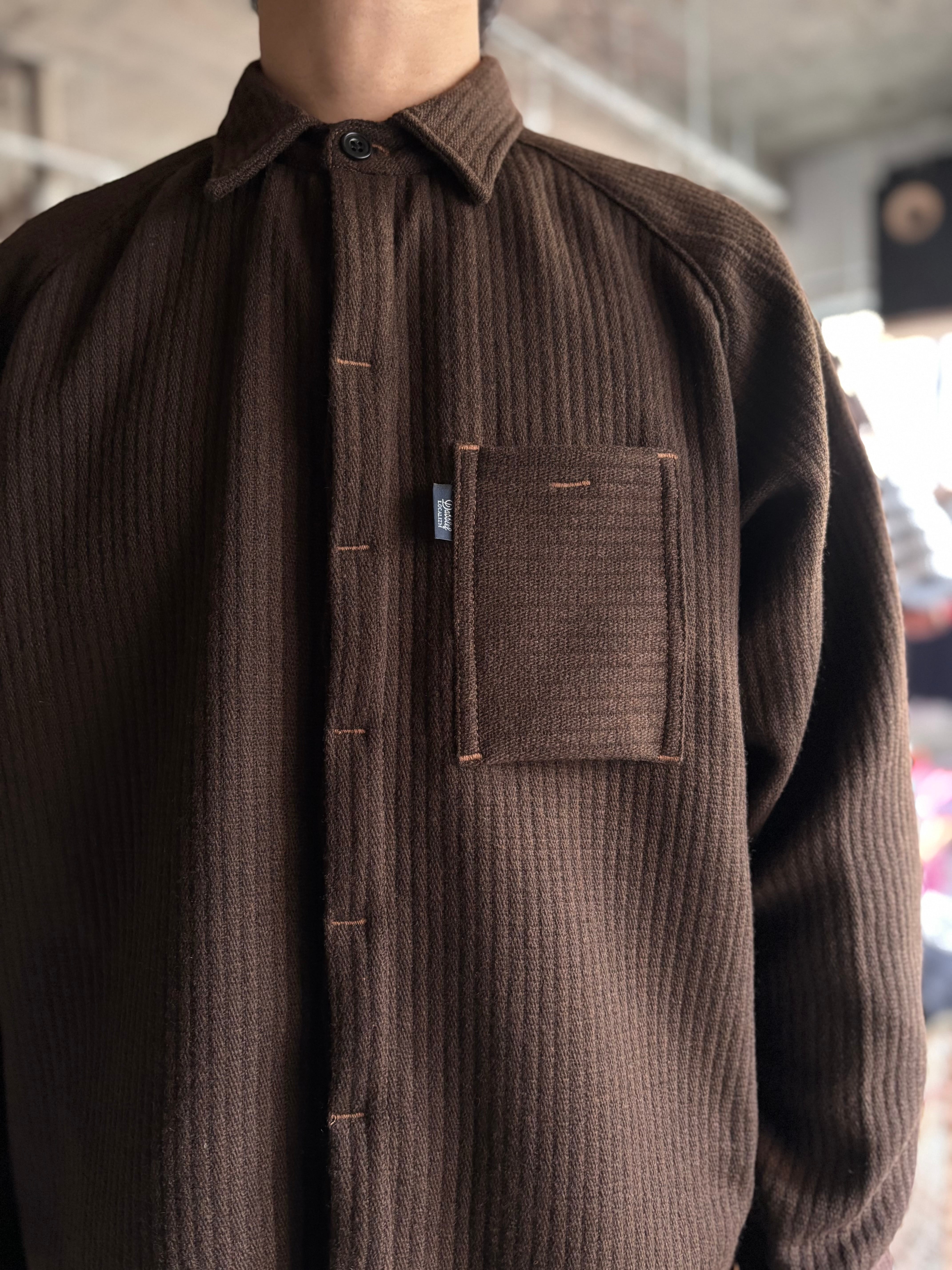 ドレッシーな比翼仕立てと、スポーティなラグランスリーブを組み合わせたデザイン。空気を含んだようなボリューム感と、コーデュロイのような縦畝が特徴的なウールツイード素材。ビンテージライクなポケット形状に、抜け感のある佇まいが映えるシャツです。フロントを開けても閉めてもコーディネートが綺麗にまとまります。