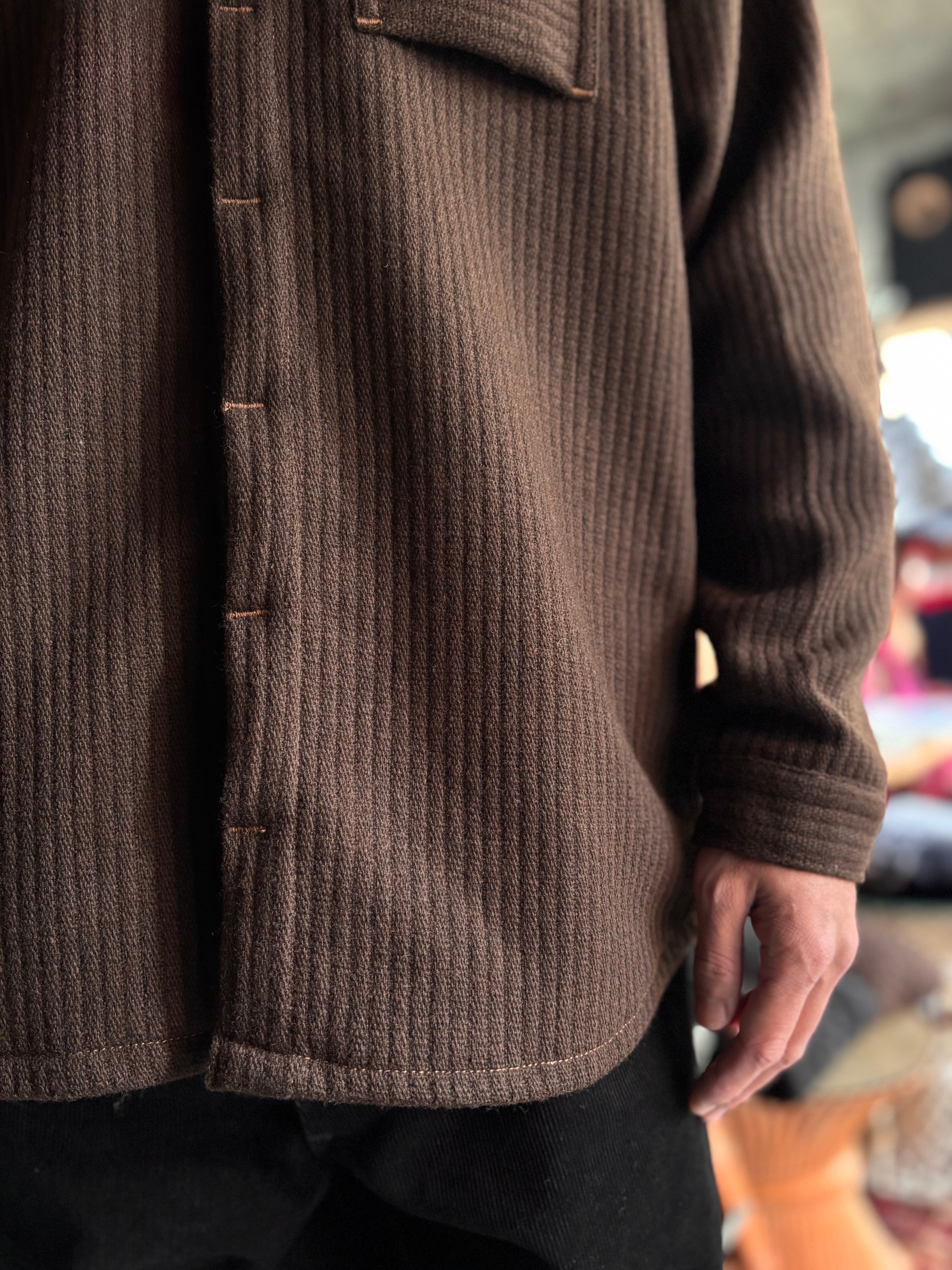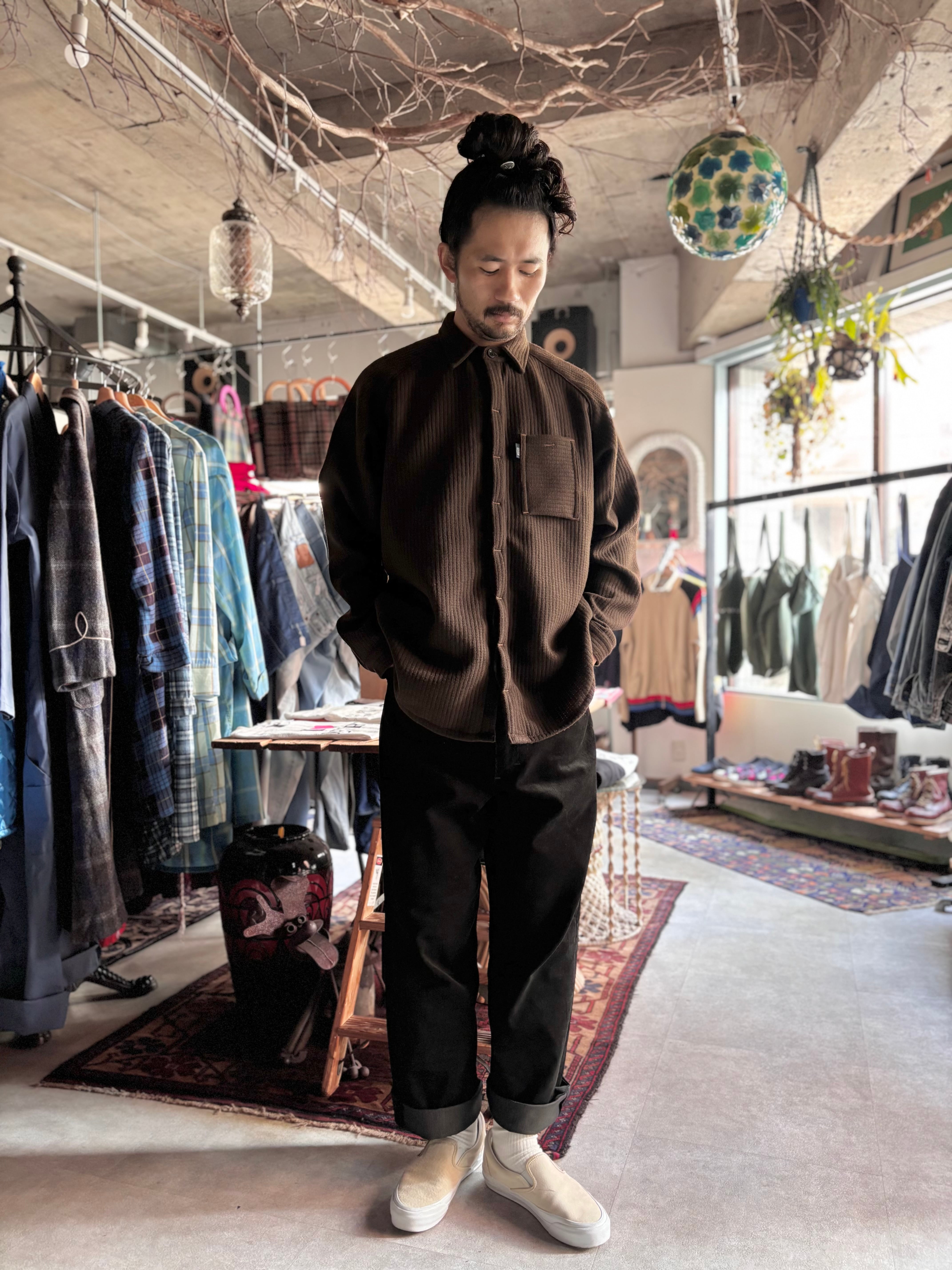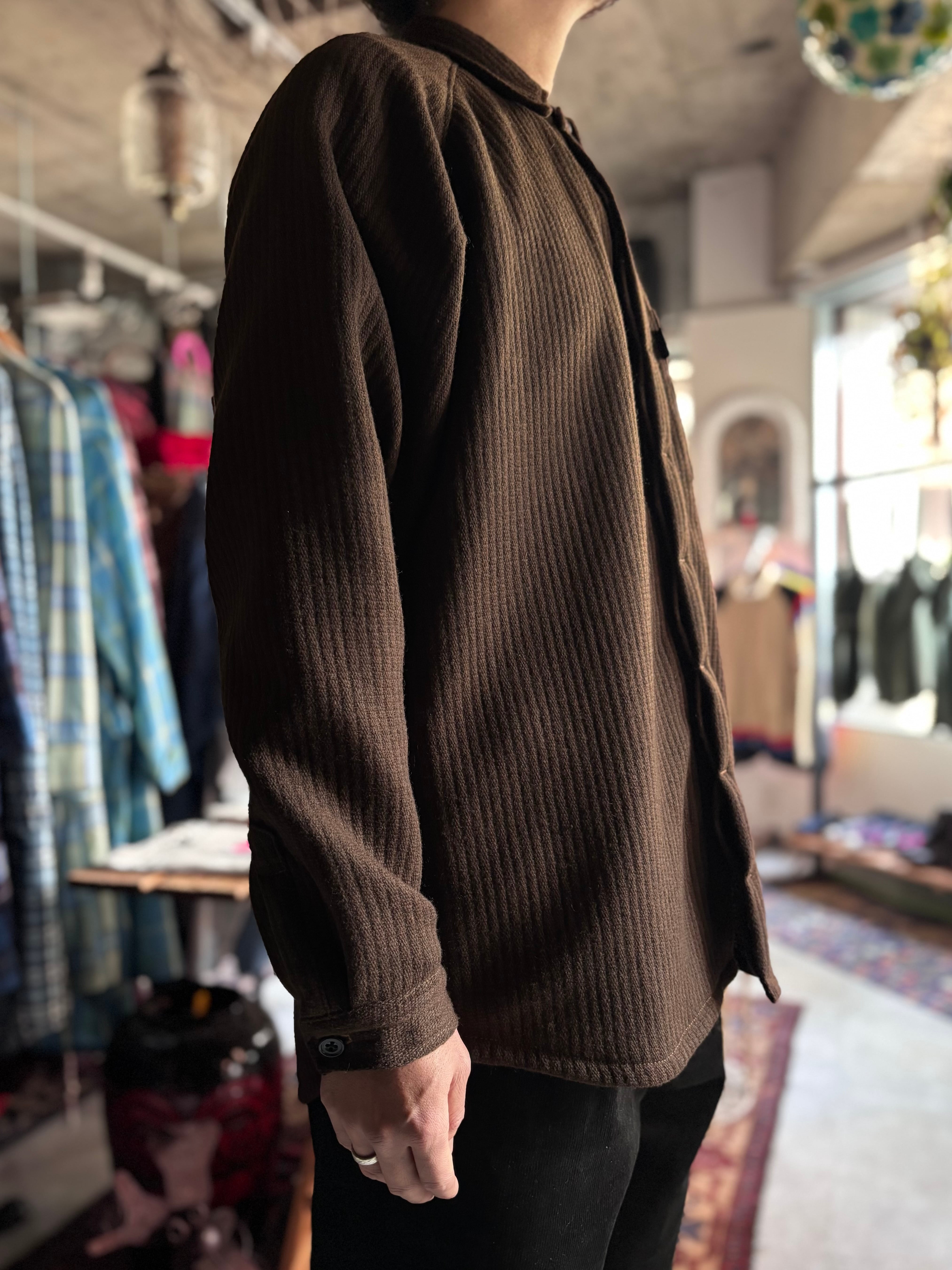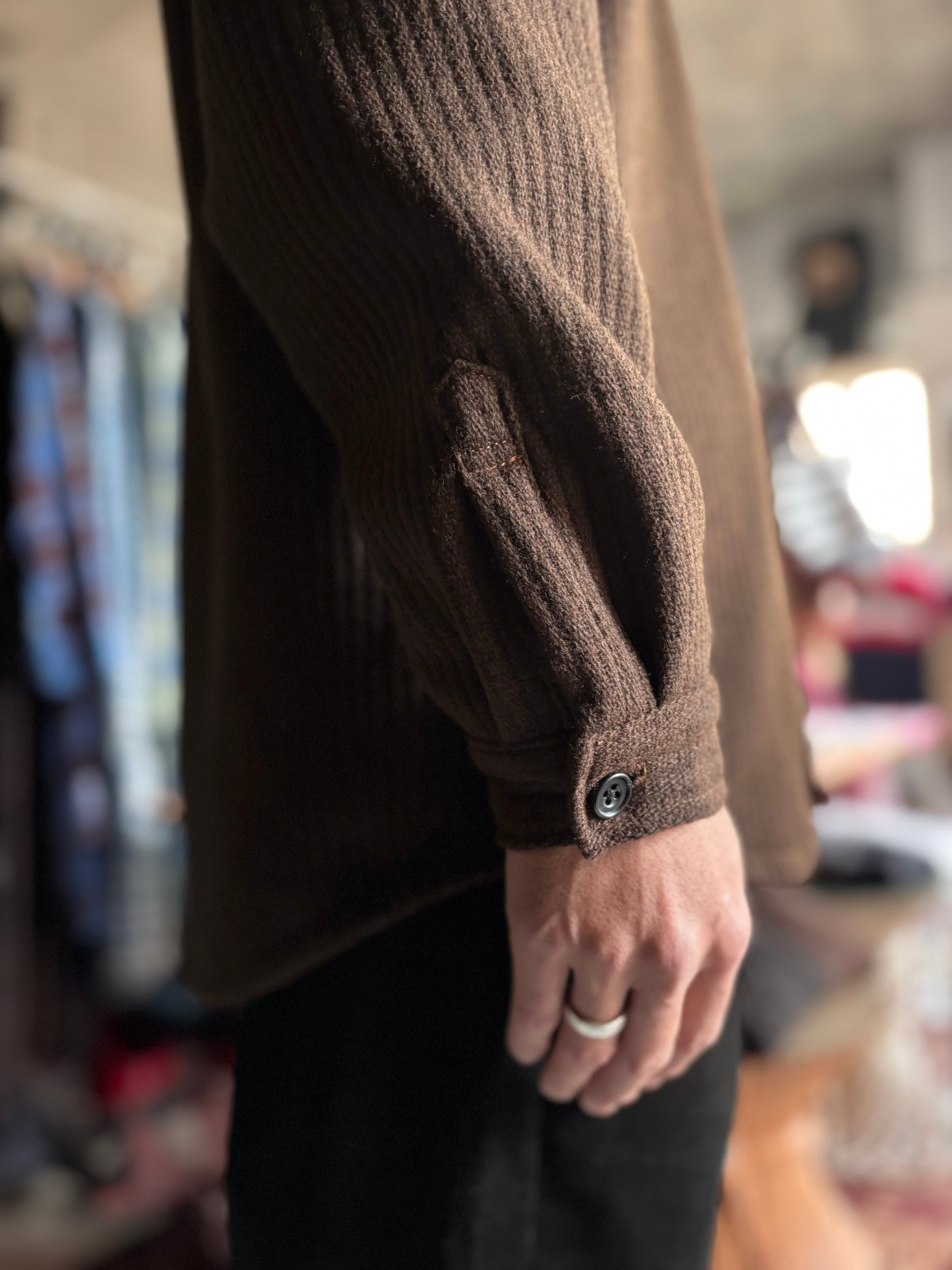 ドレッシーな比翼仕立てと、スポーティなラグランスリーブを組み合わせたデザイン。空気を含んだようなボリューム感と、コーデュロイのような縦畝が特徴的なウールツイード素材。ビンテージライクなポケット形状に、抜け感のある佇まいが映えるシャツです。フロントを開けても閉めてもコーディネートが綺麗にまとまります。
