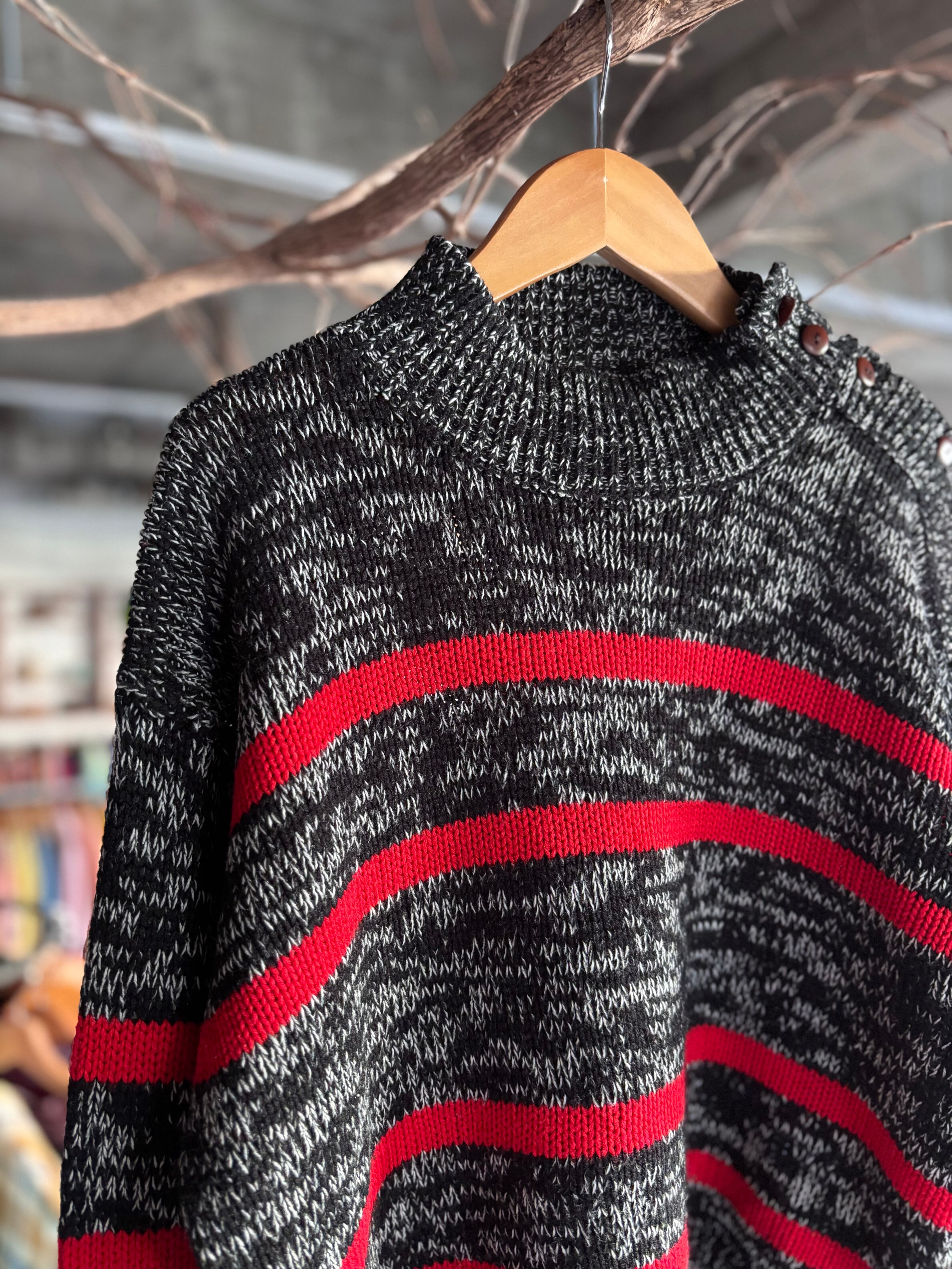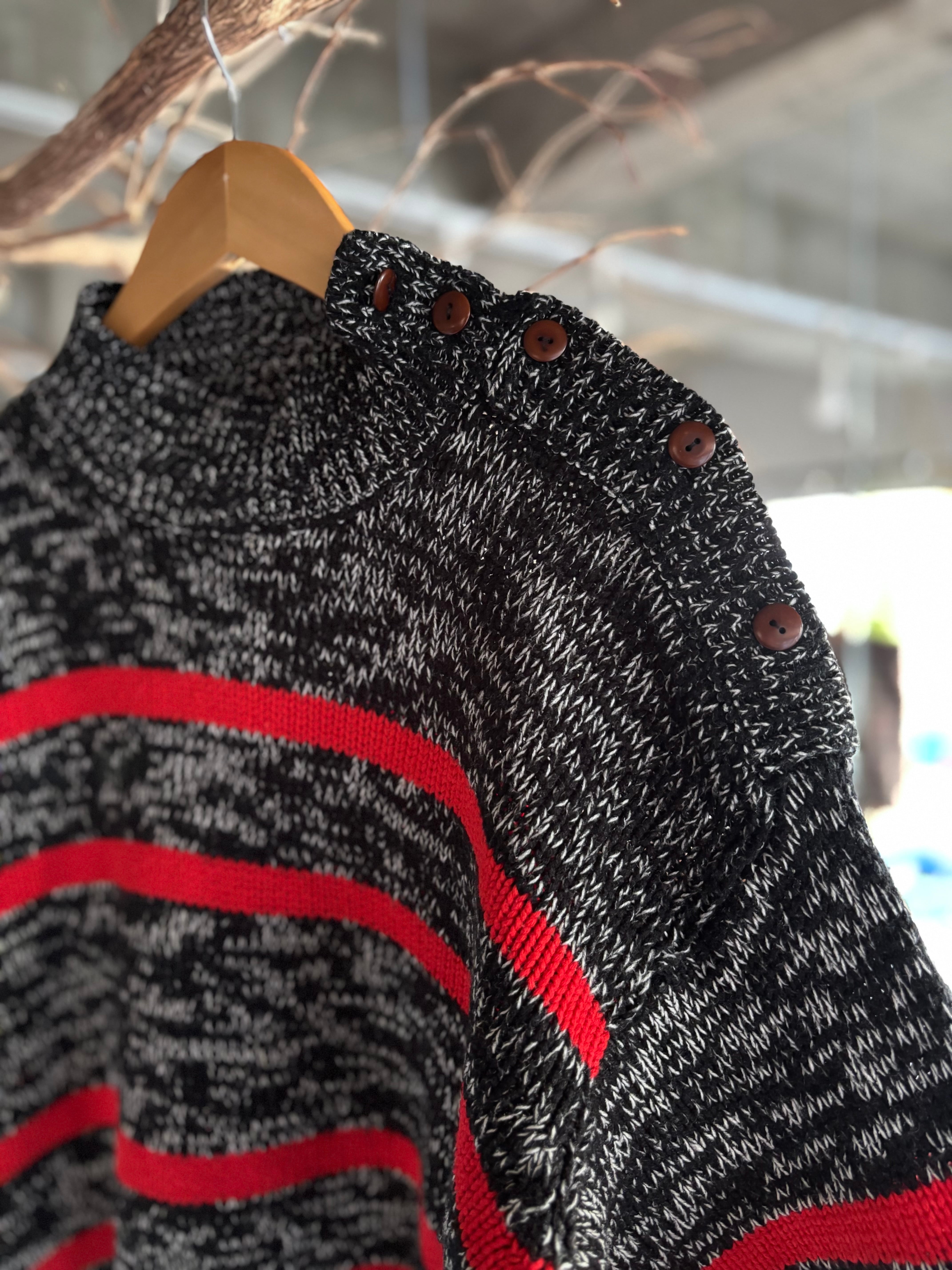 軽めの着心地のアクリルニット。程よくゆとりのある身幅に、レディライクな印象の短丈。ハイネック仕様。左肩にボタンが付くデザイン(飾りボタンでなく開閉可能です)も可愛いです。