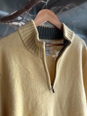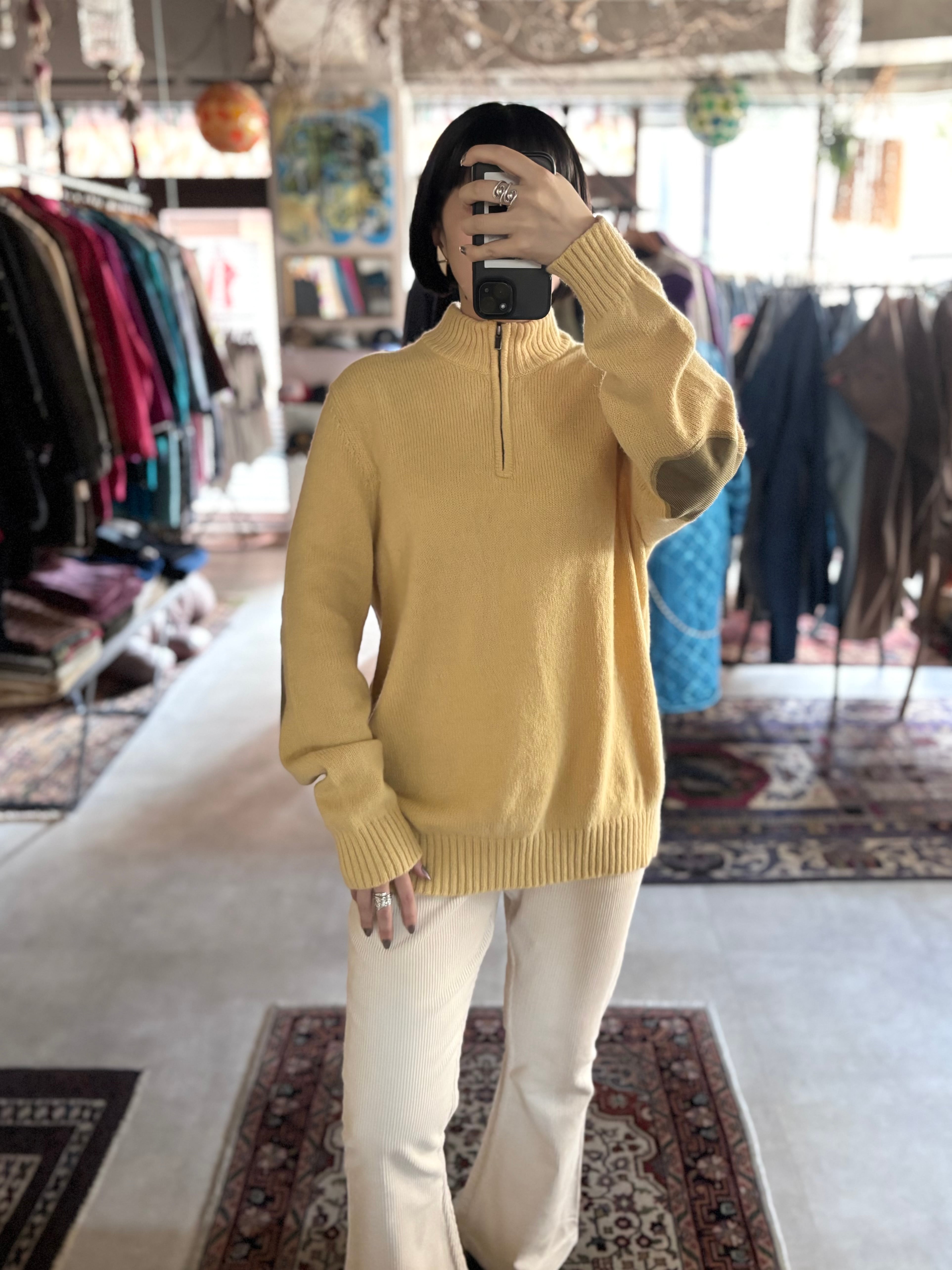 しっかり暖かいシェットランドウール生地のハーフジップニット。リラックスフィット。やわらかい印象のペールイエロー。かわいいエルボーパッチ付き。インナーにも映える優秀カラーニットです◎