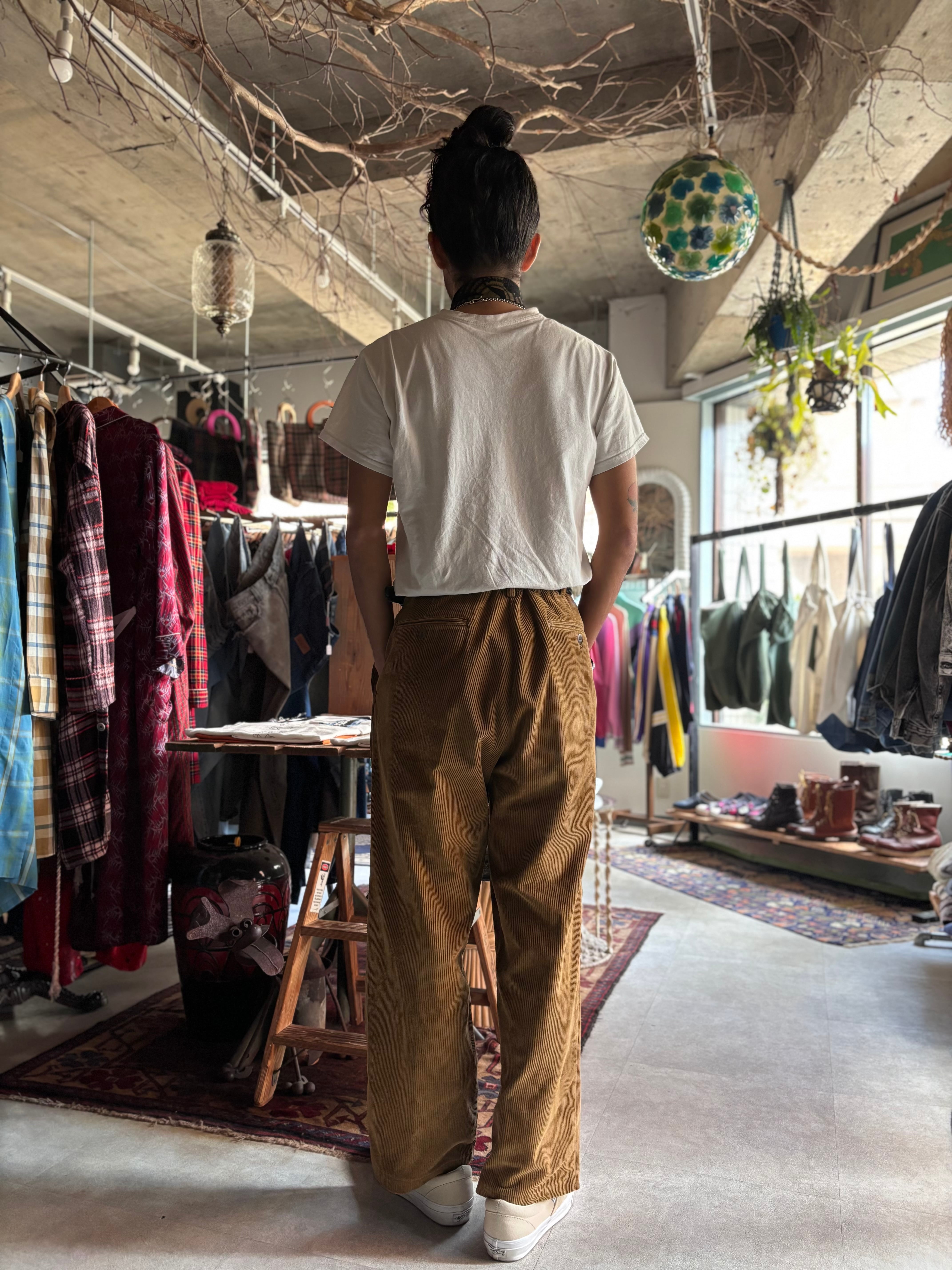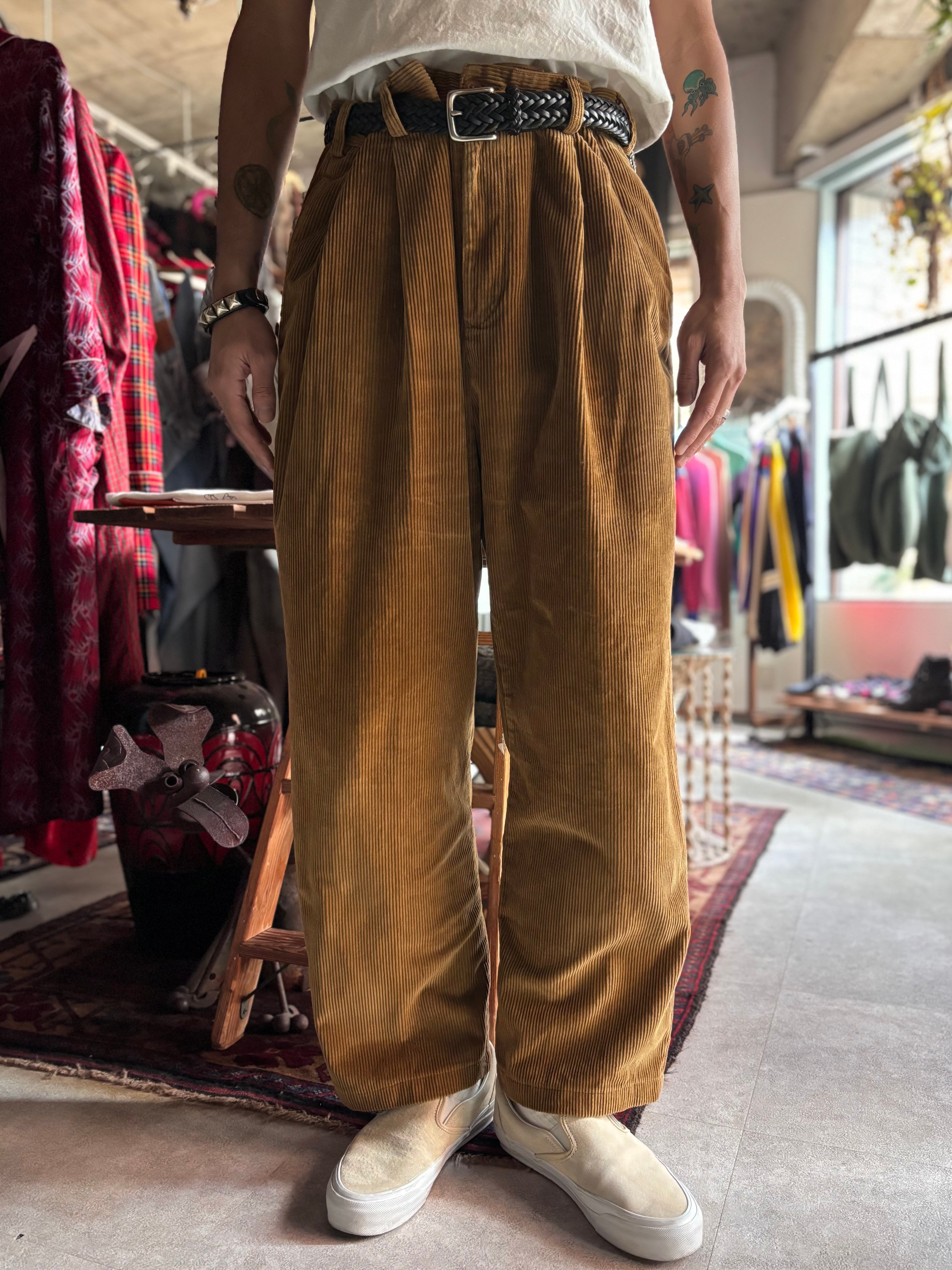 キャメルベージュの太軸コーデュロイ。2タックのリラックスストレート。
