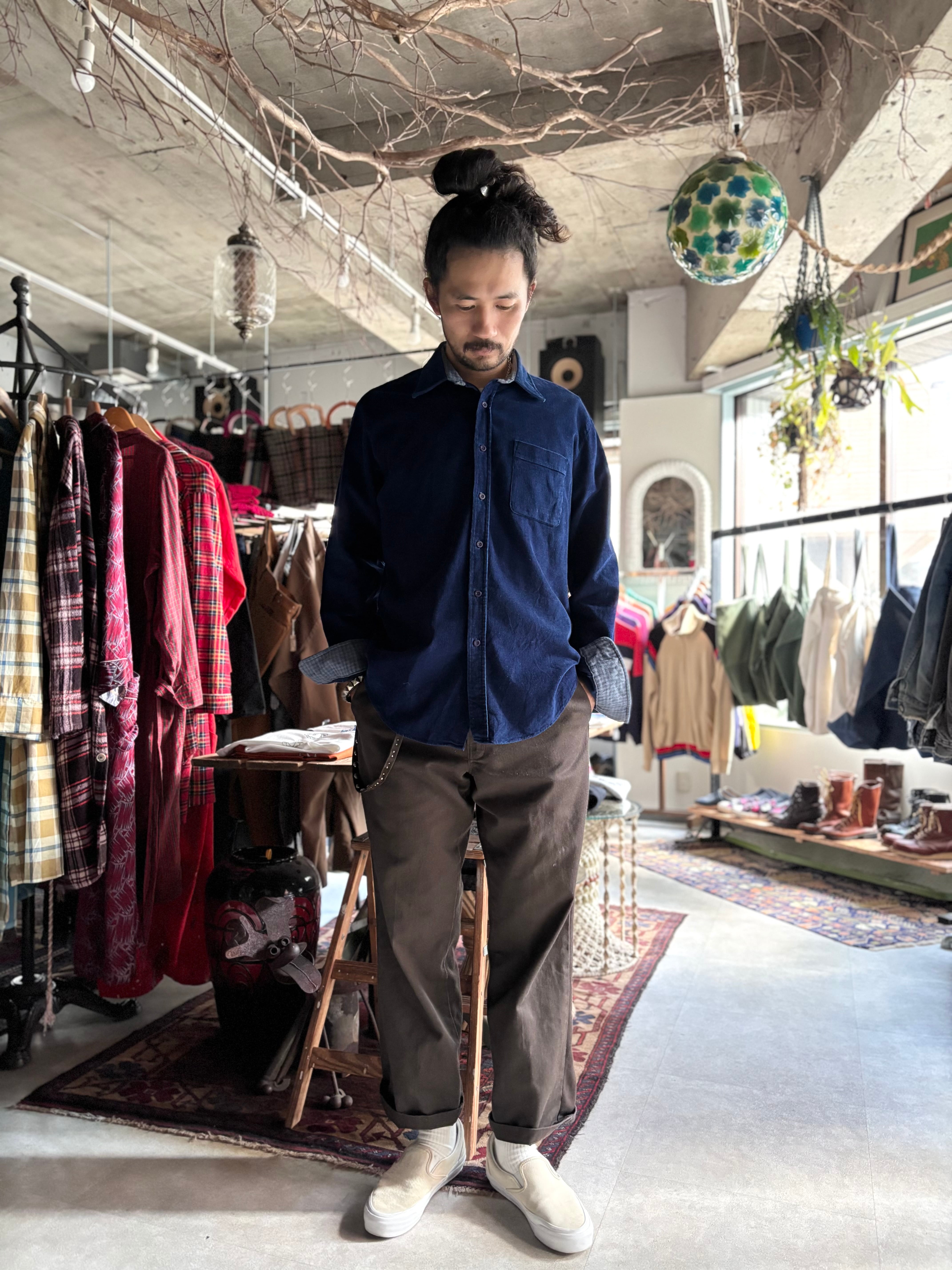 細軸のコーデュロイ素材。オーセンティックフィット。ロイヤルブルーに内側に貼られたネル生地のバランスが絶妙です。
