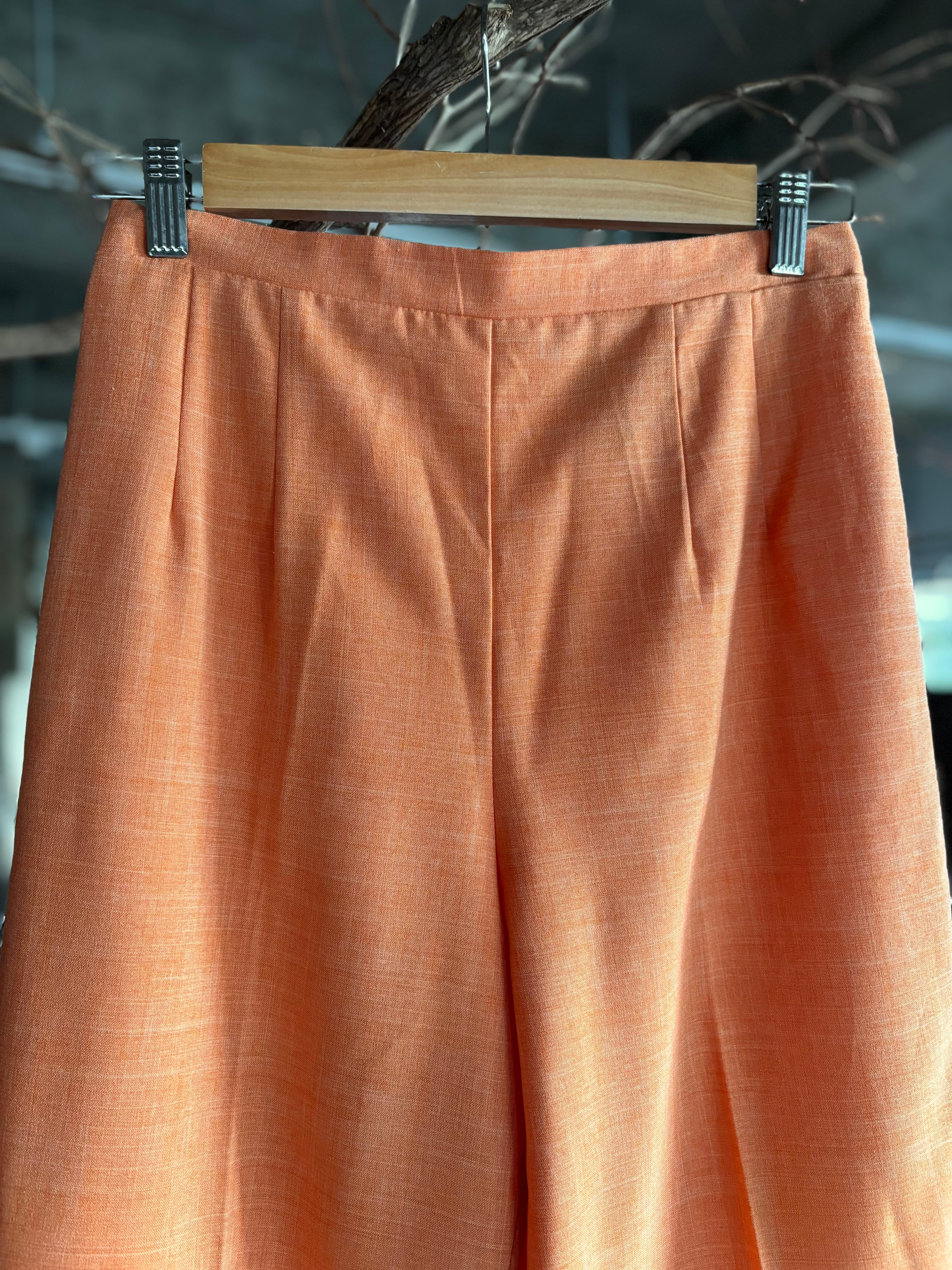 軽めの生地感のカラースラックス。やわらかい色味のオレンジ。ベルトループのつかないバックジップ・バックゴム仕様。タック入りのストレートシルエット。明るい色味ながら主張し過ぎない上品なトーンでコーデの差し色におすすめです。