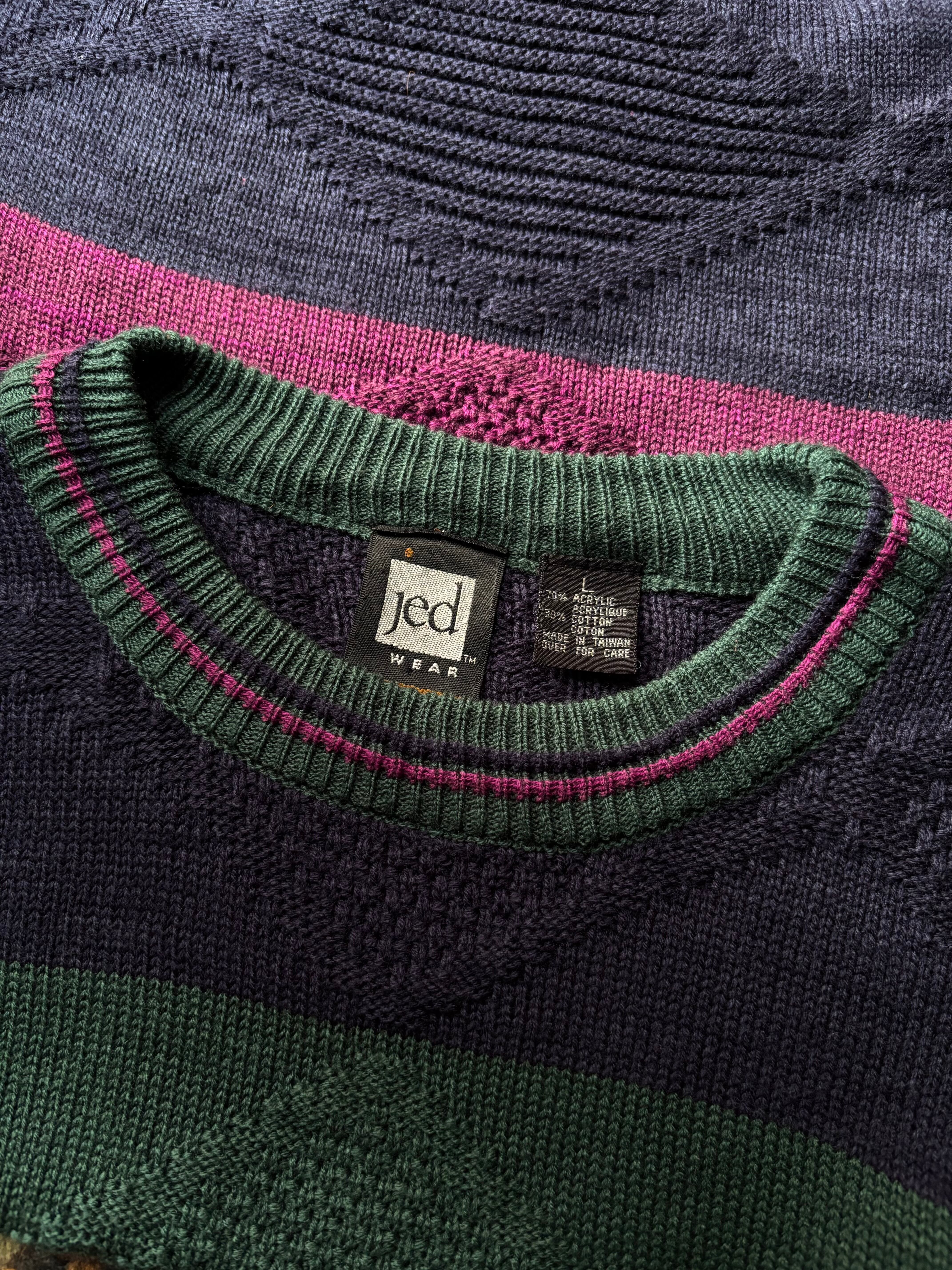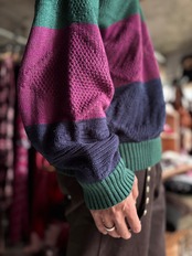 中厚のアクリルコットン素材。リラックスフィット。ボーダーに合わせて入る編み模様がお洒落です。