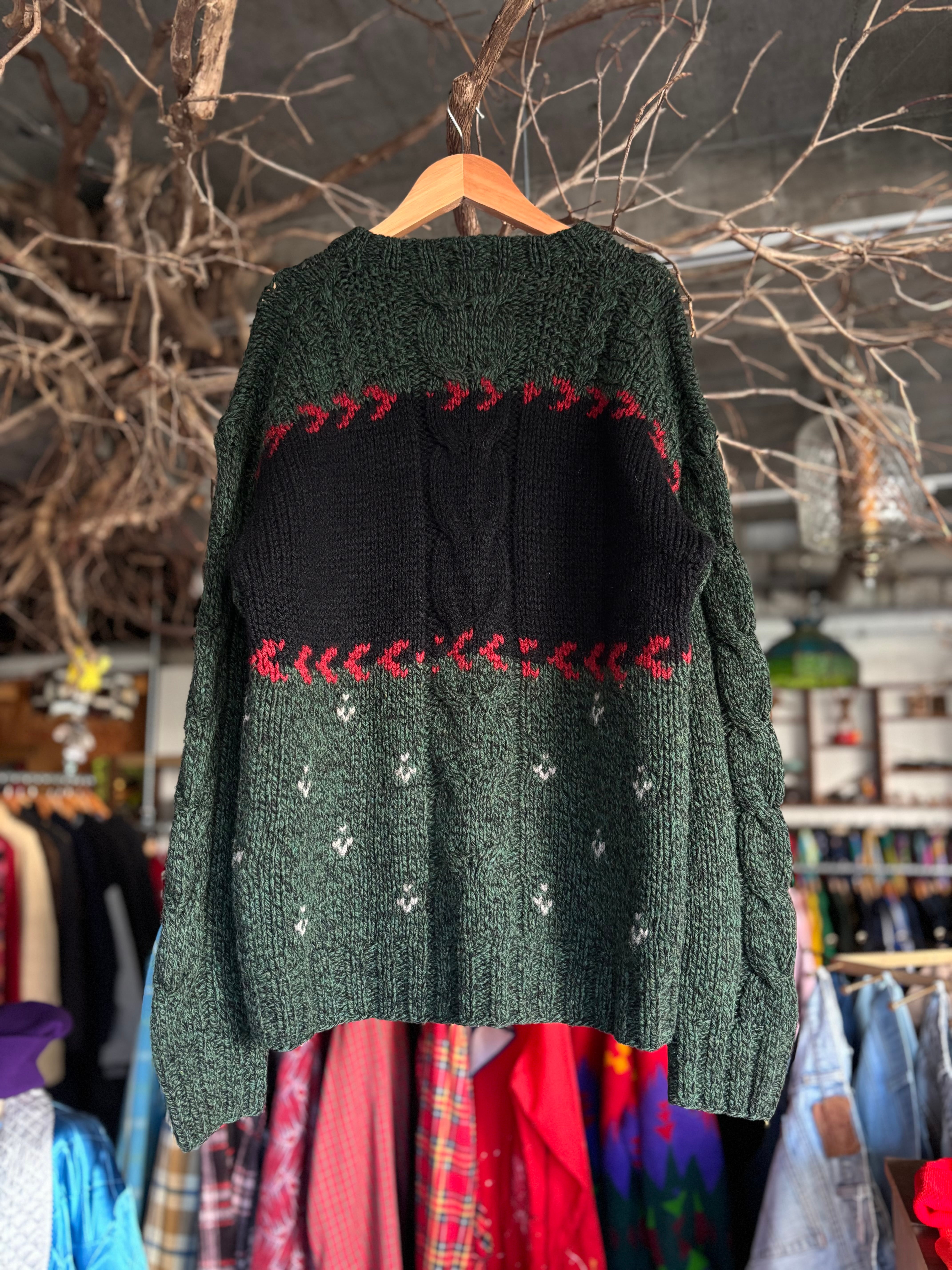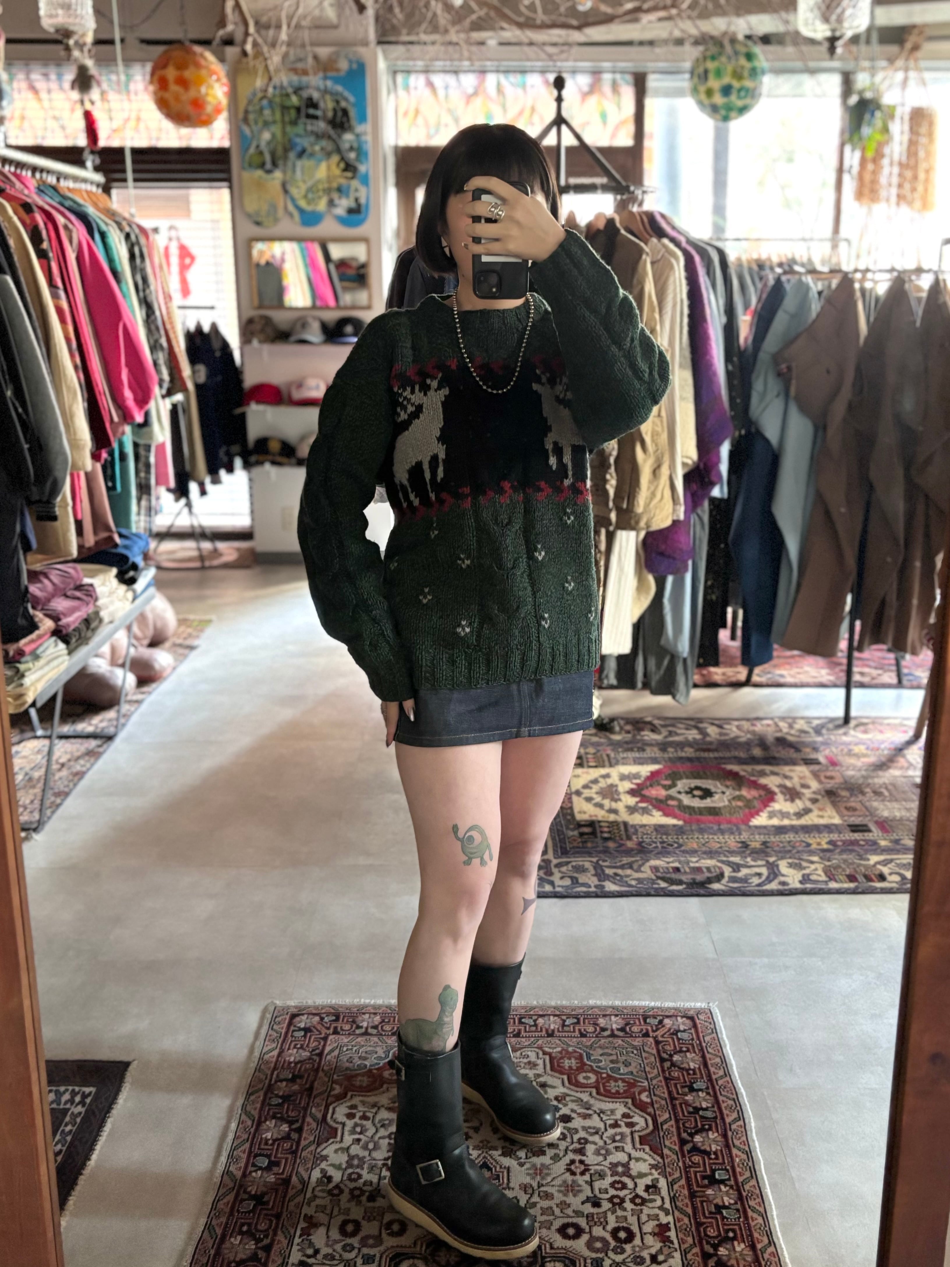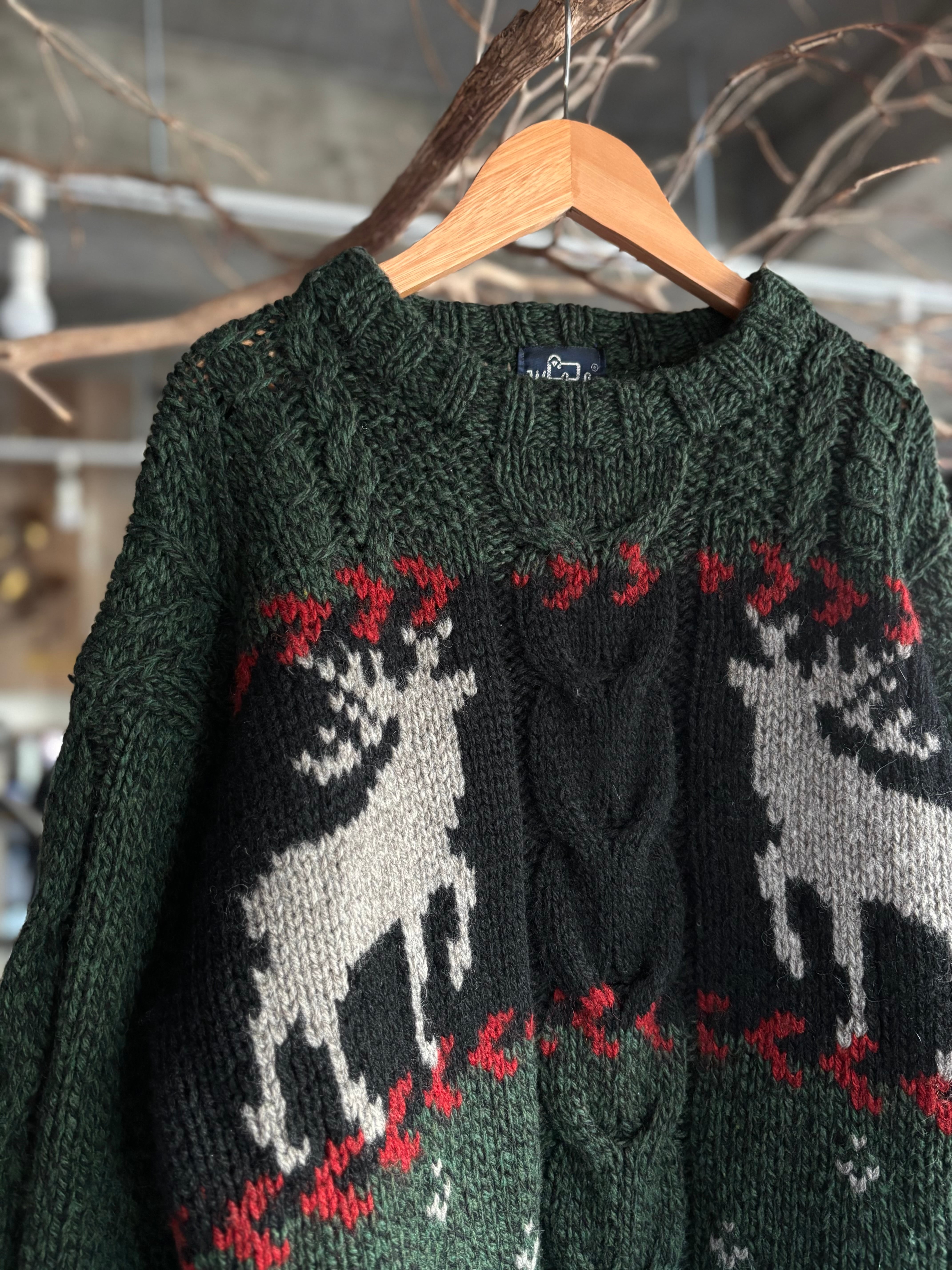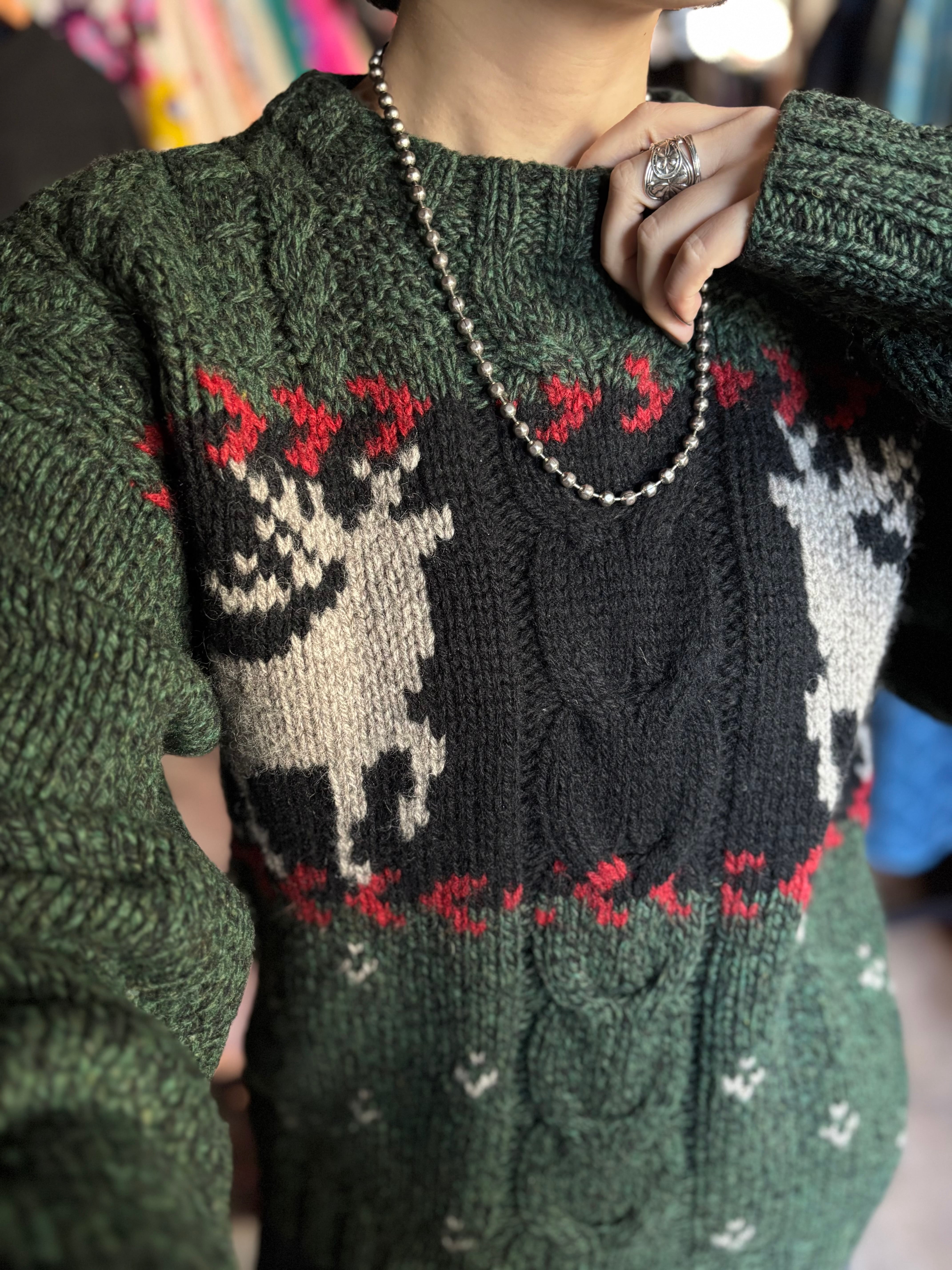 ウール×ナイロン混紡素材。オーセンティックフィット。深いグリーンベースにトナカイの編み柄。