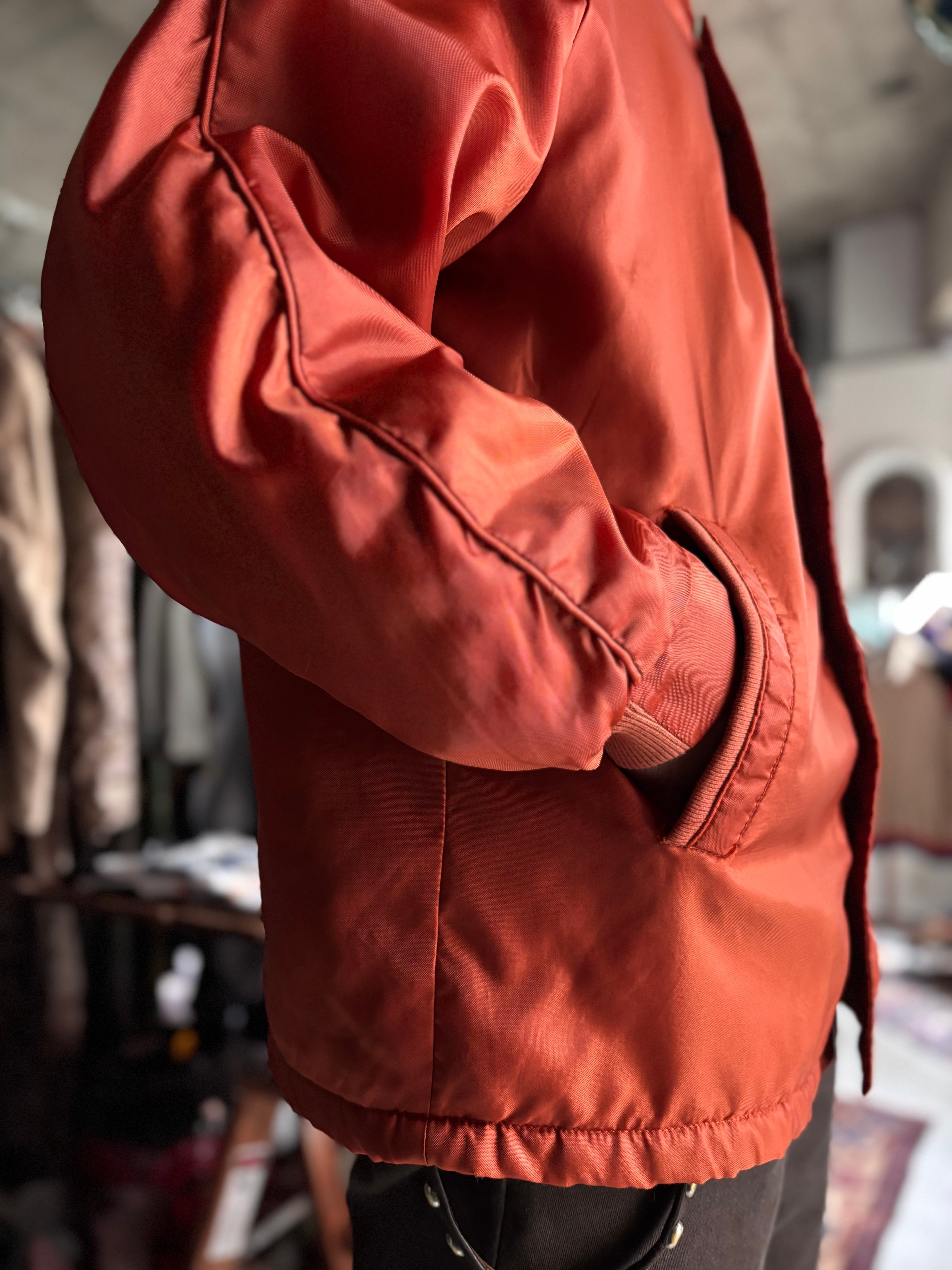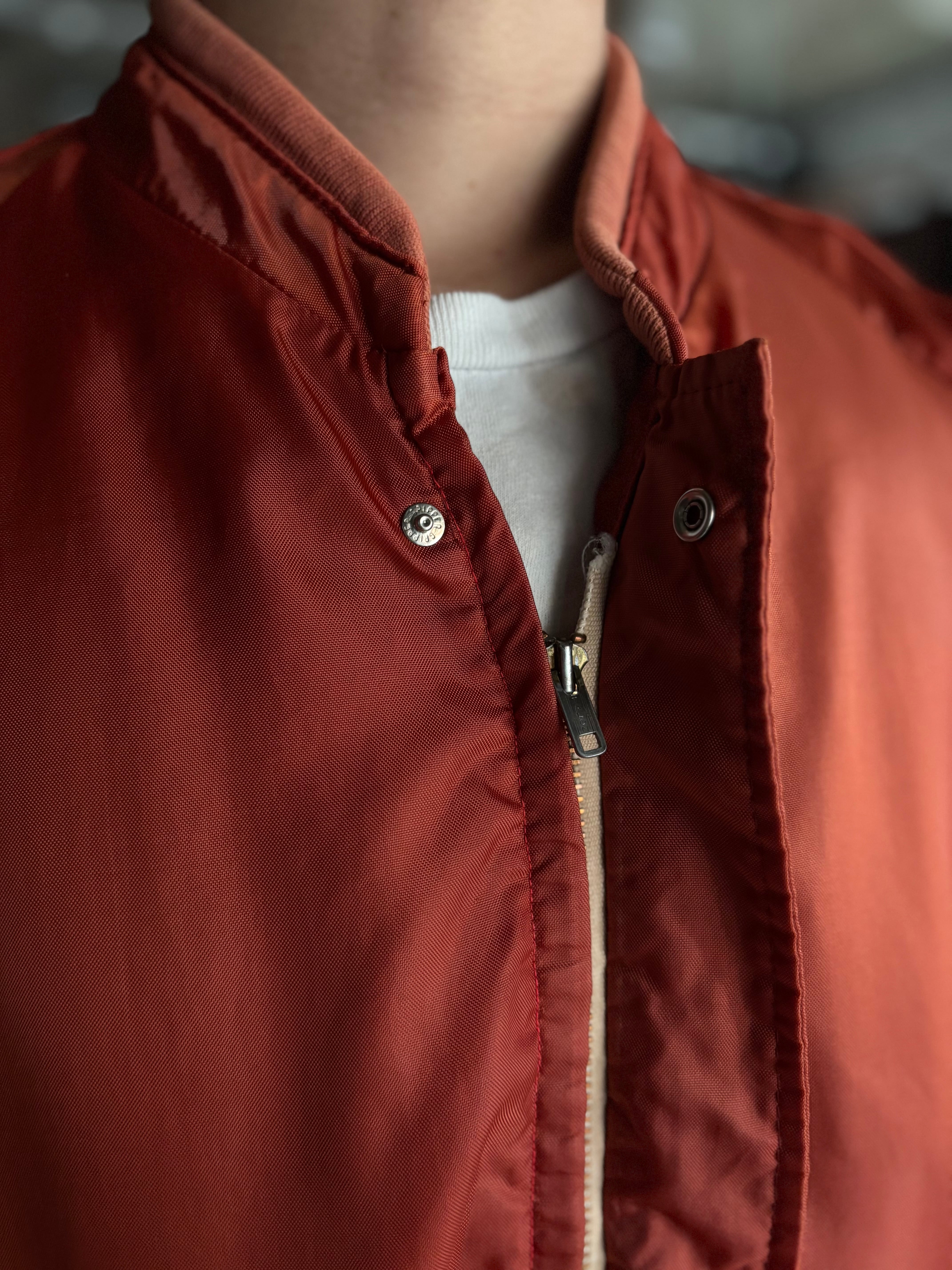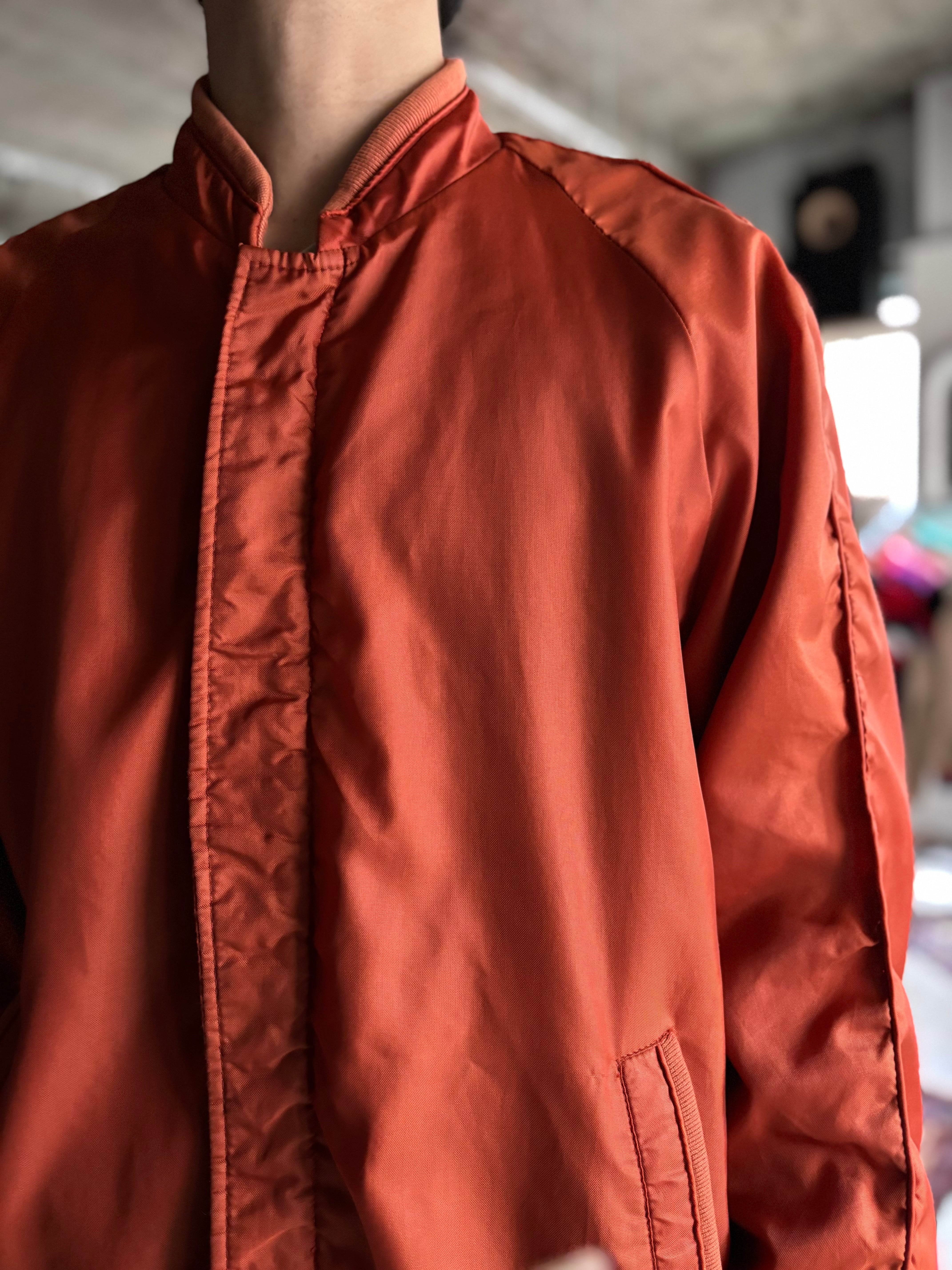 ナイロン素材に、内側はファーライナー仕様。オーセンティックフィット。スタンドカラー、リブ、ポケット口にリブが付いた珍しいデザイン。※古着らしい着用感のある一着です。ローテクなテイストが好きな方におすすめです。