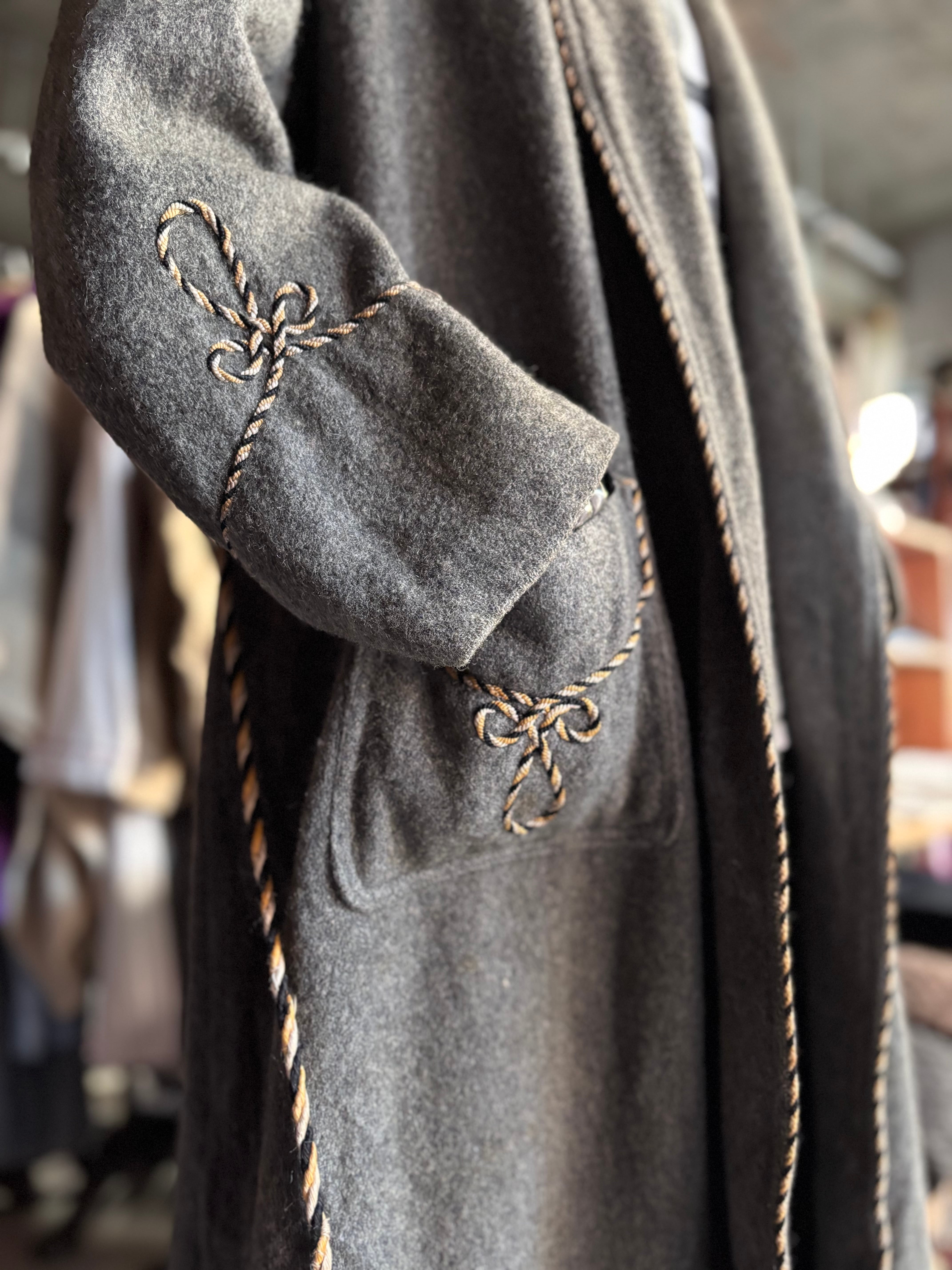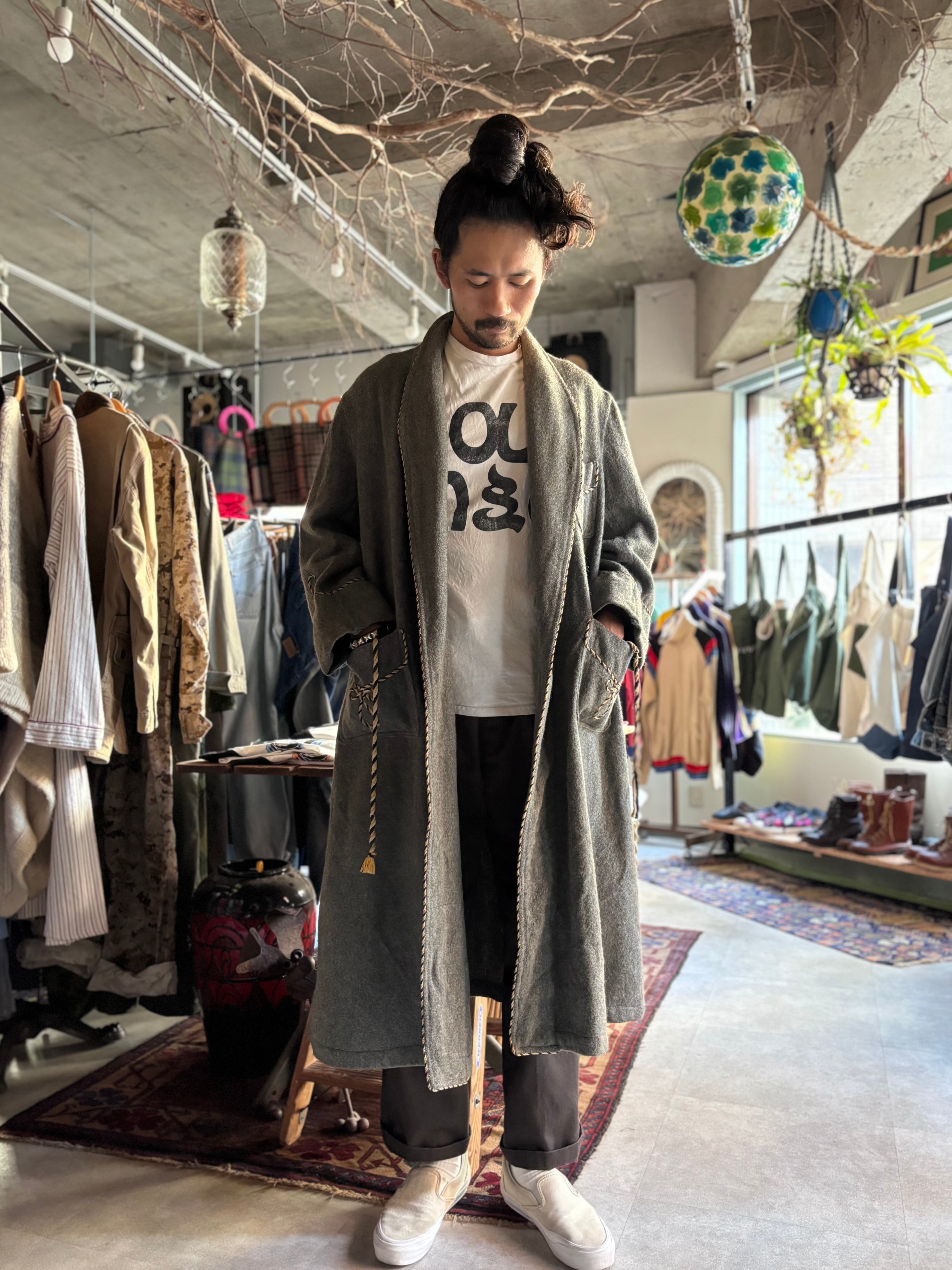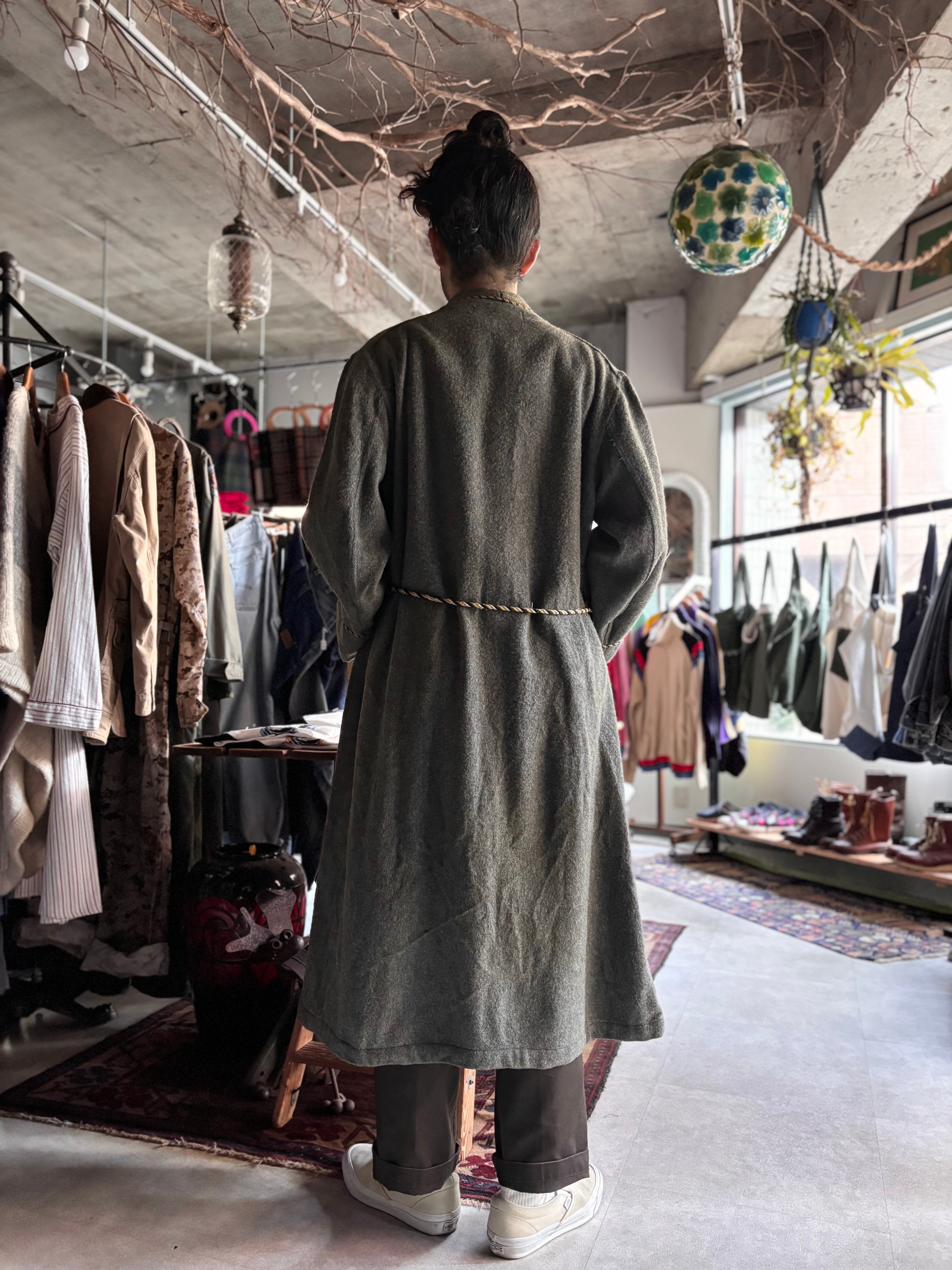 厚手のウール素材。リラックスフィット。背当て、袖口、ポケット裏にサテン生地が貼られた丁寧な仕立て。クラシカルなパイピングデザインに、オリジナルのベルト付き。OLDの雰囲気がありながら、シンプルにもコーディネートできる良品。ユニセックスでおすすめです。