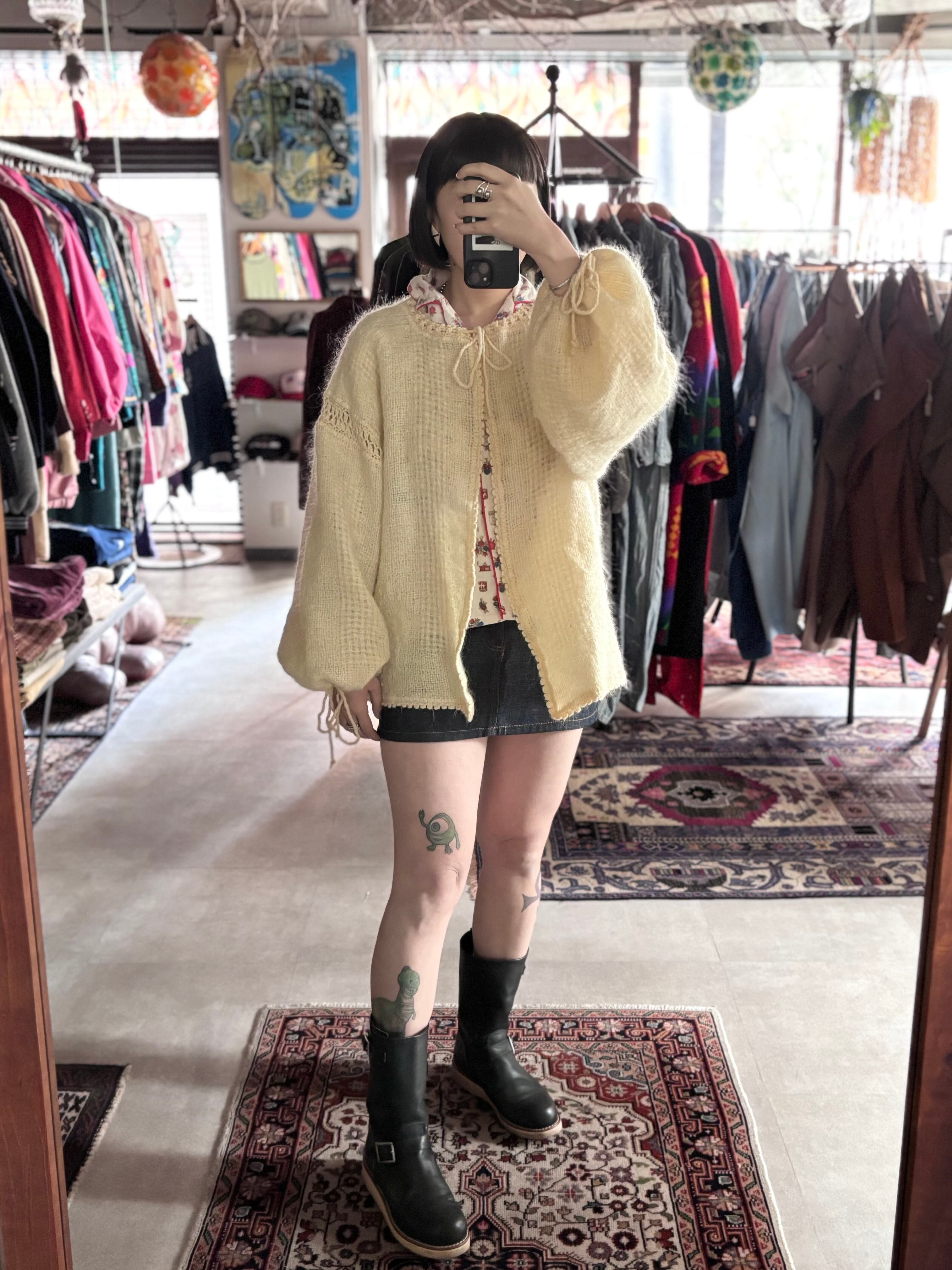 毛足の長いモヘア系ウール素材と推定。ルーズフィット。透かし編みや、縁取りなど丁寧な仕立て。ふんわりと軽く暖かい着用感です。