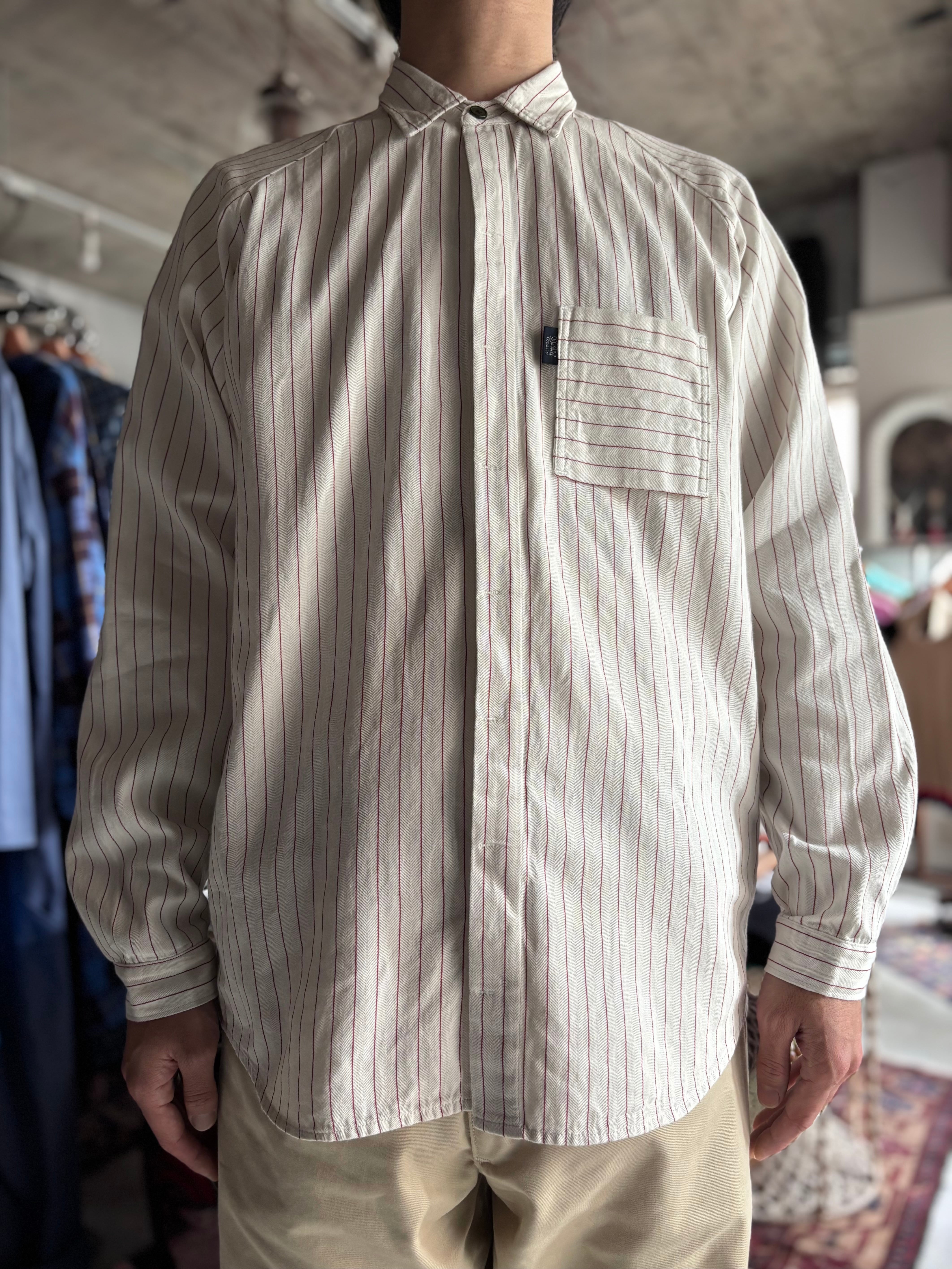 ドレッシーな比翼仕立てと、スポーティなラグランスリーブを組み合わせたデザイン。ワークウェアテイストのヘリンボーンツイル素材。ビンテージライクなポケット形状に、抜け感のある佇まいが映えるシャツです。フロントを開けても閉めてもコーディネートが綺麗にまとまります。