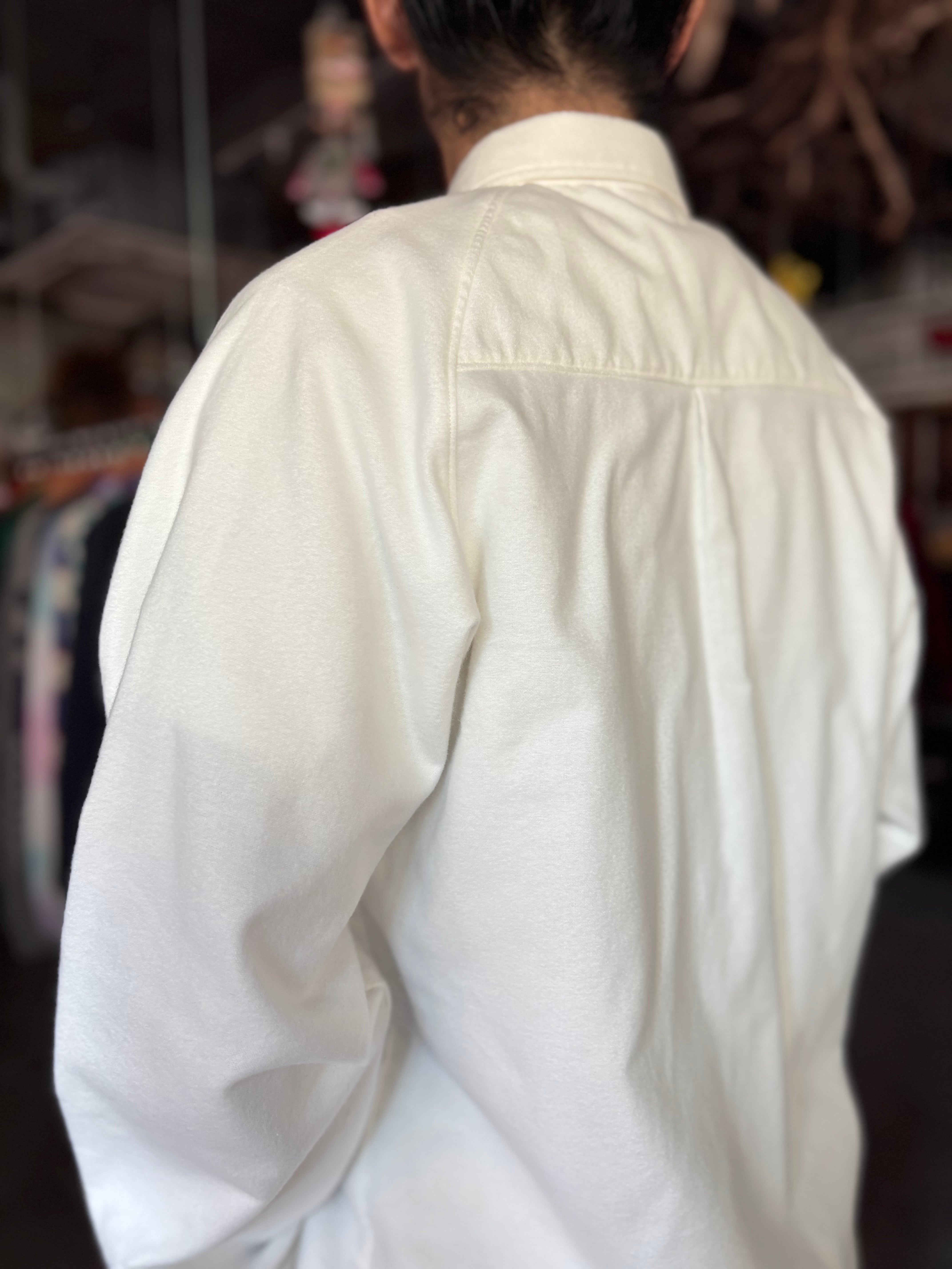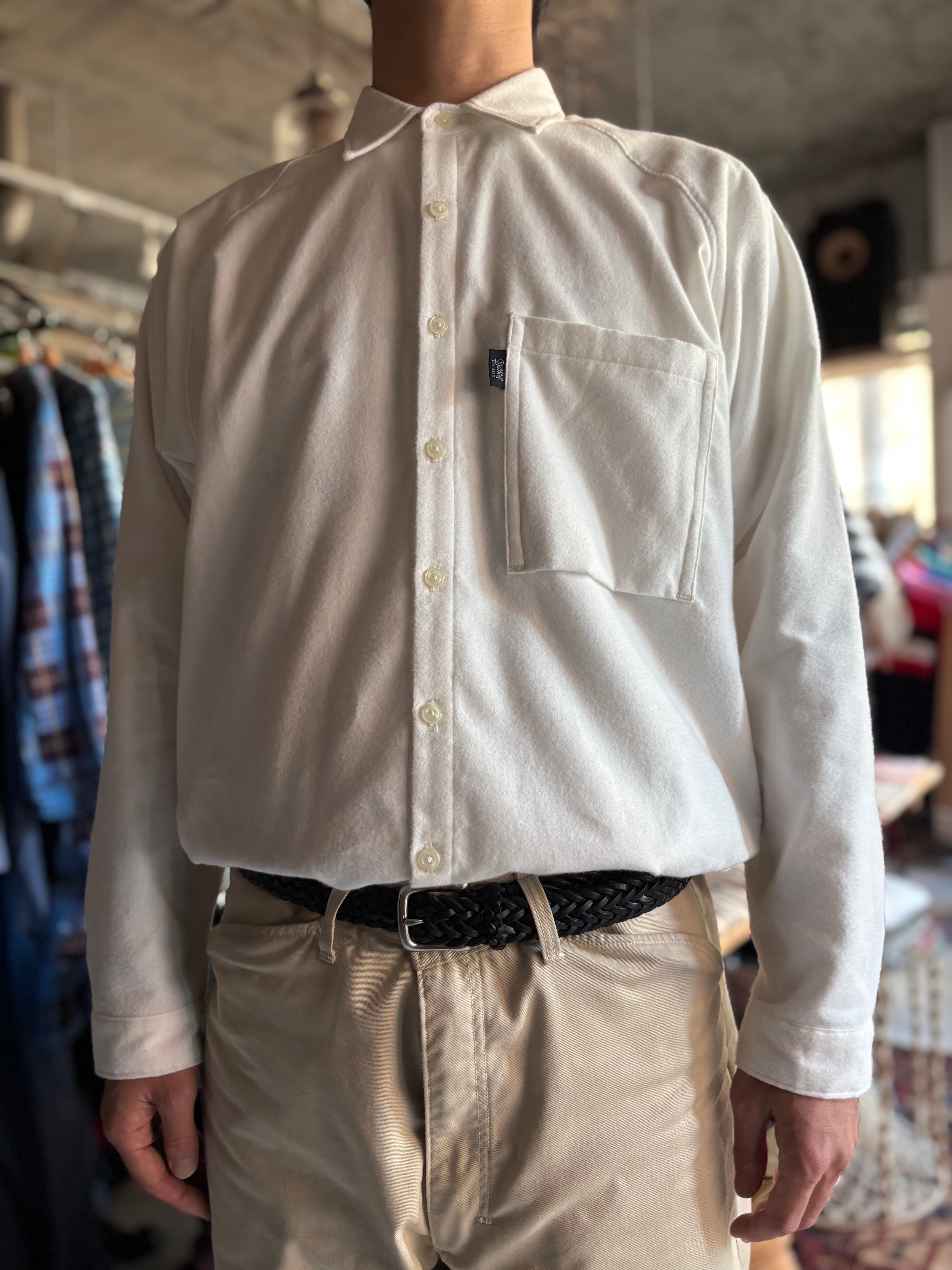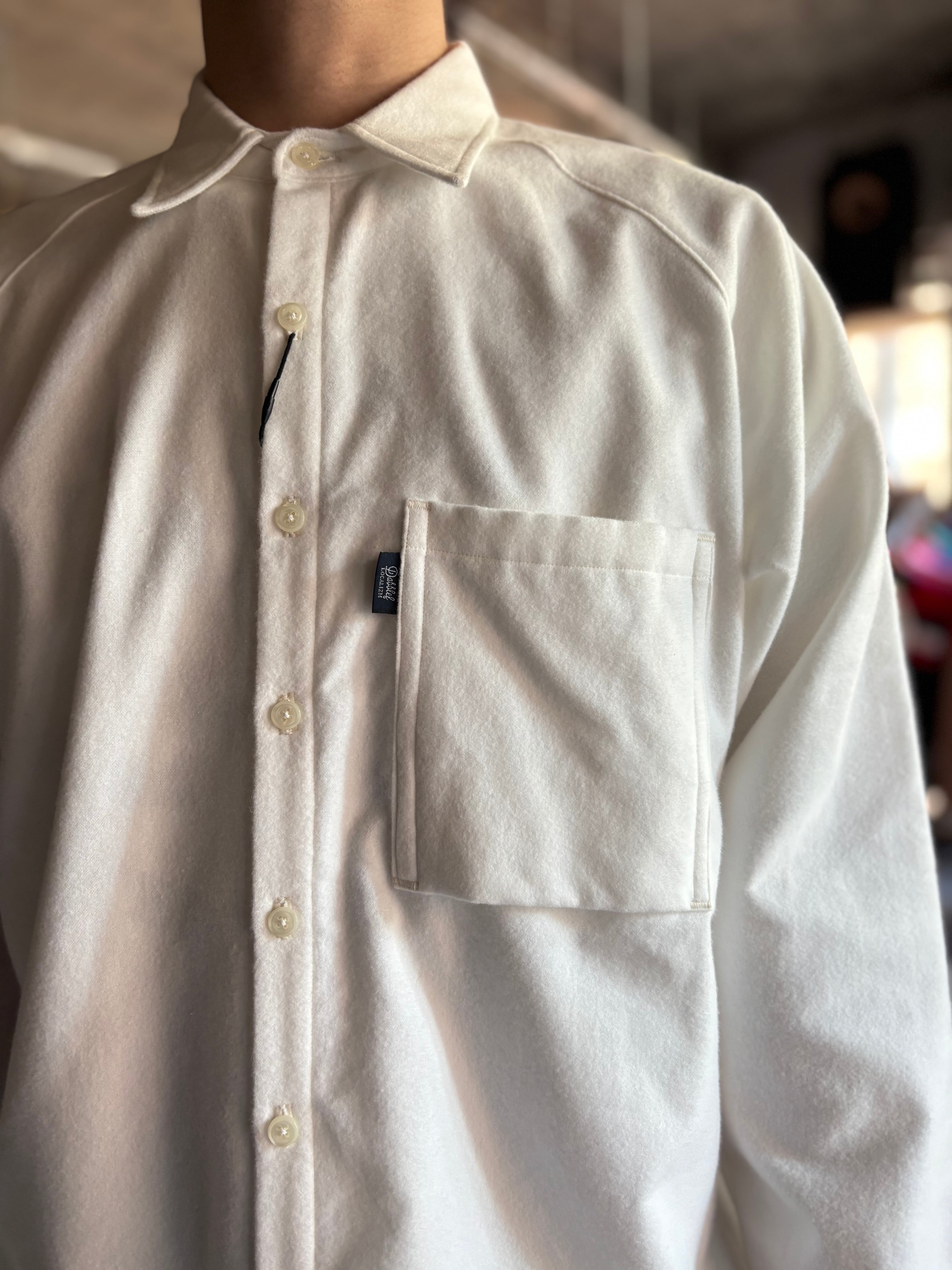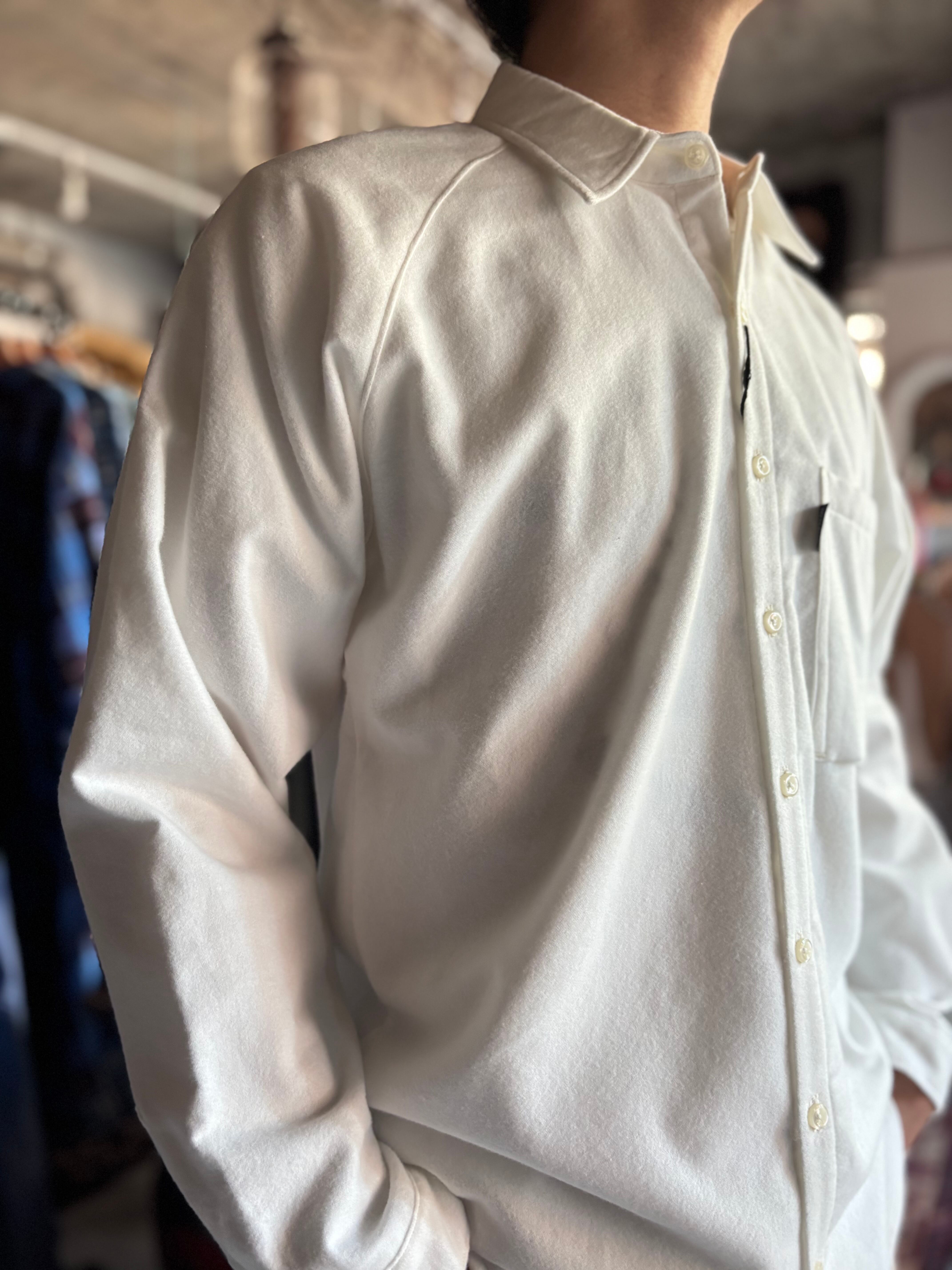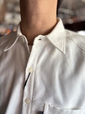 ドレッシーな比翼仕立てと、スポーティなラグランスリーブが特徴のUNCITYをインナーに特化した仕様に変更したもの。比翼から裏前たてに、胸ポケットを大ぶりにしたことで力の抜けた印象になりました。柔らかく肌あたりの良いフランネル素材です。