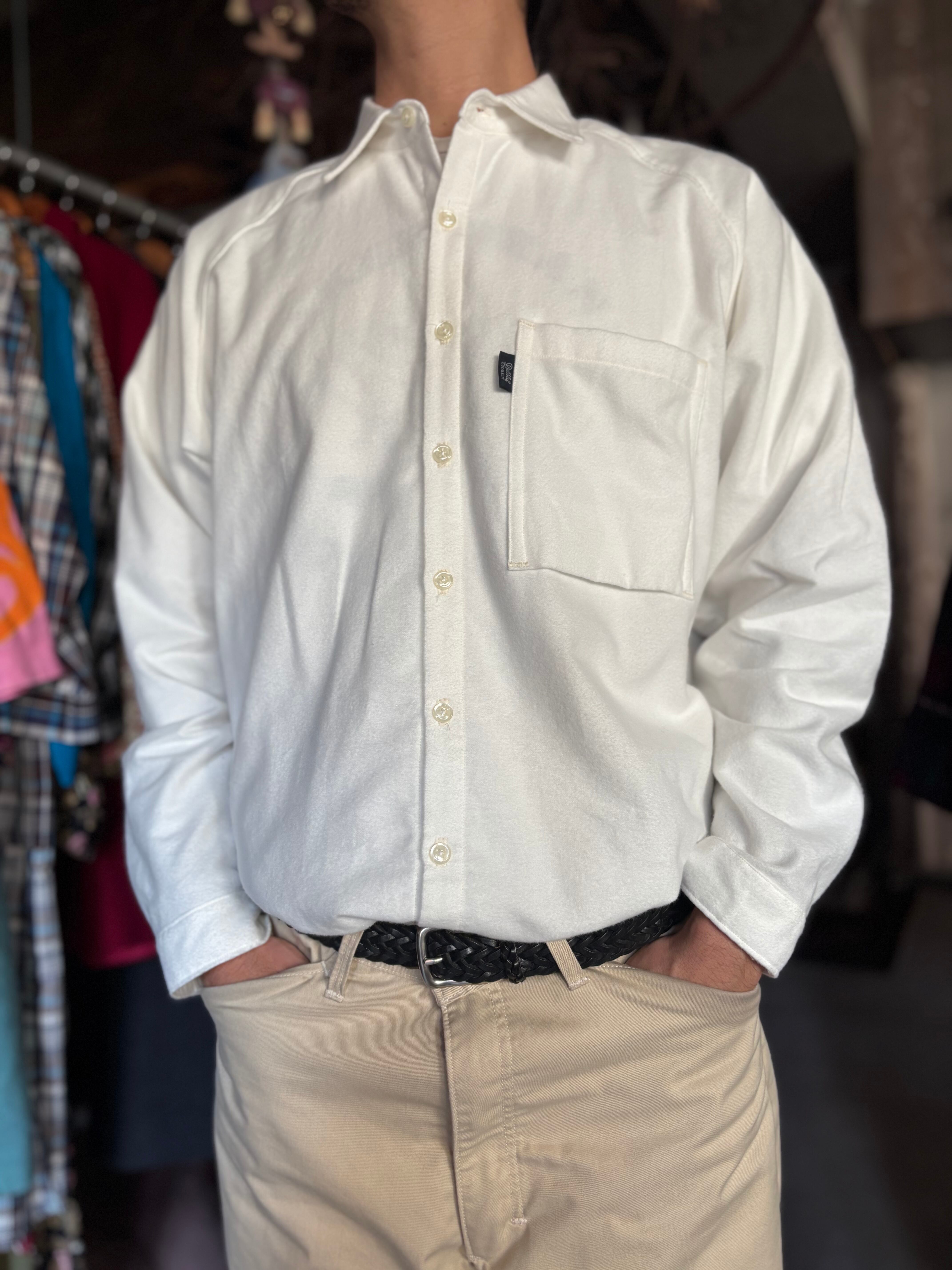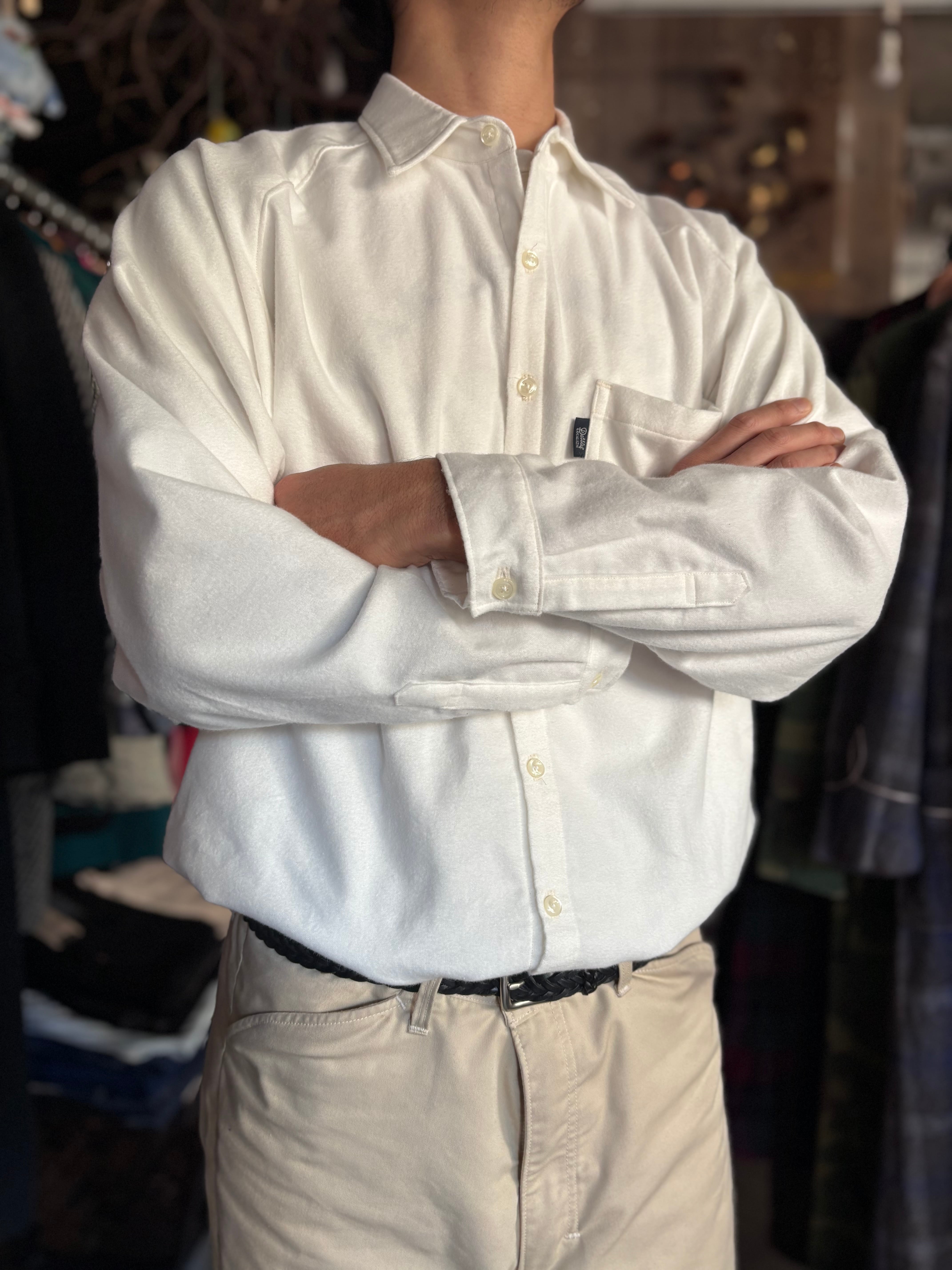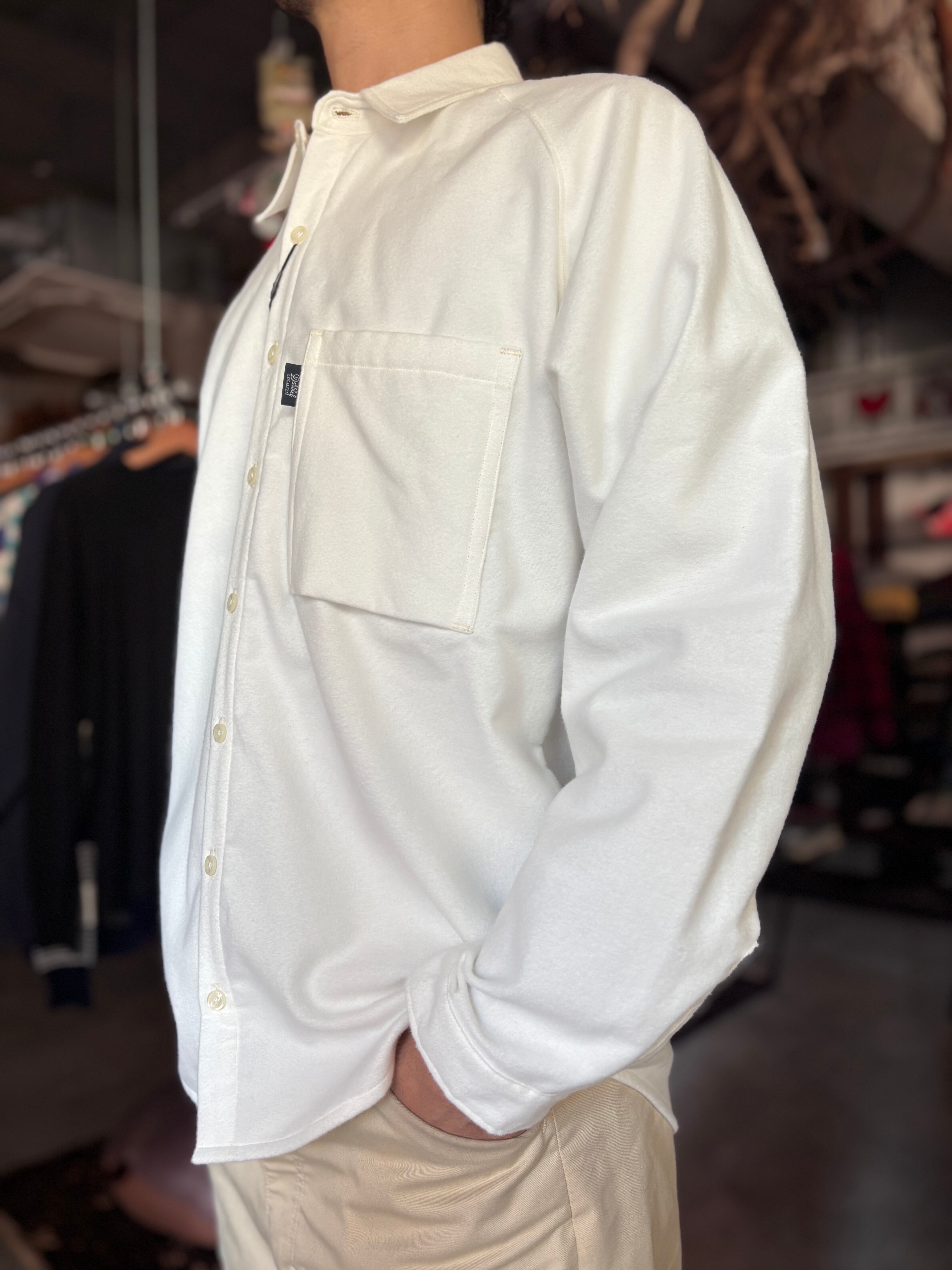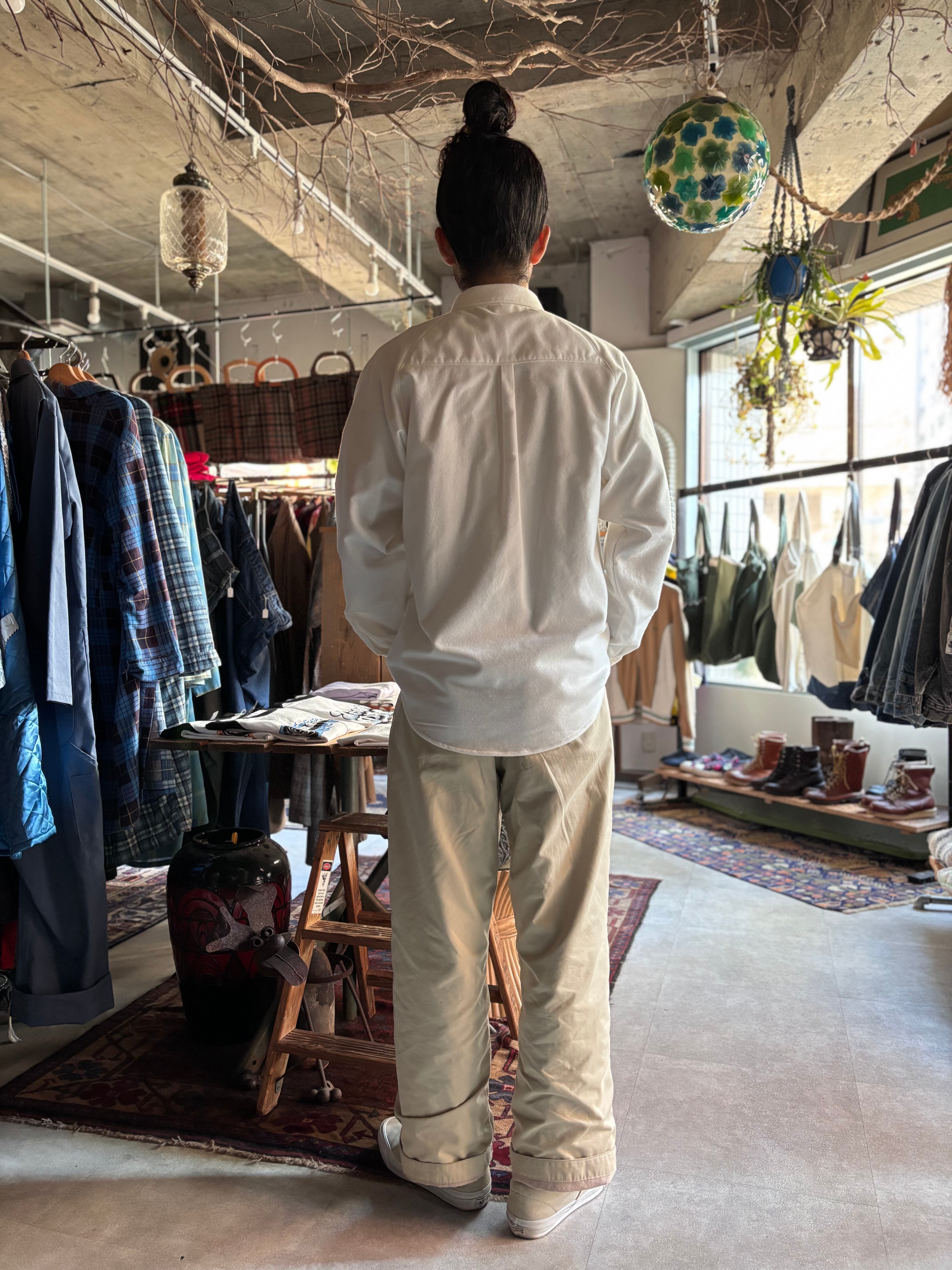 ドレッシーな比翼仕立てと、スポーティなラグランスリーブが特徴のUNCITYをインナーに特化した仕様に変更したもの。比翼から裏前たてに、胸ポケットを大ぶりにしたことで力の抜けた印象になりました。柔らかく肌あたりの良いフランネル素材です。