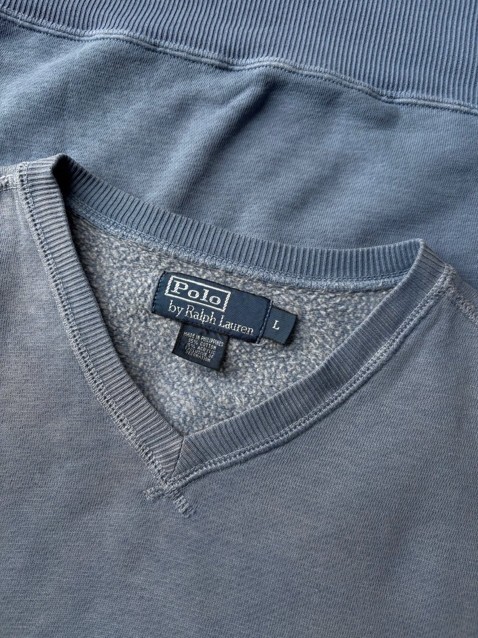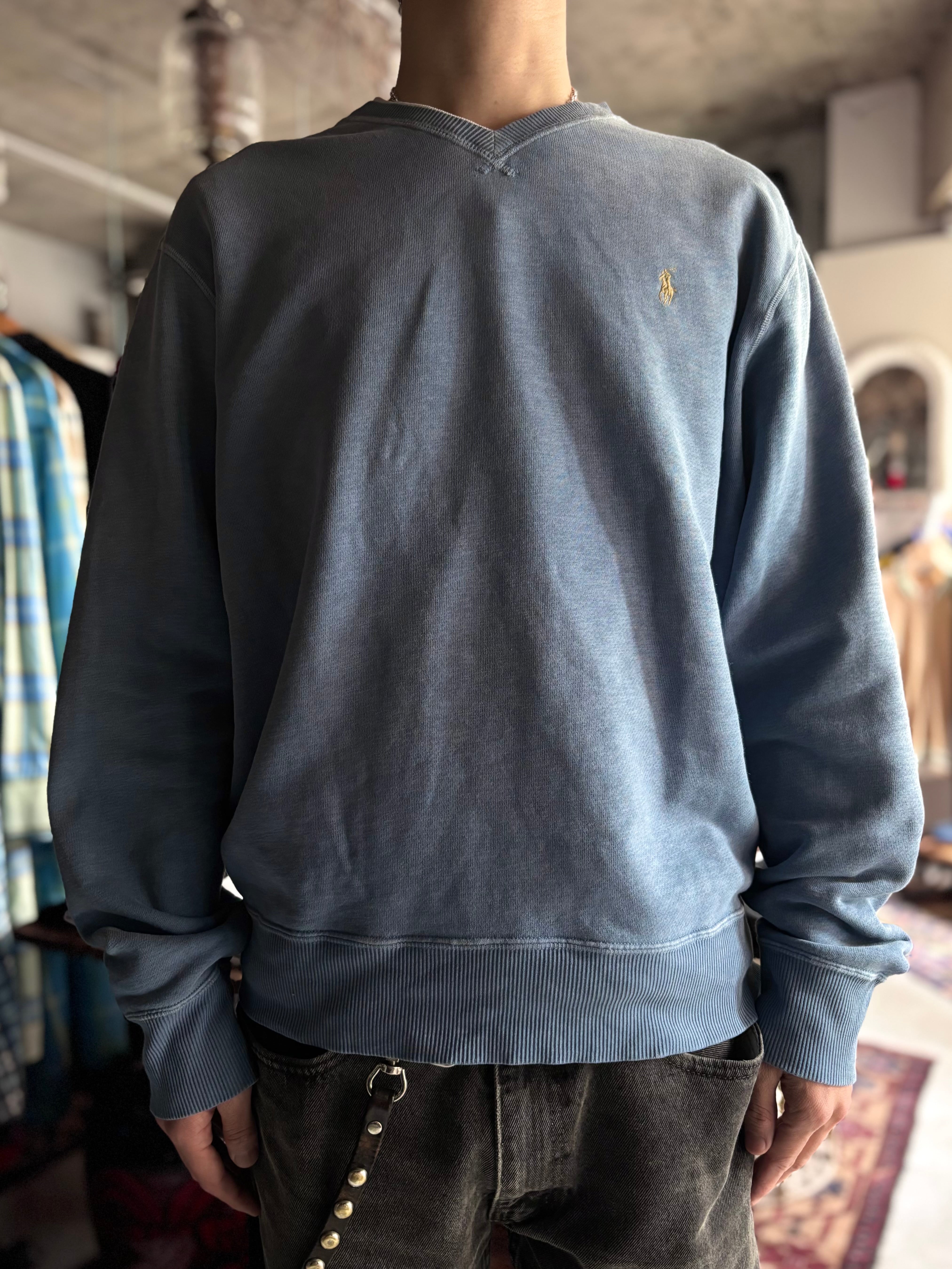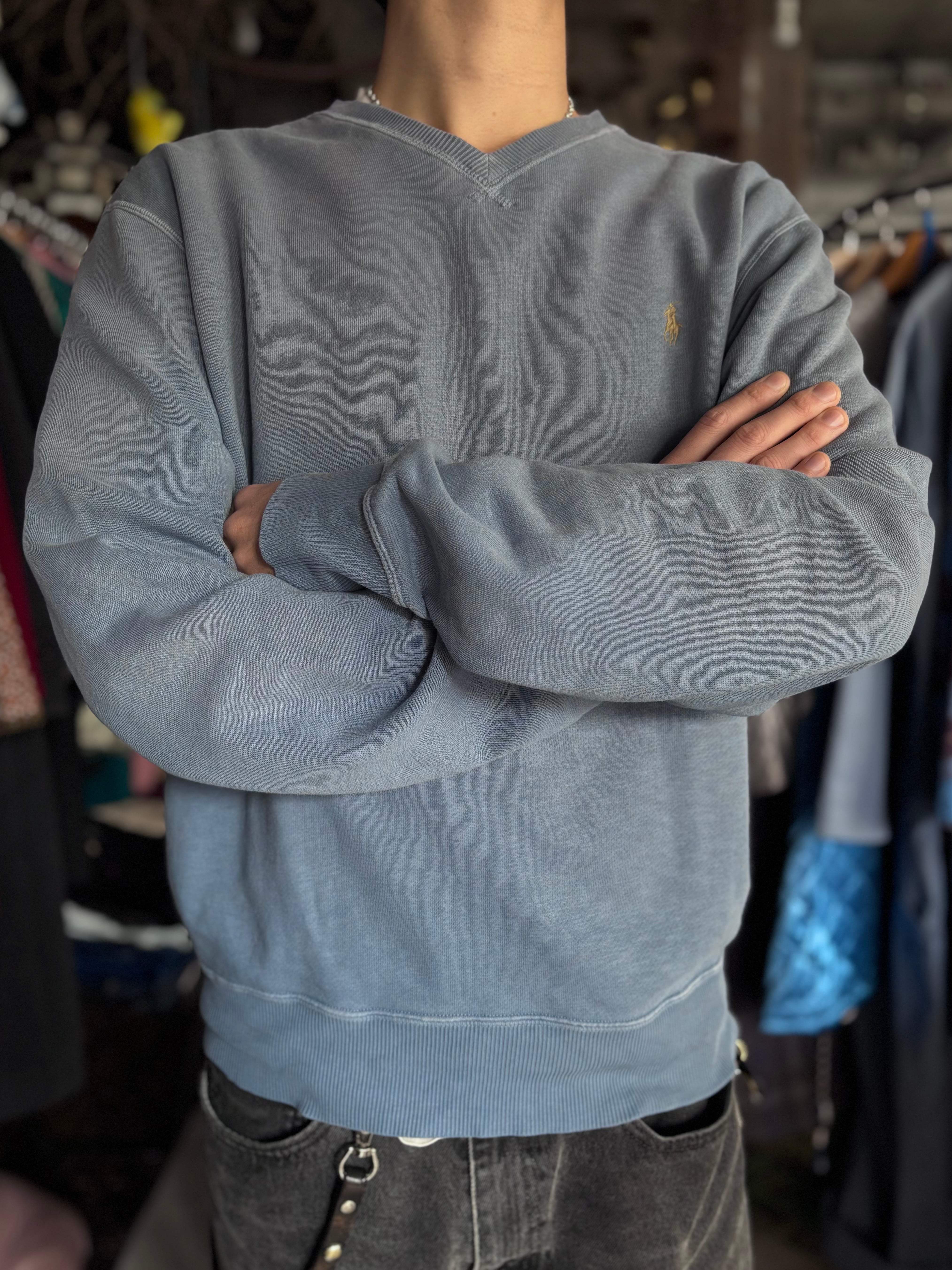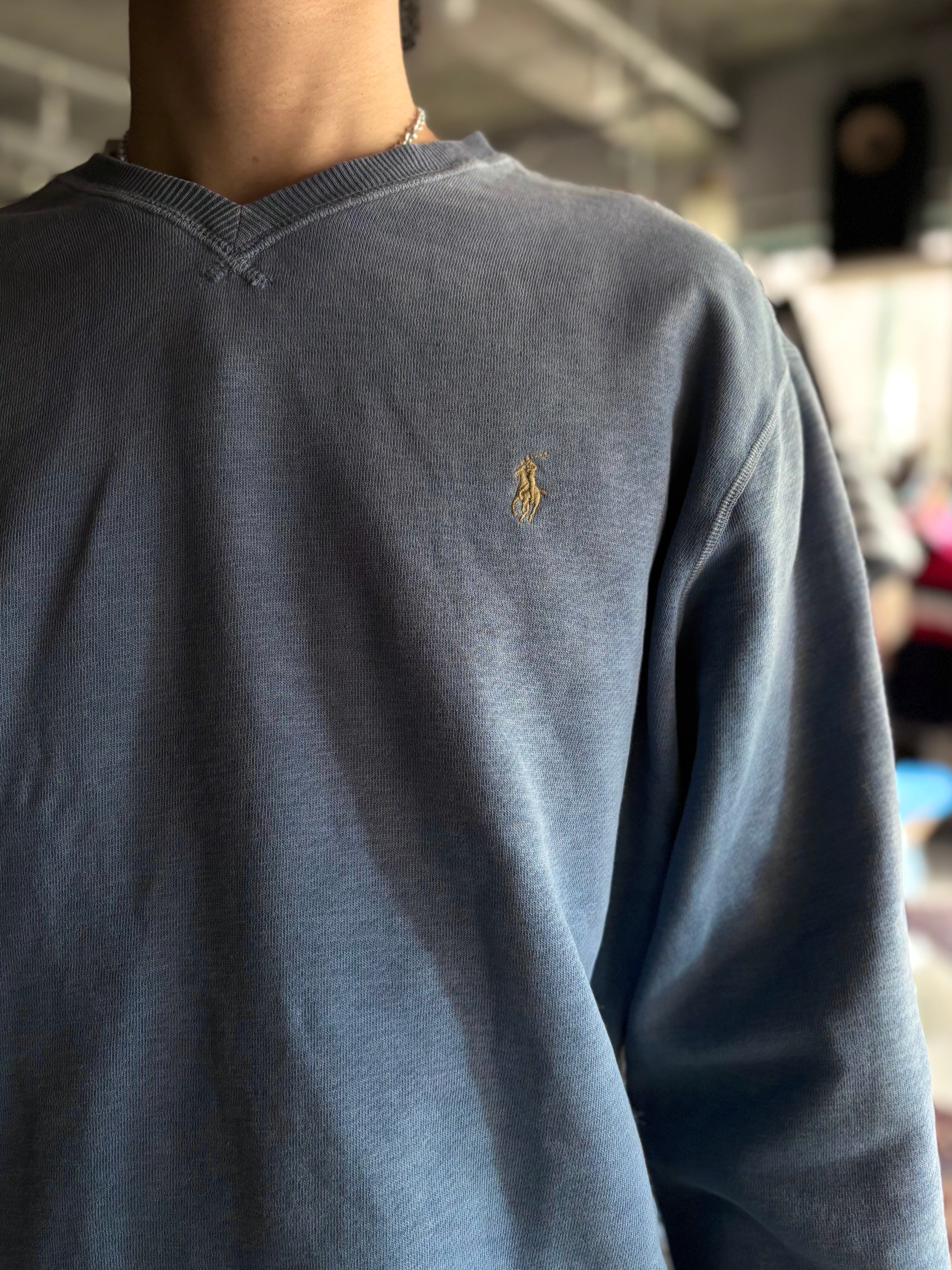 柔らかいコットンポリ素材。リラックスフィット。浅めのVネックにグレーのポニー刺繍がお洒落です。