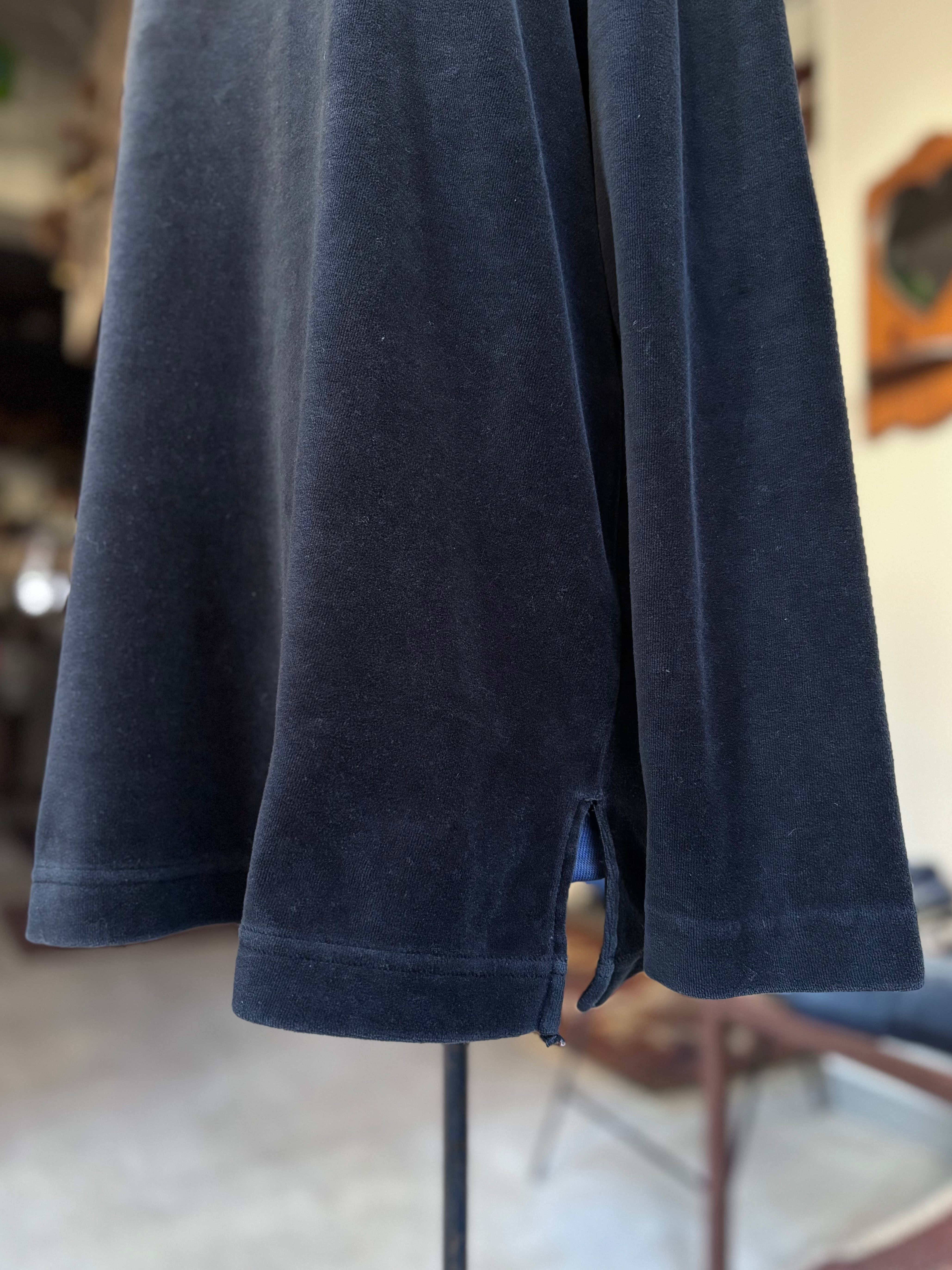 柔らかいベロア生地。リラックスフィット。前V付き、サイドスリット入り。
