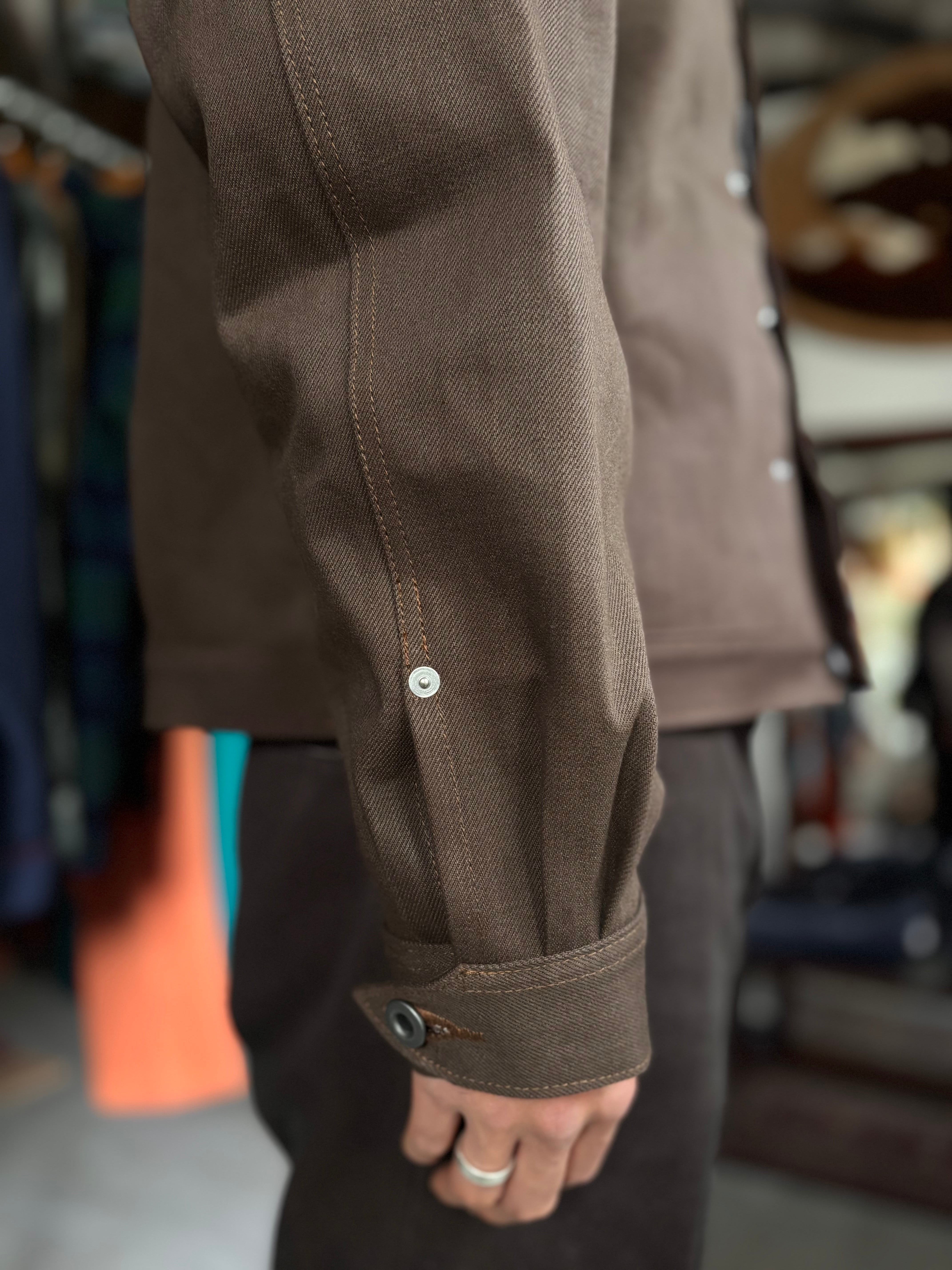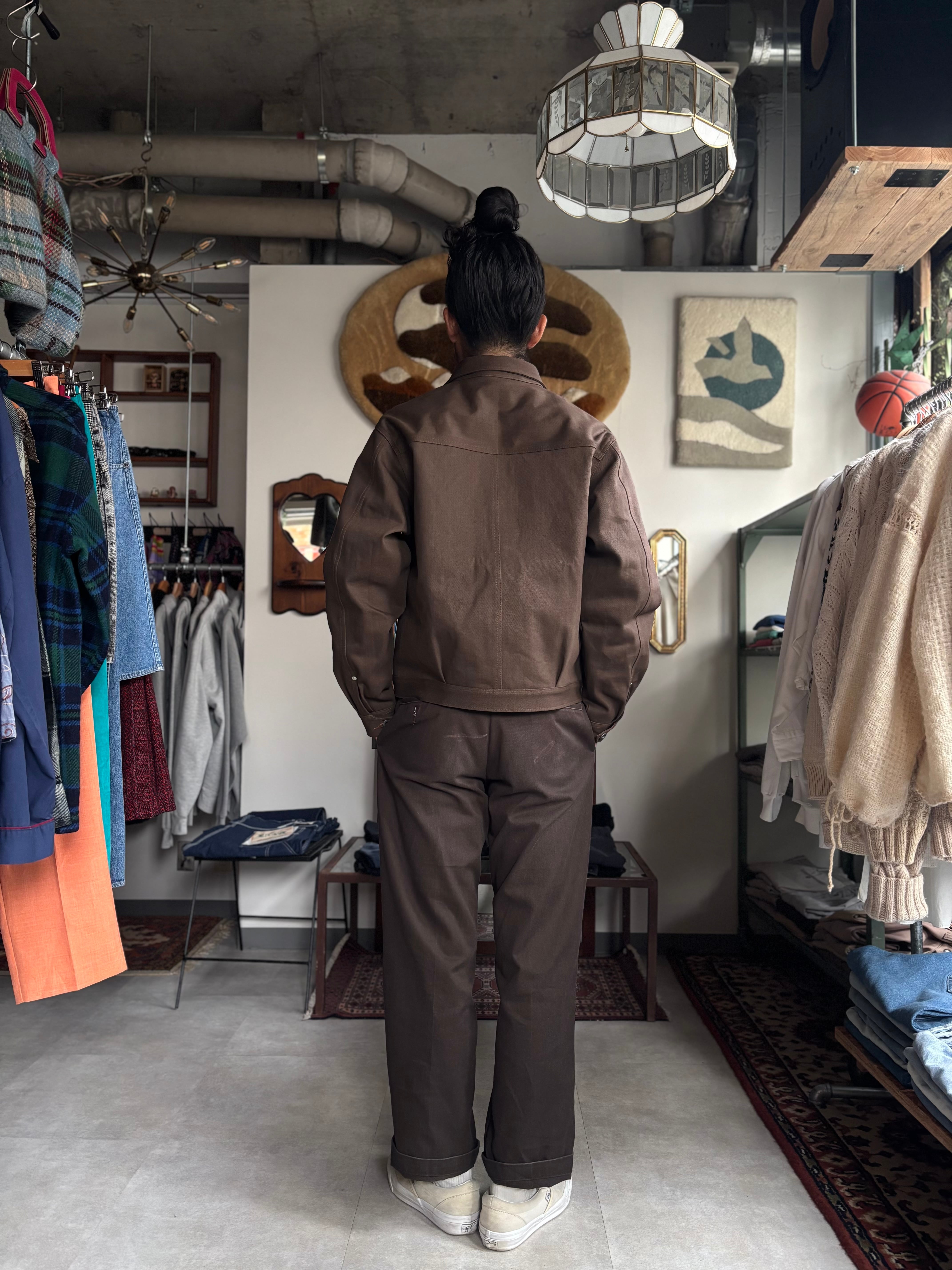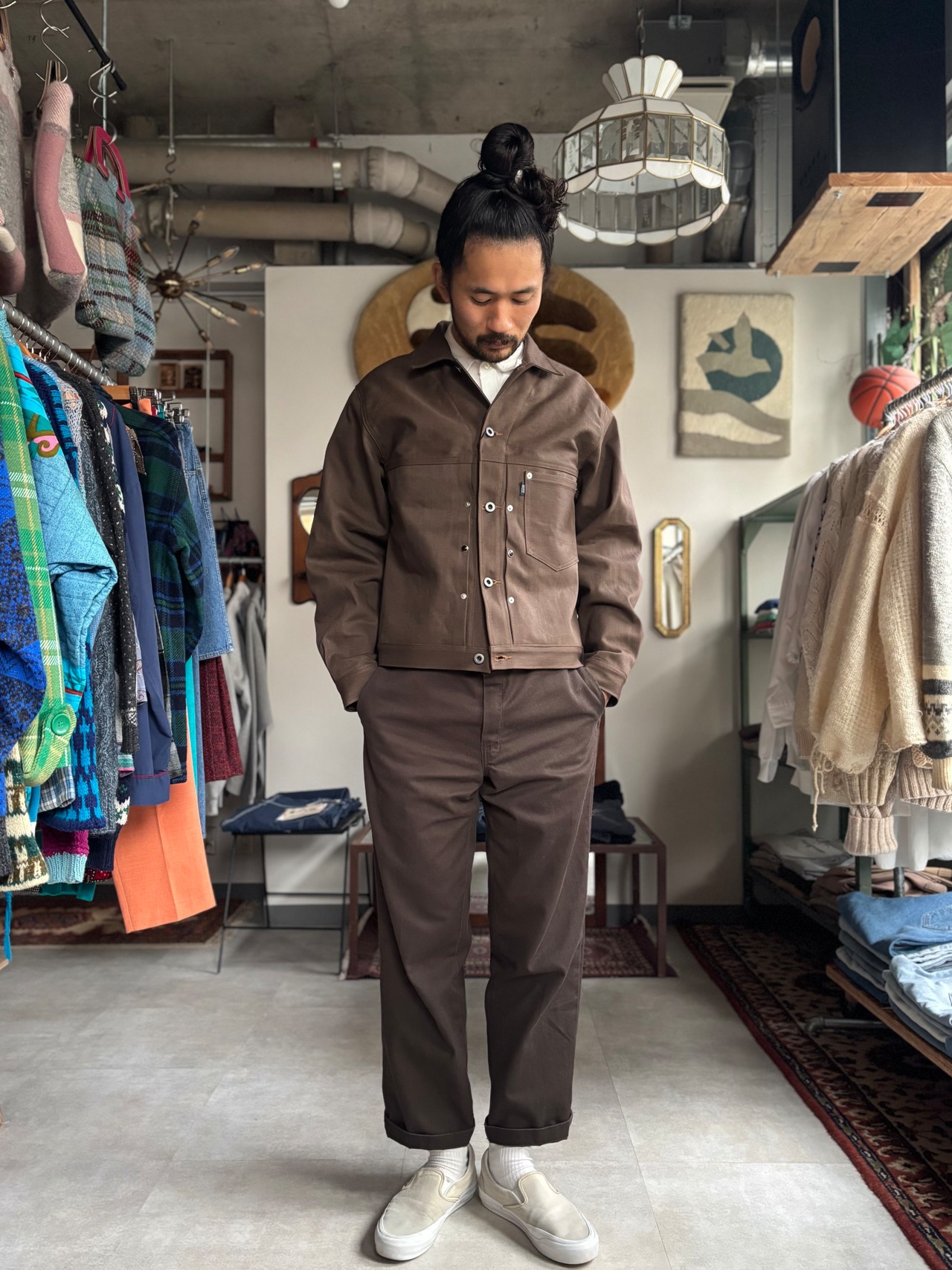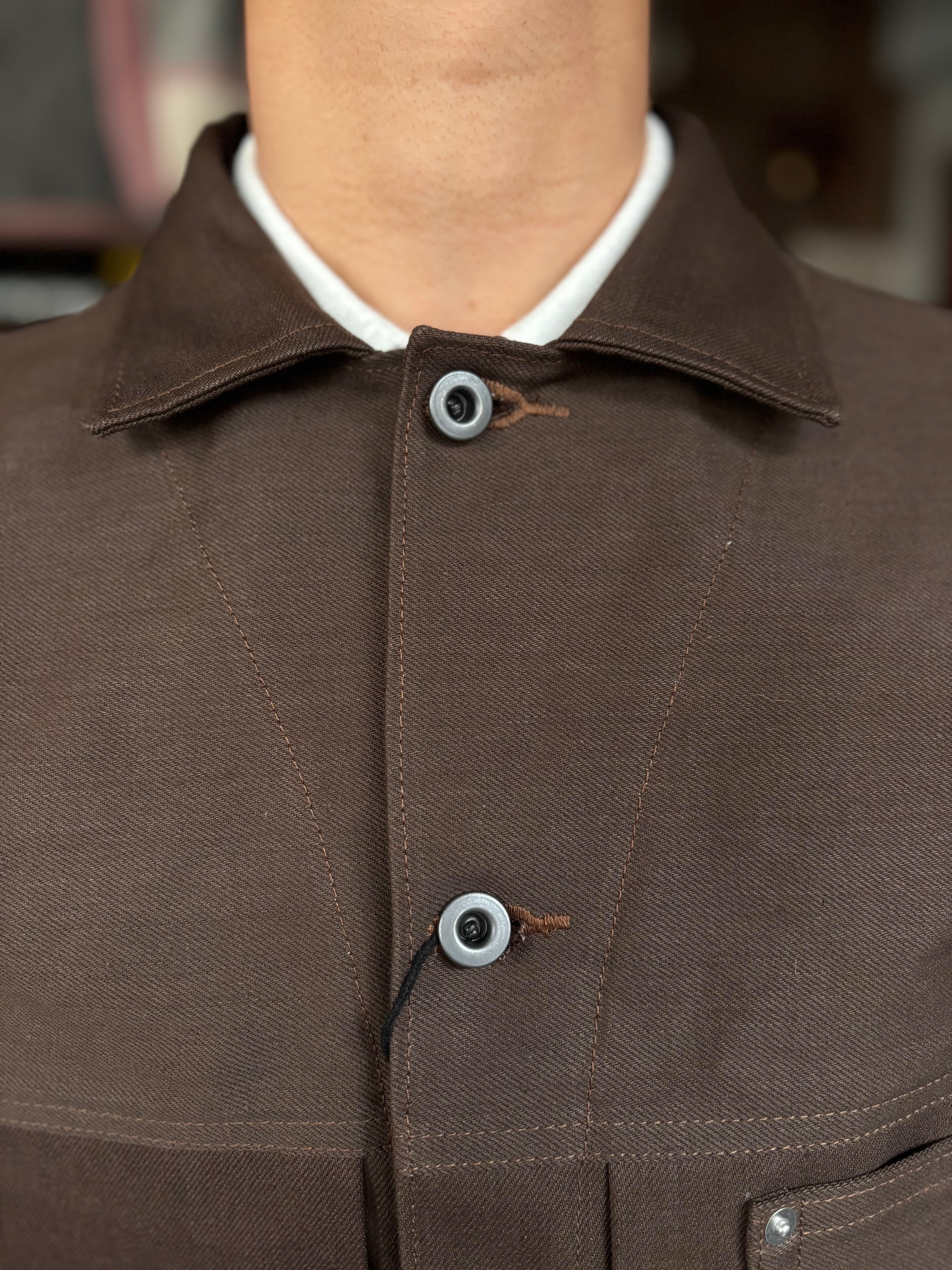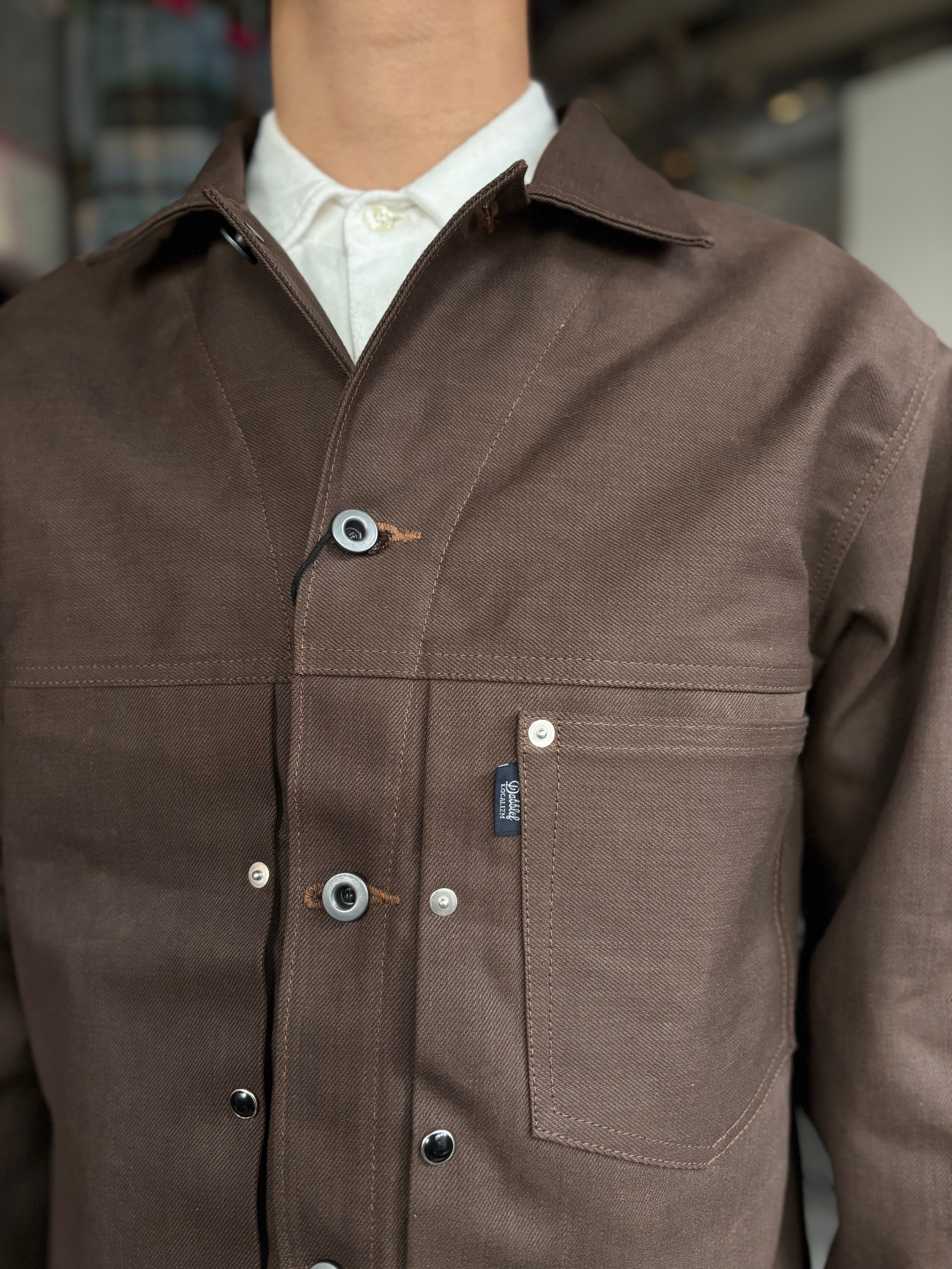 ビンテージライクな片胸ポケットのワークジャケットスタイル。ブラウンのデニム生地に、グレーのフランネルライナー仕様。フロントプリーツ下に設けられた隠しポケット、装飾的なパールボタン、レトロなカフスデザインなど各ディテールのギミックが効いたデザイン。
