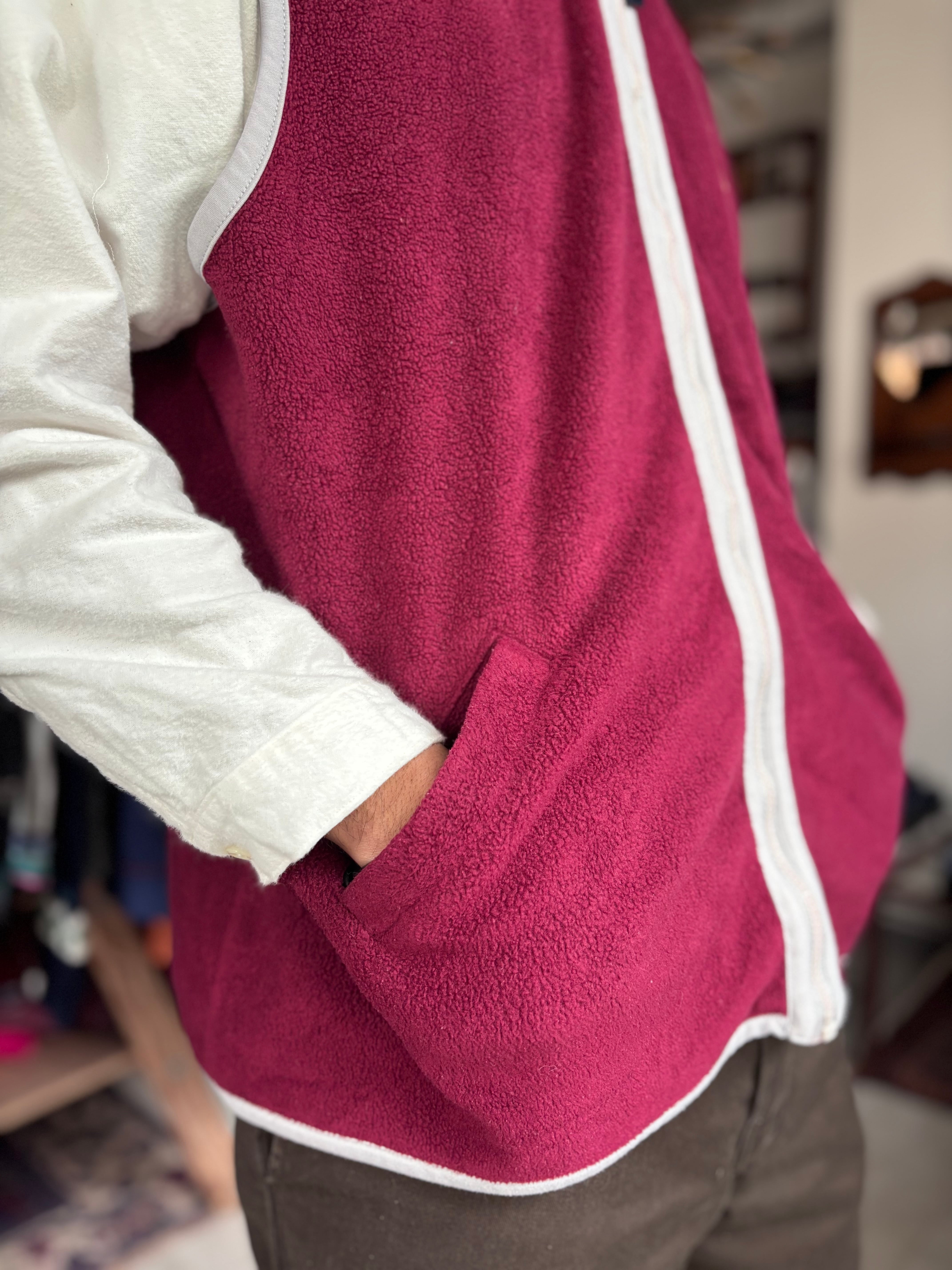 軽い着心地のフリース素材。リラックスフィット。グレーのパイピングがとてもお洒落です。