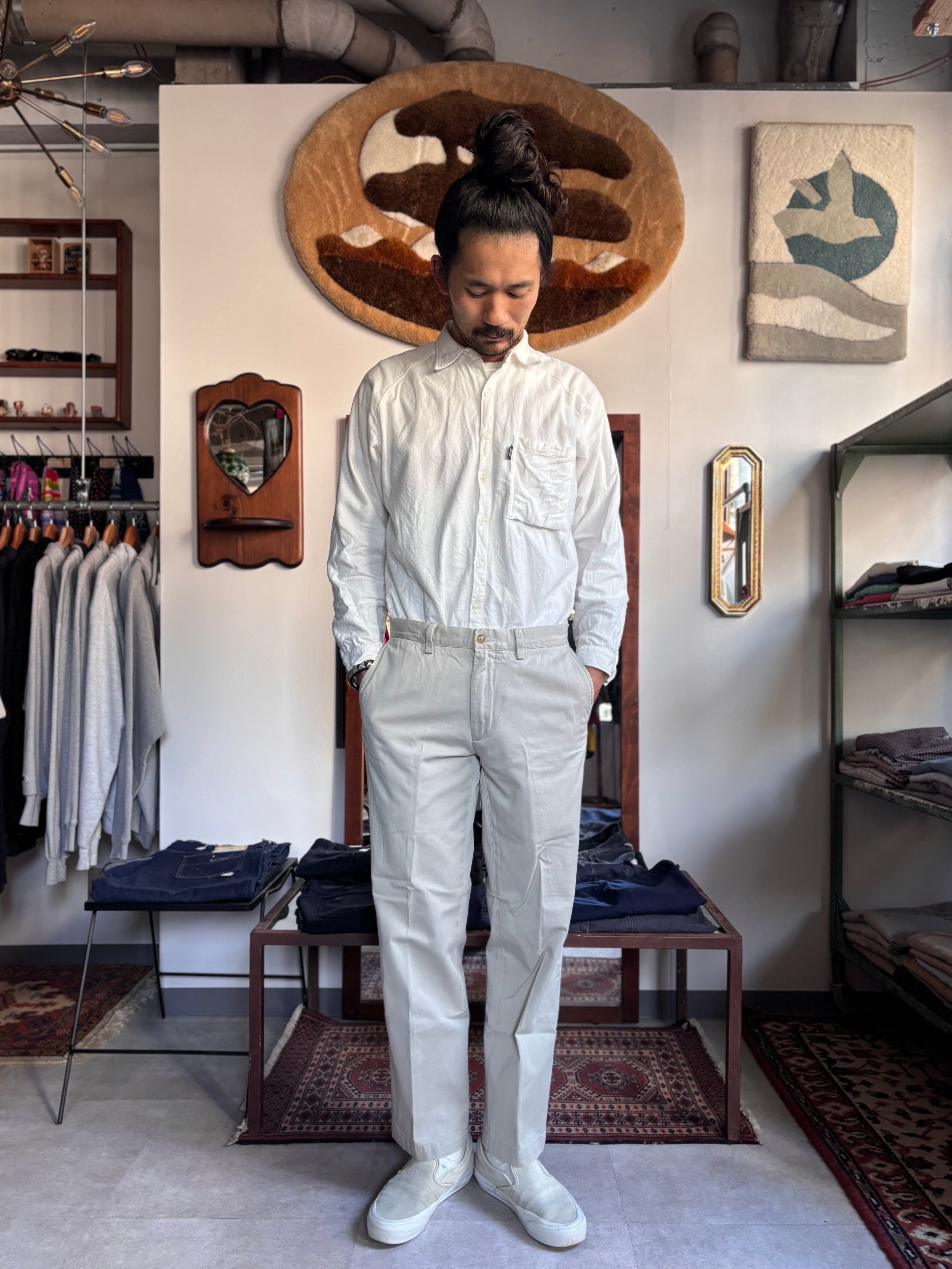 アイボリーカラーのチノクロス。ノータックの細身ストレート。品よくまとまります。