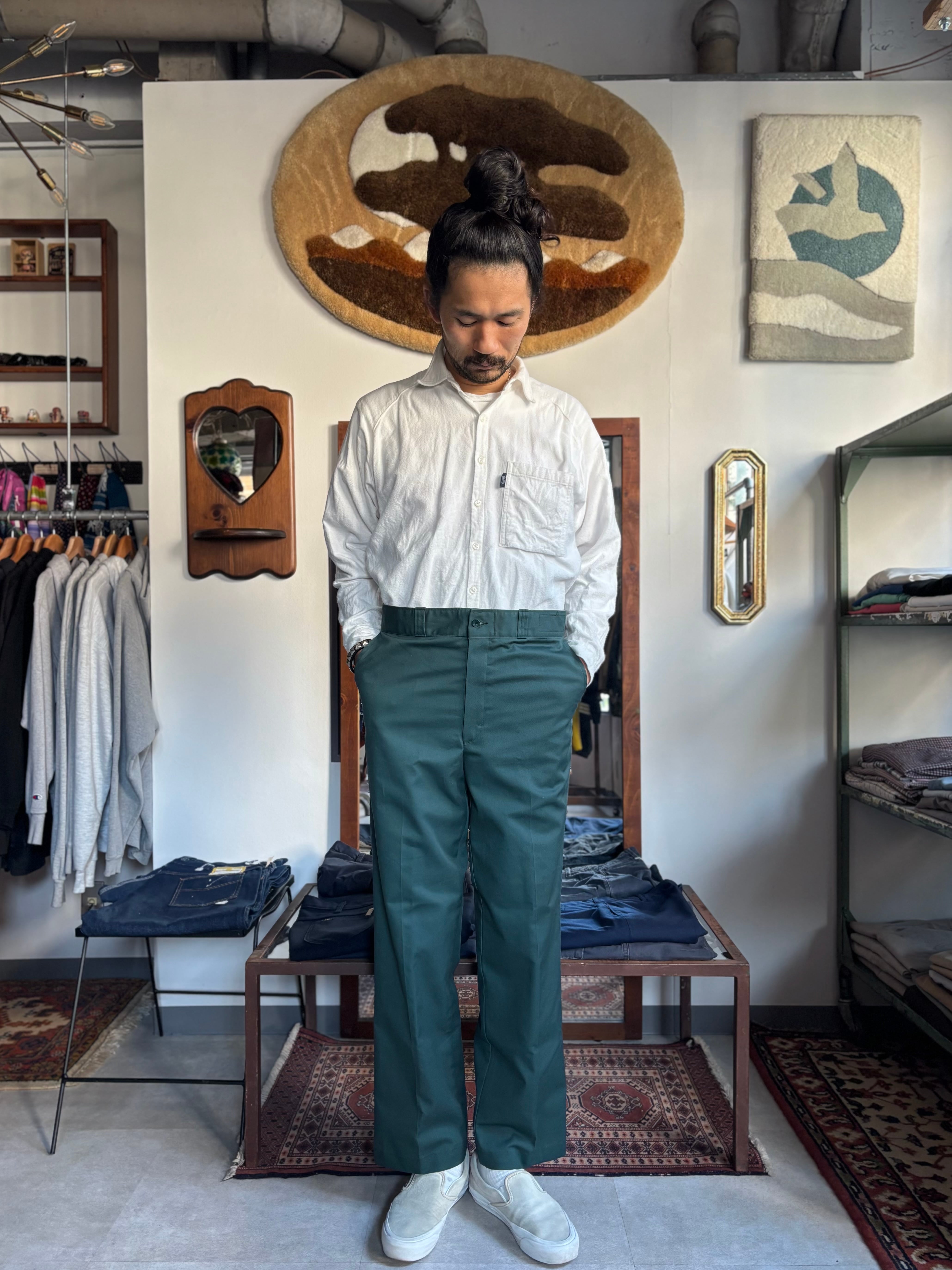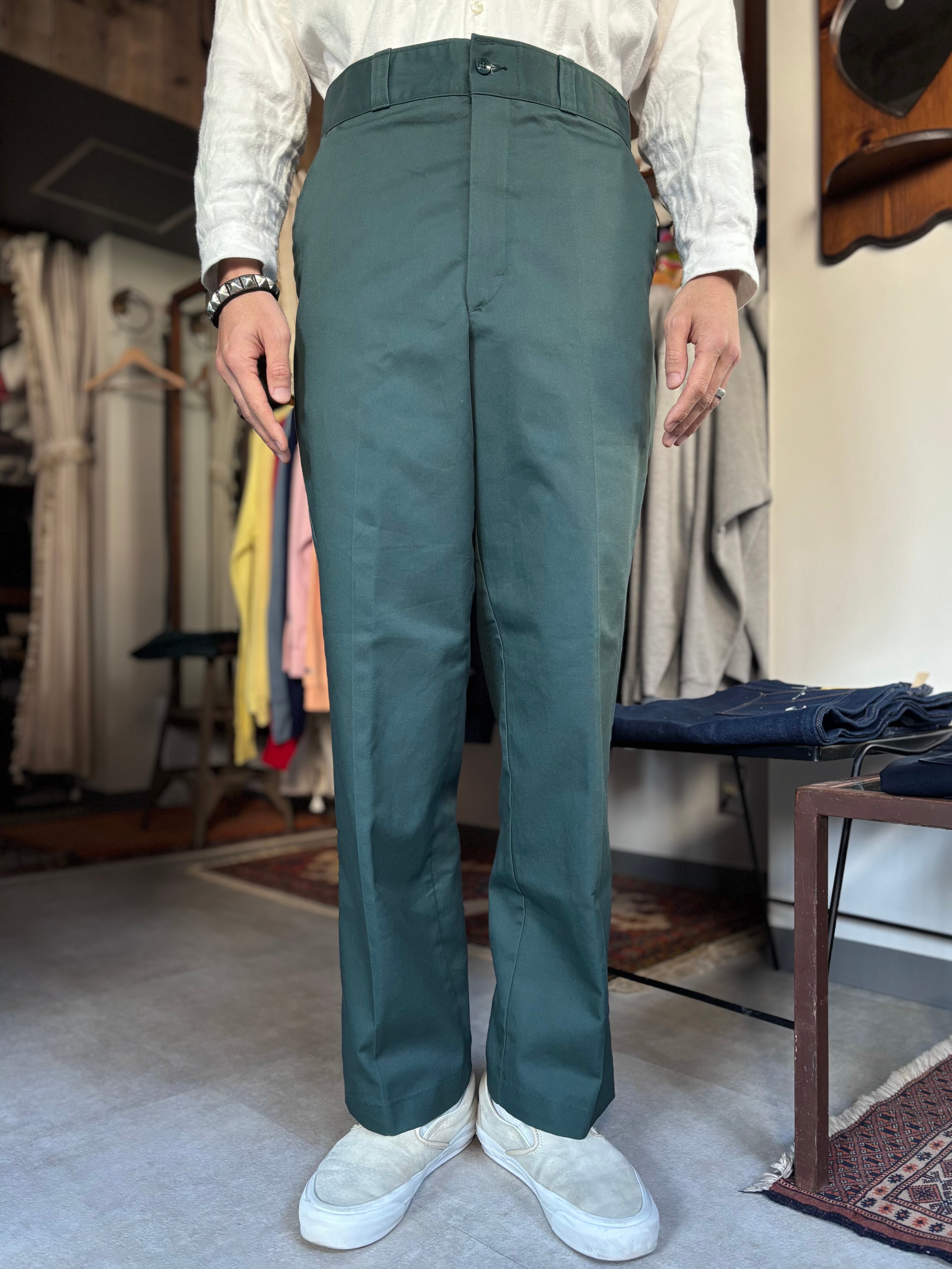 コットンポリツイル。スリムストレート。インダストリアルなグリーンカラーです。(同サイズ同コンディションが2本入荷)