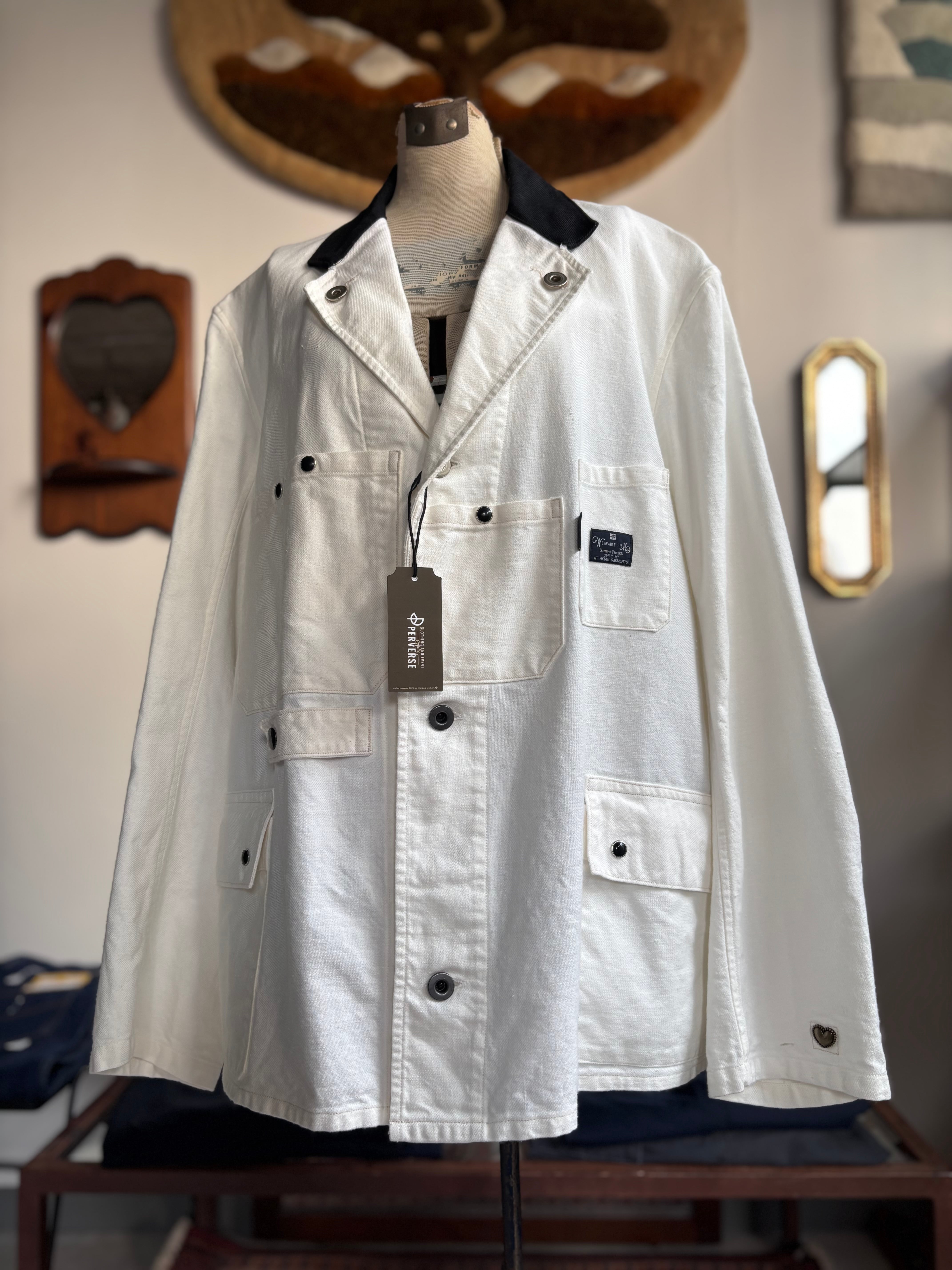 ※ 岡山県産のブラックデニムで仕立てられた襟は色落ちします。経年や色移り含め、一点ものの味わいとしてお楽しみくださいませ。