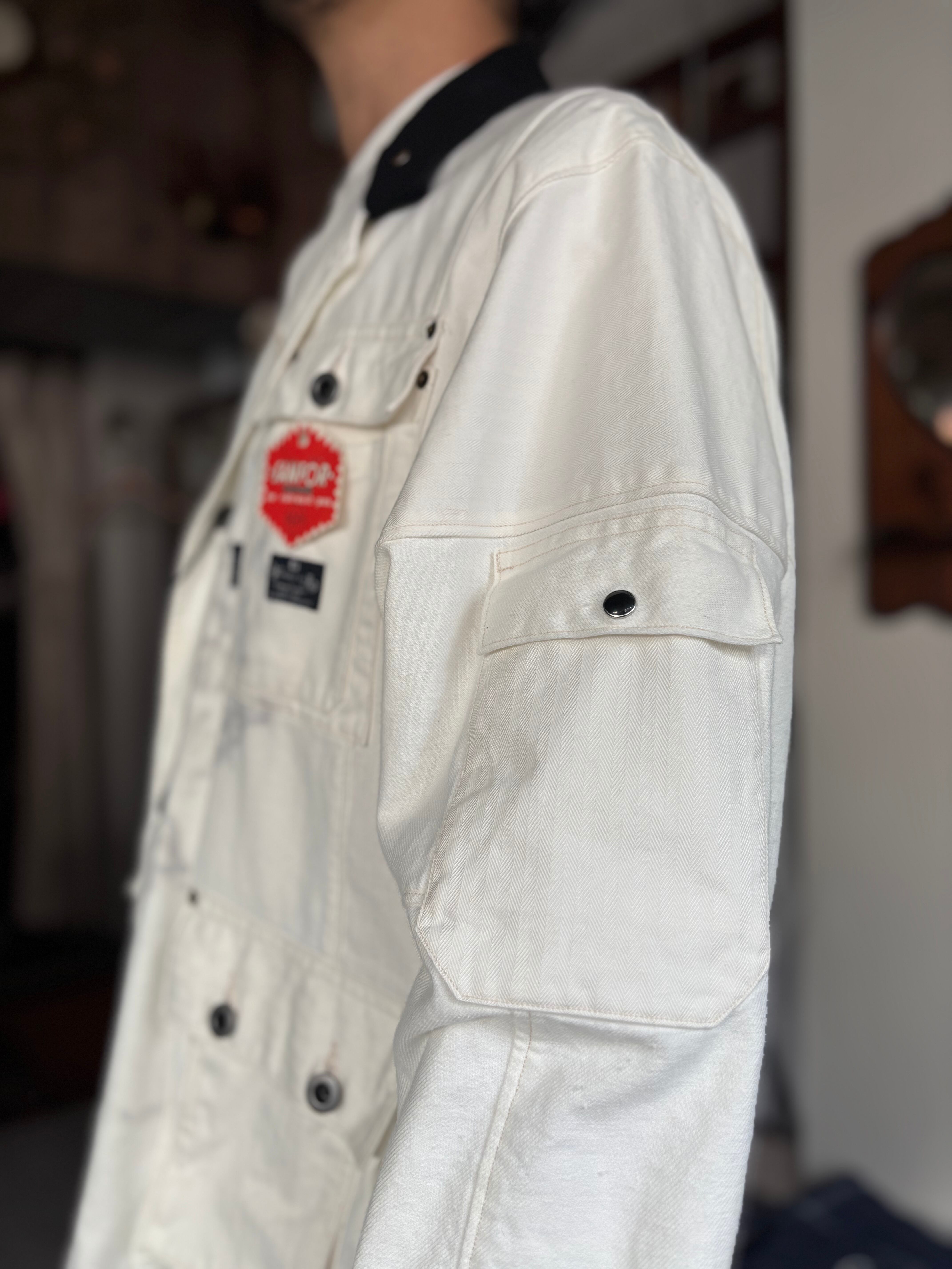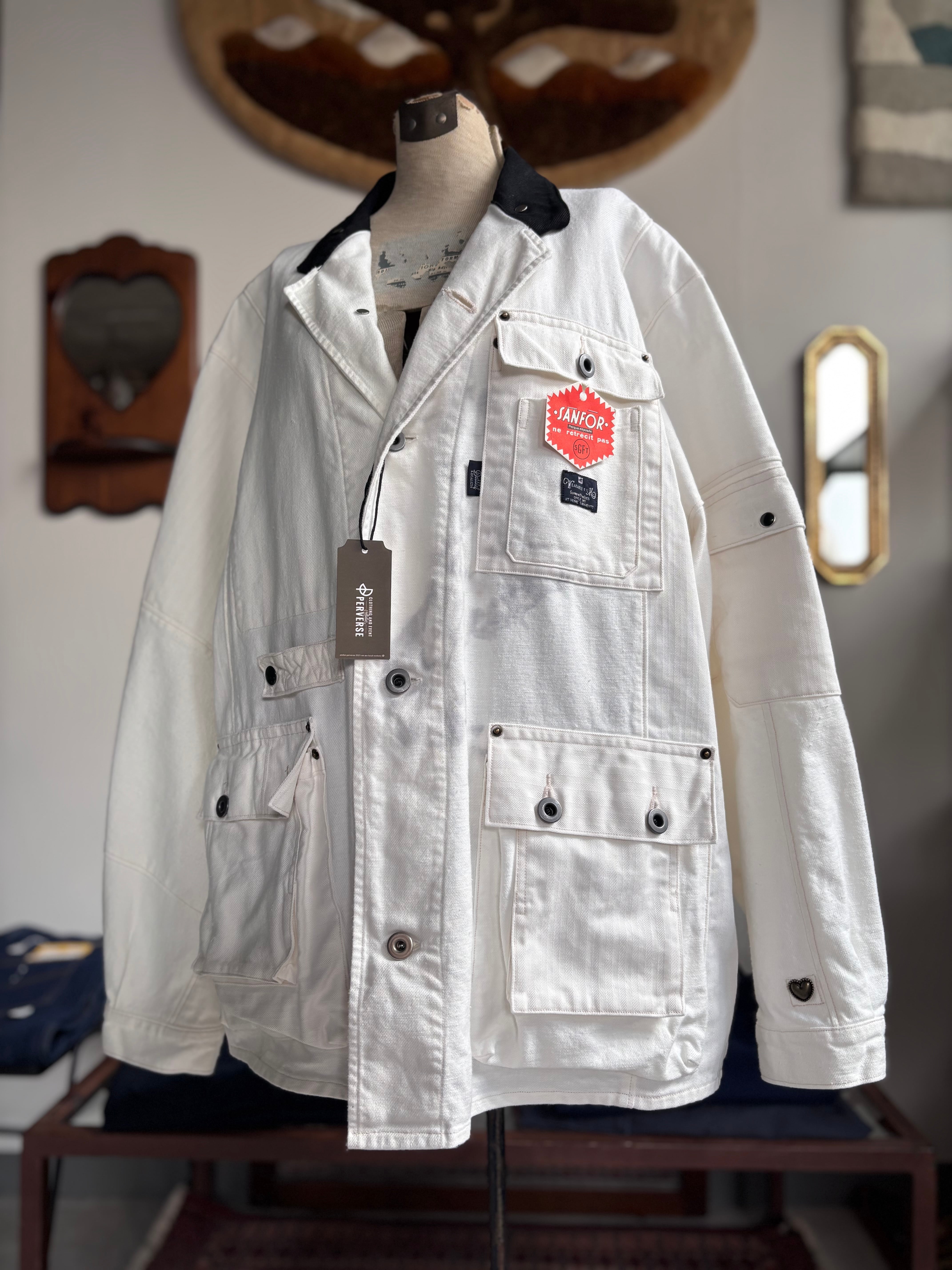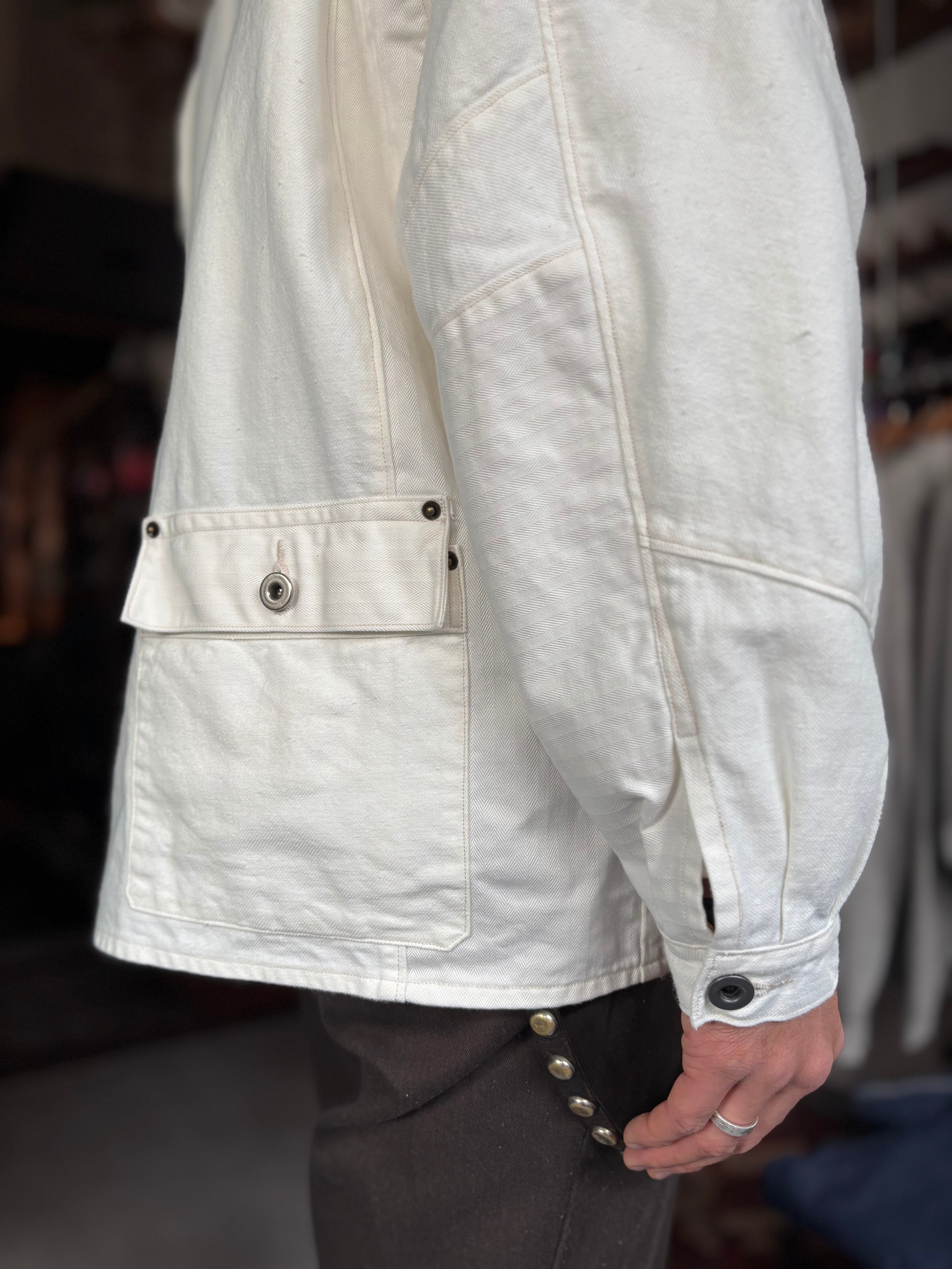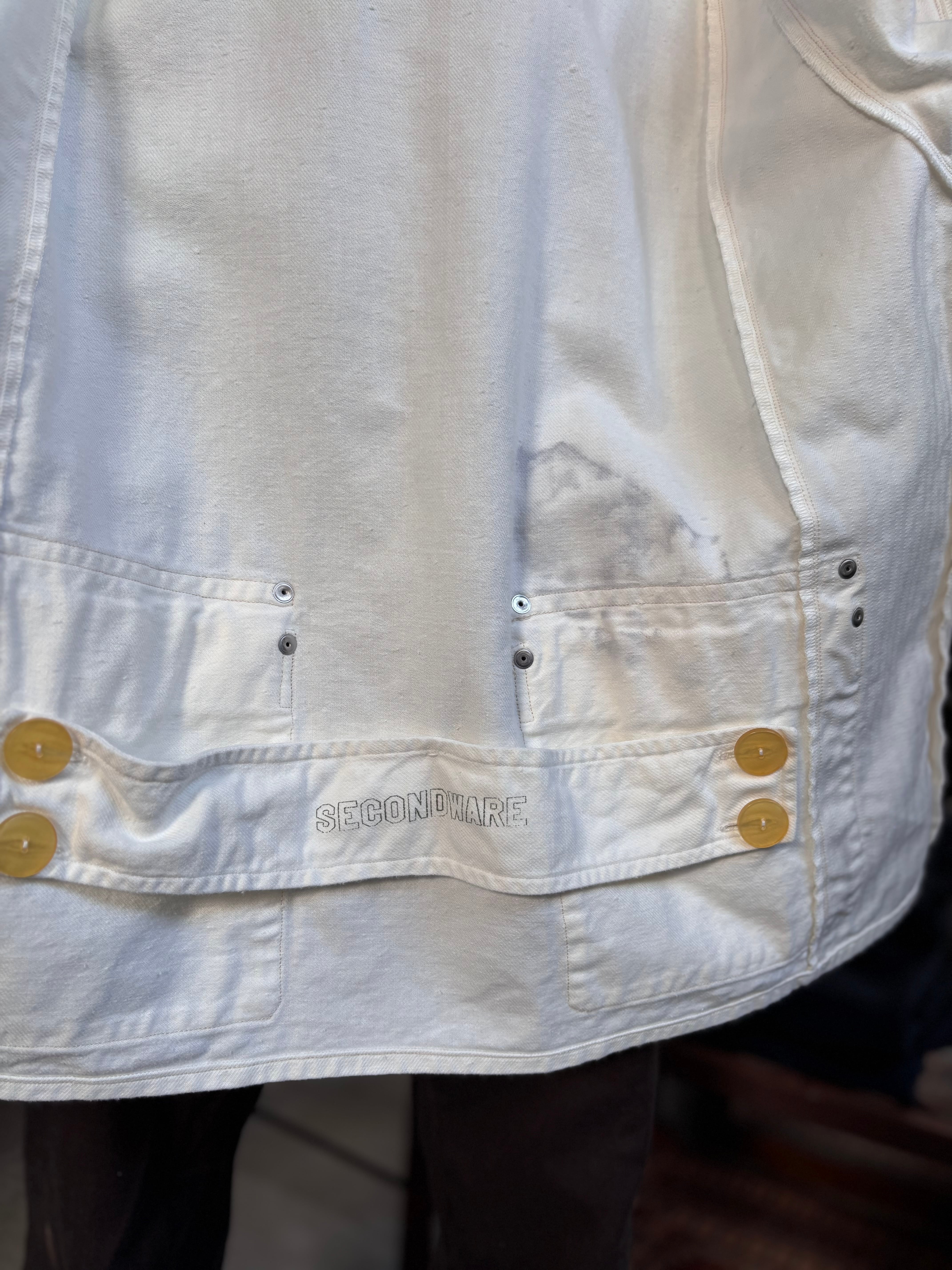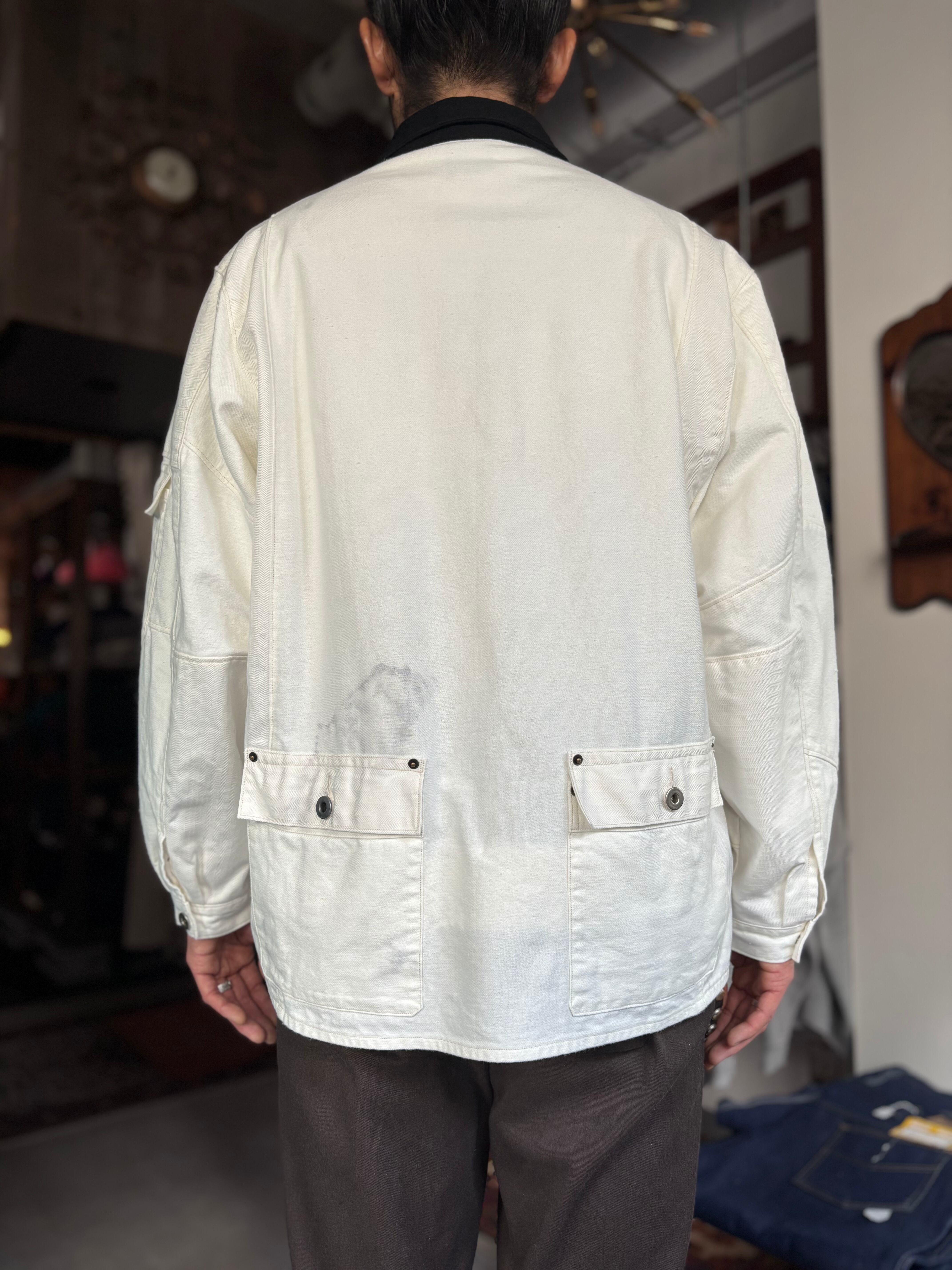 ※岡山県産のブラックデニムで仕立てられた襟は色落ちします。経年や色移り含め、一点ものの味わいとしてお楽しみくださいませ。