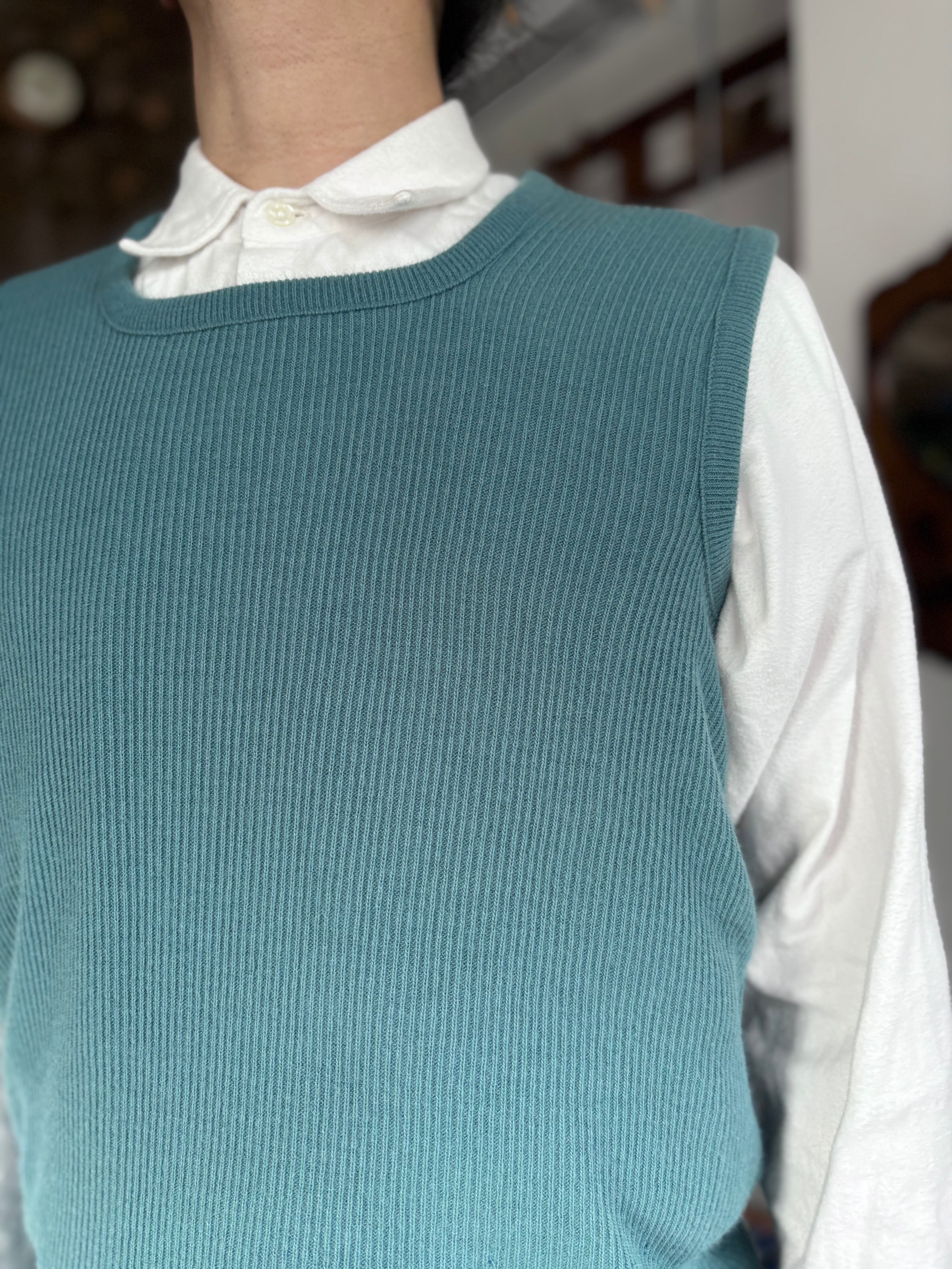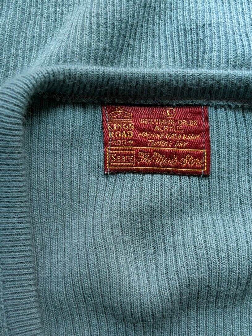 中厚のアクリル素材。オーセンティックフィット。レトロなUネック仕様。