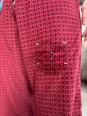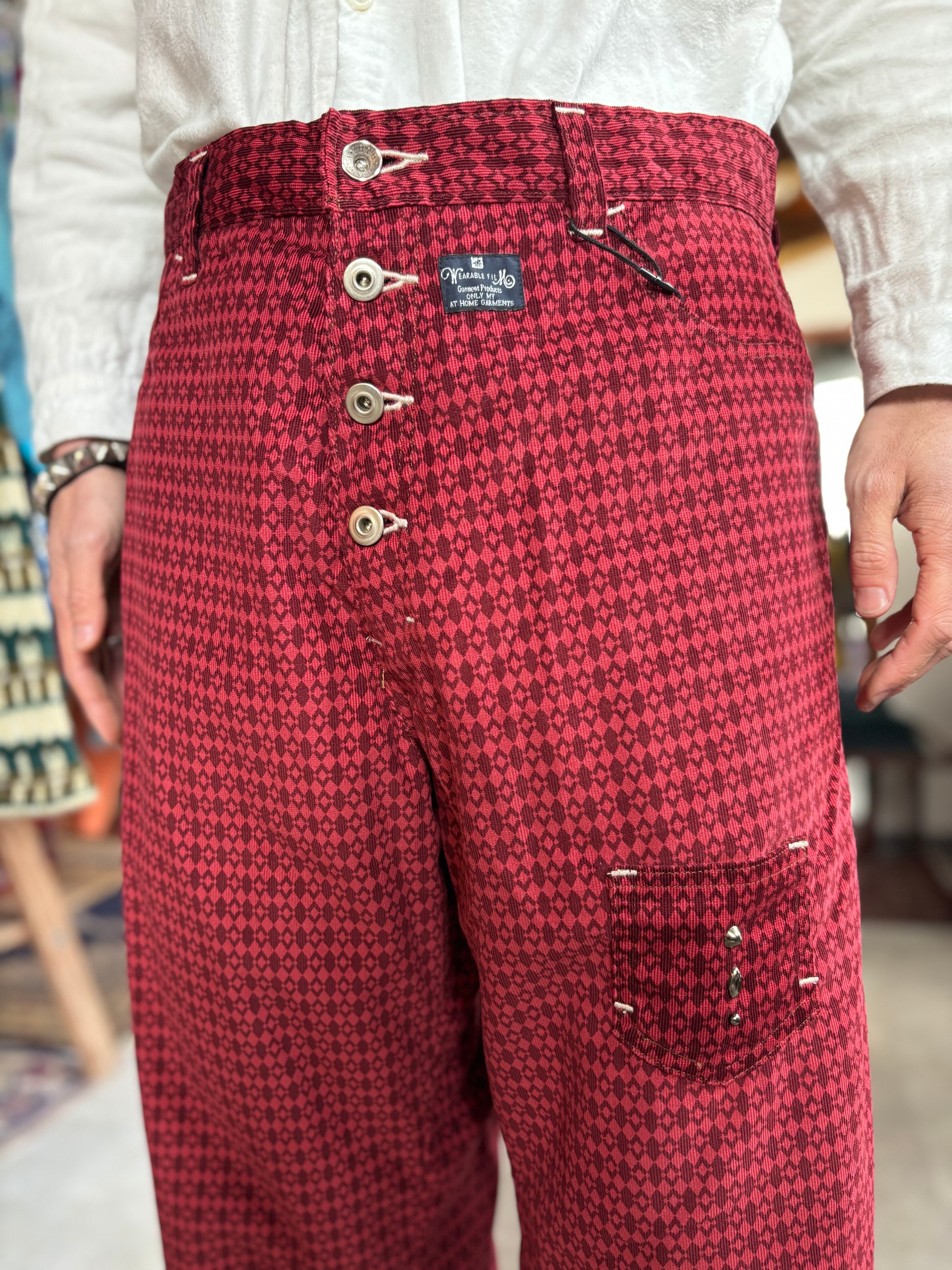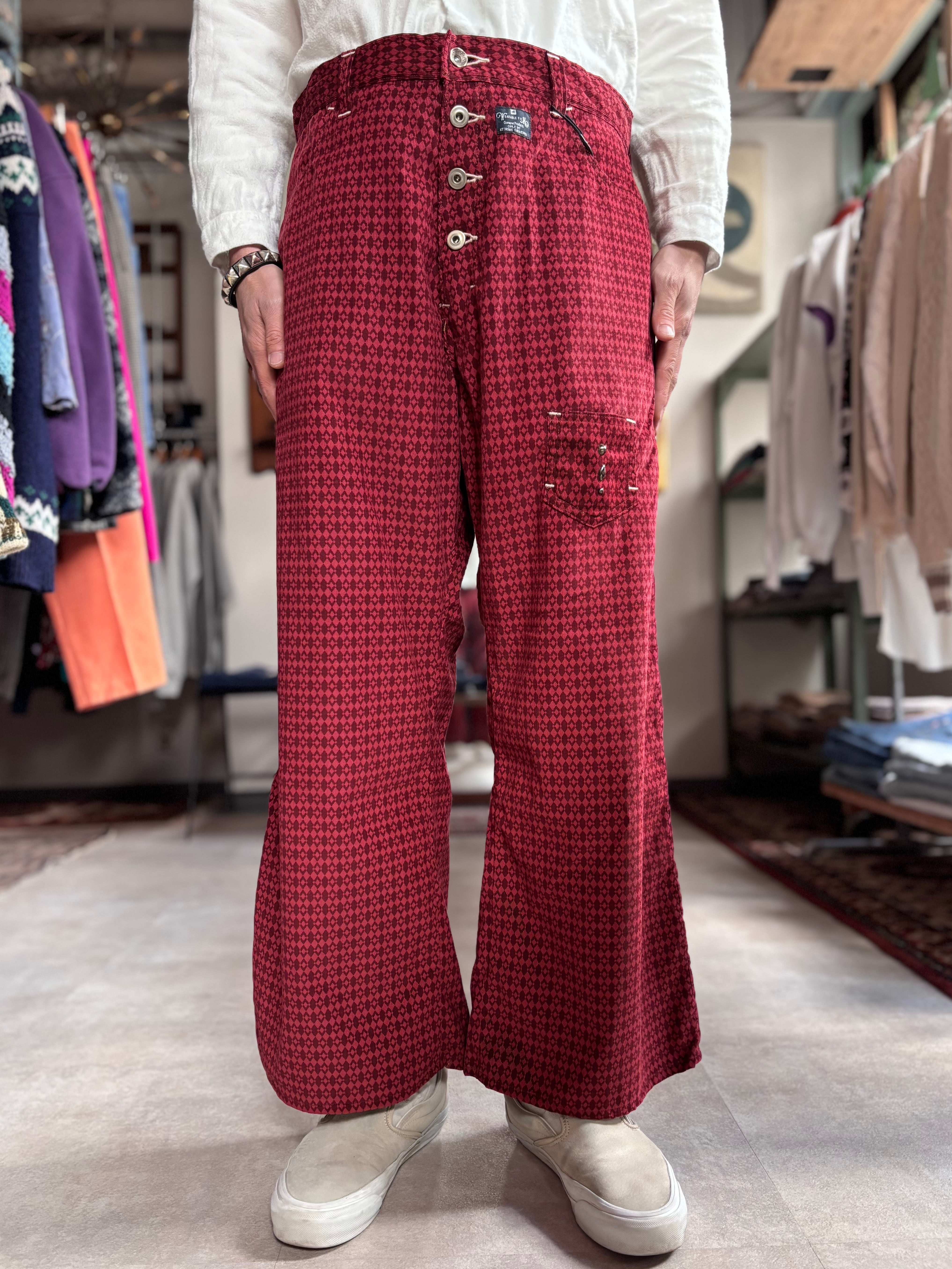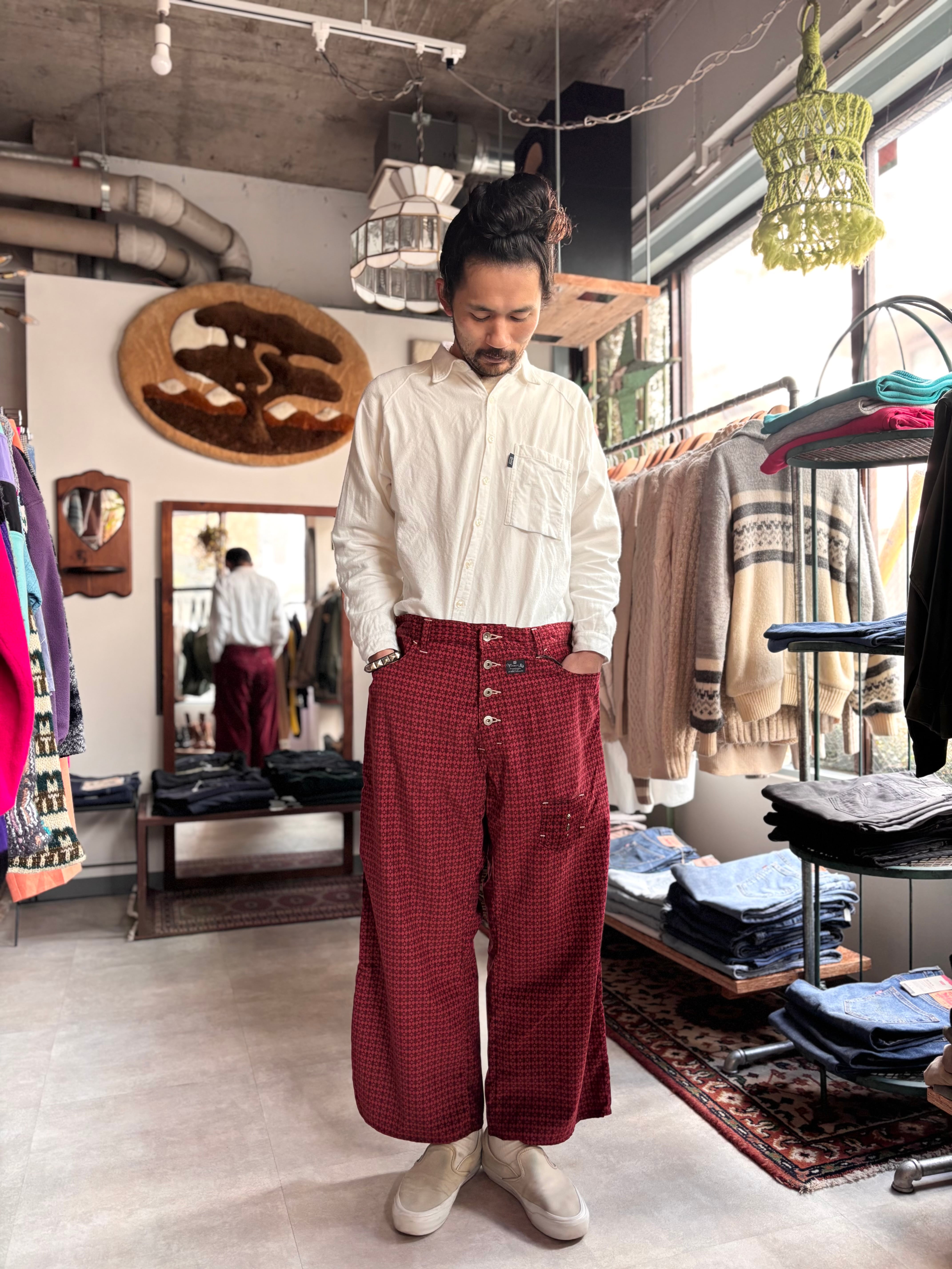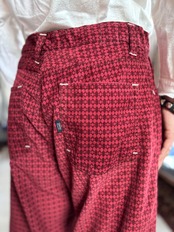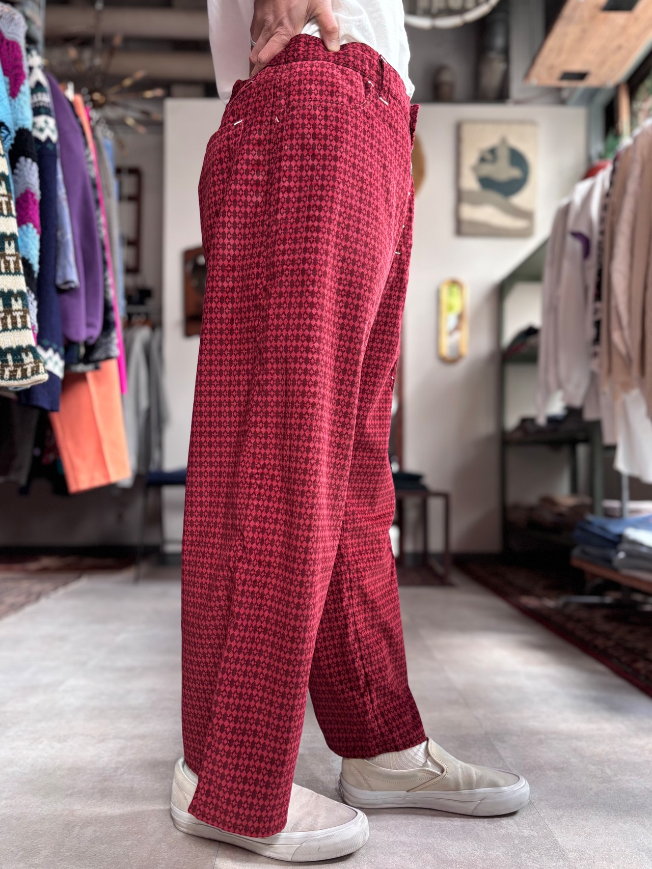 WEARABLE FILM.では全体の表現に必要なアイテムを不定期でリリースしており、そのアイテム達はモデル名を持ちません。こちらは細かなアーガイルの総柄がプリントされたコーデュロイ生地を採用したワイドパンツ。 冬のイメージが強いコーデュロイですが、シャツコーズ等と呼ばれる薄地のコーデュロイになっており、シーズンレスで着用していただけます。ふんわりとした質感がワイドシルエットとの相性も良く、動きに合わせて綺麗なドレープが出るので、カジュアルパンツでありながら上品な雰囲気を演出。ウエストをオーバーに設定しており、ベルトで絞って全体のドレープを調節して着用します。
