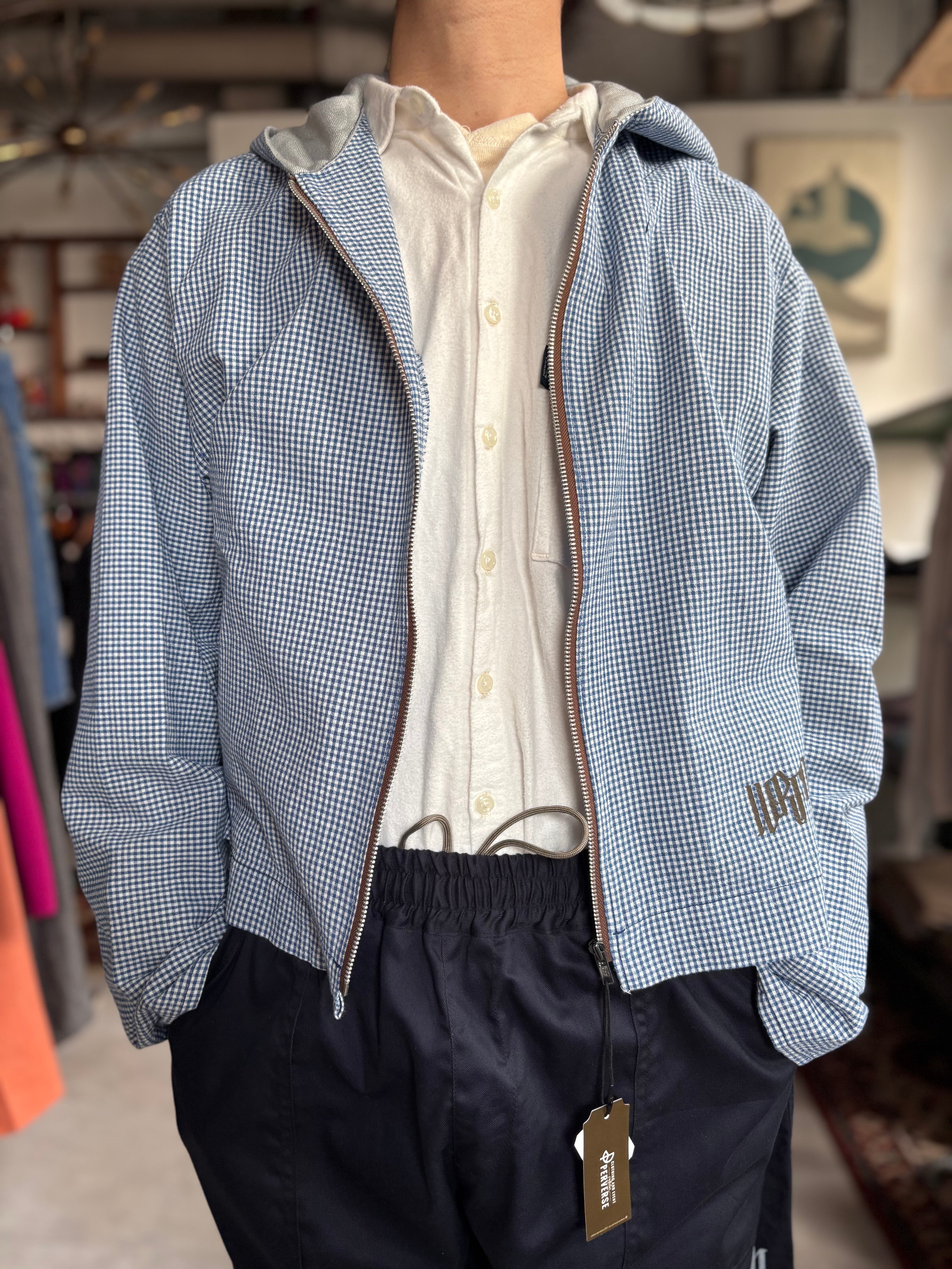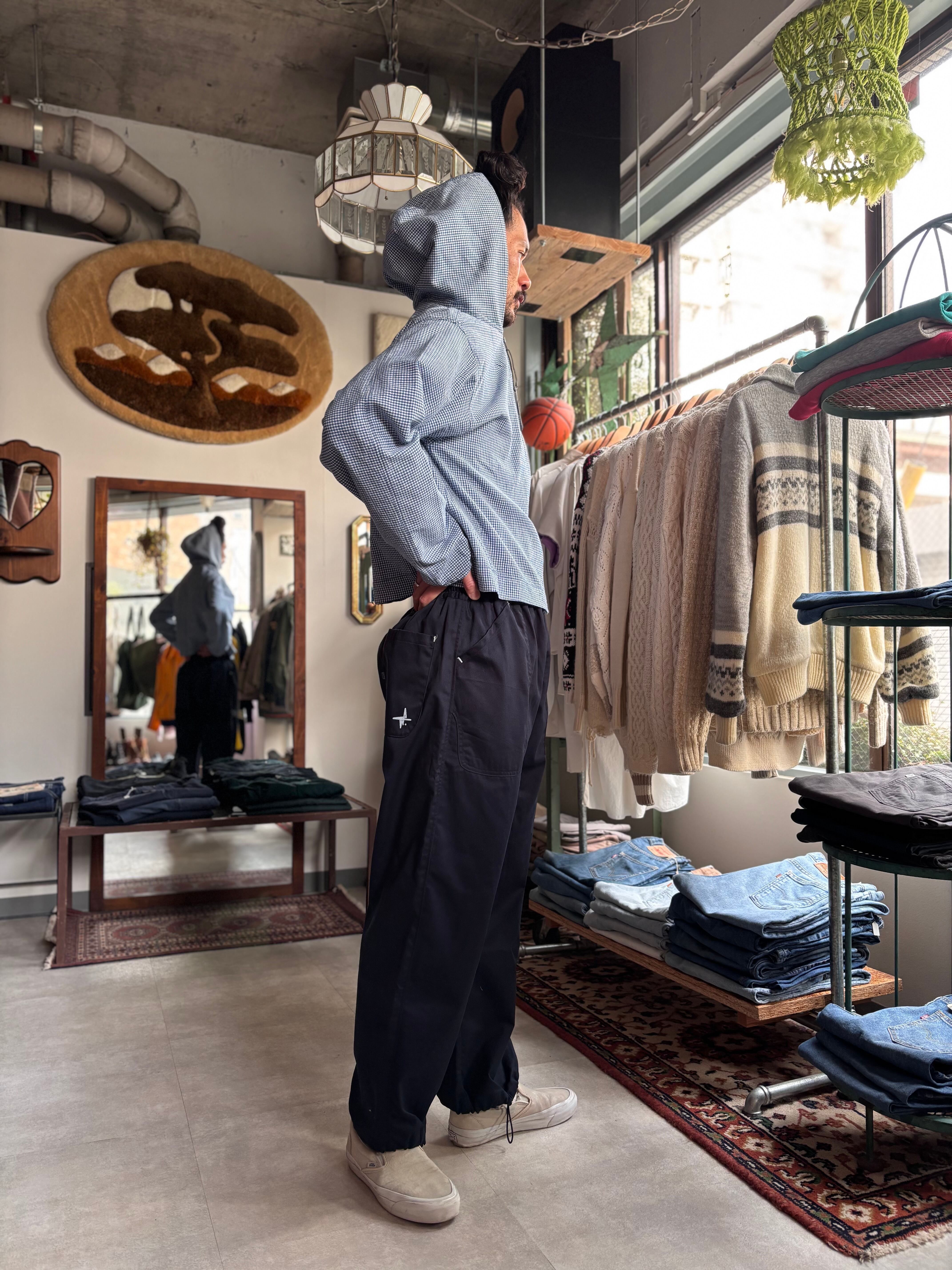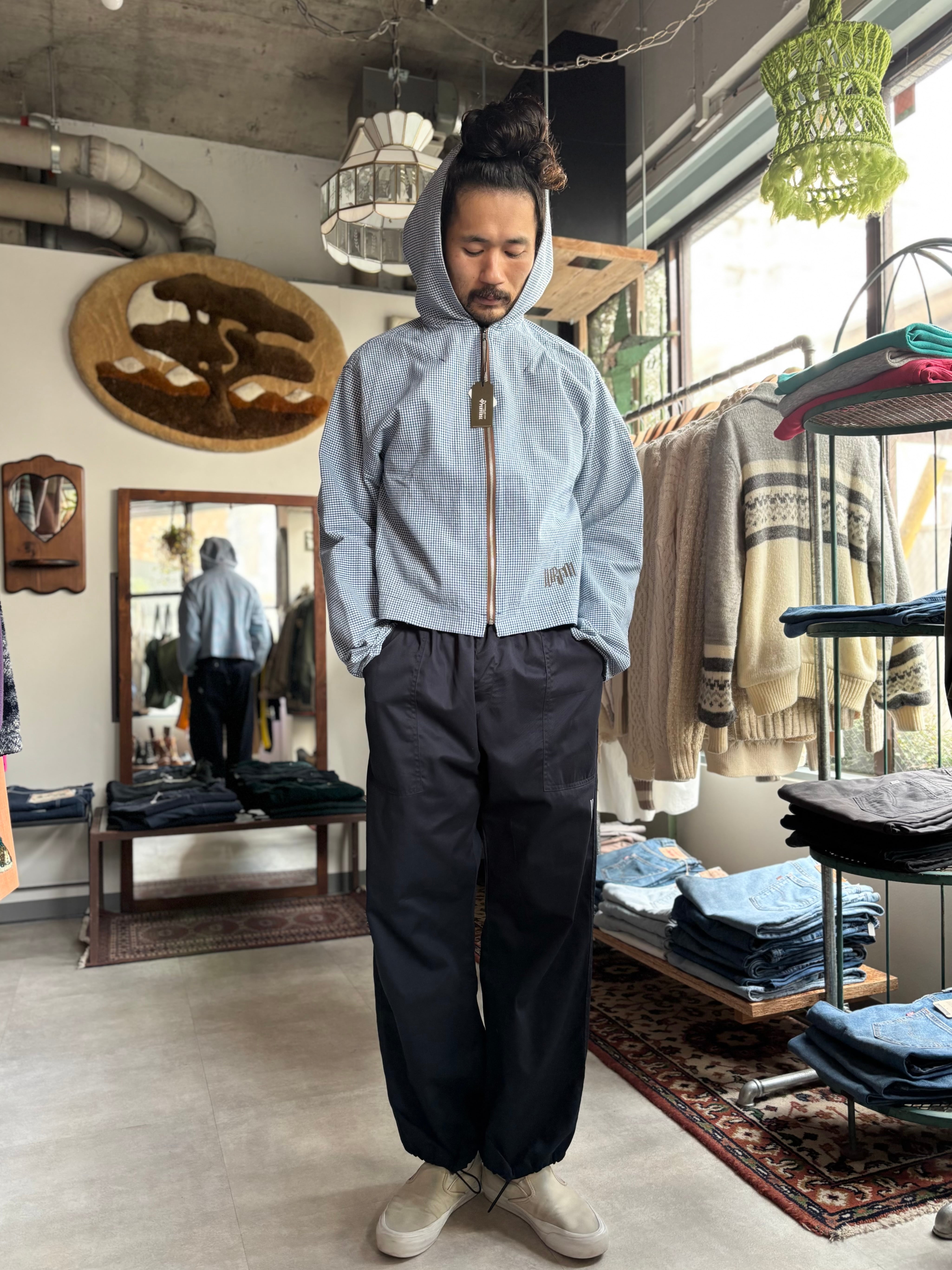 WEARABLE FILM.では全体の表現に必要なアイテムを不定期でリリースしており、そのアイテム達はモデル名を持ちません。こちらはギンガムチェックのシャツ地を採用したパーカーになっており、レトロな雰囲気とアクティブな空気感が同居したアイテム。デザイナーのTIPS自身がロゴグラフィックを製作しプリントを施しています。TIPSが愛用していた古着のコットンパーカーが着れなくなってしまい、それならWEARABLE FILM.らしくサンプリングしよう。と製作することになった、WEARABLE FILM.では珍しい製作過程のアイテムになっています。