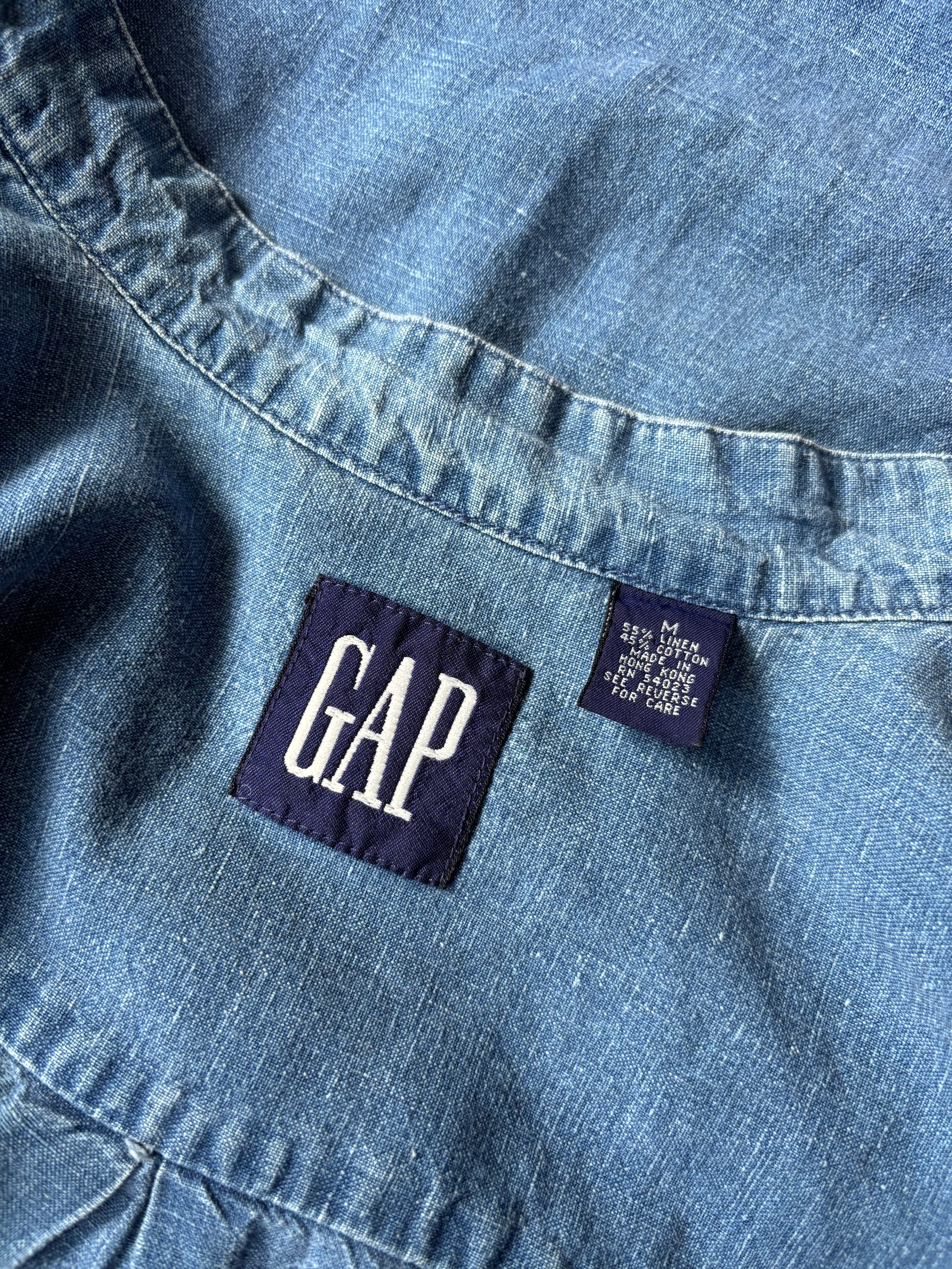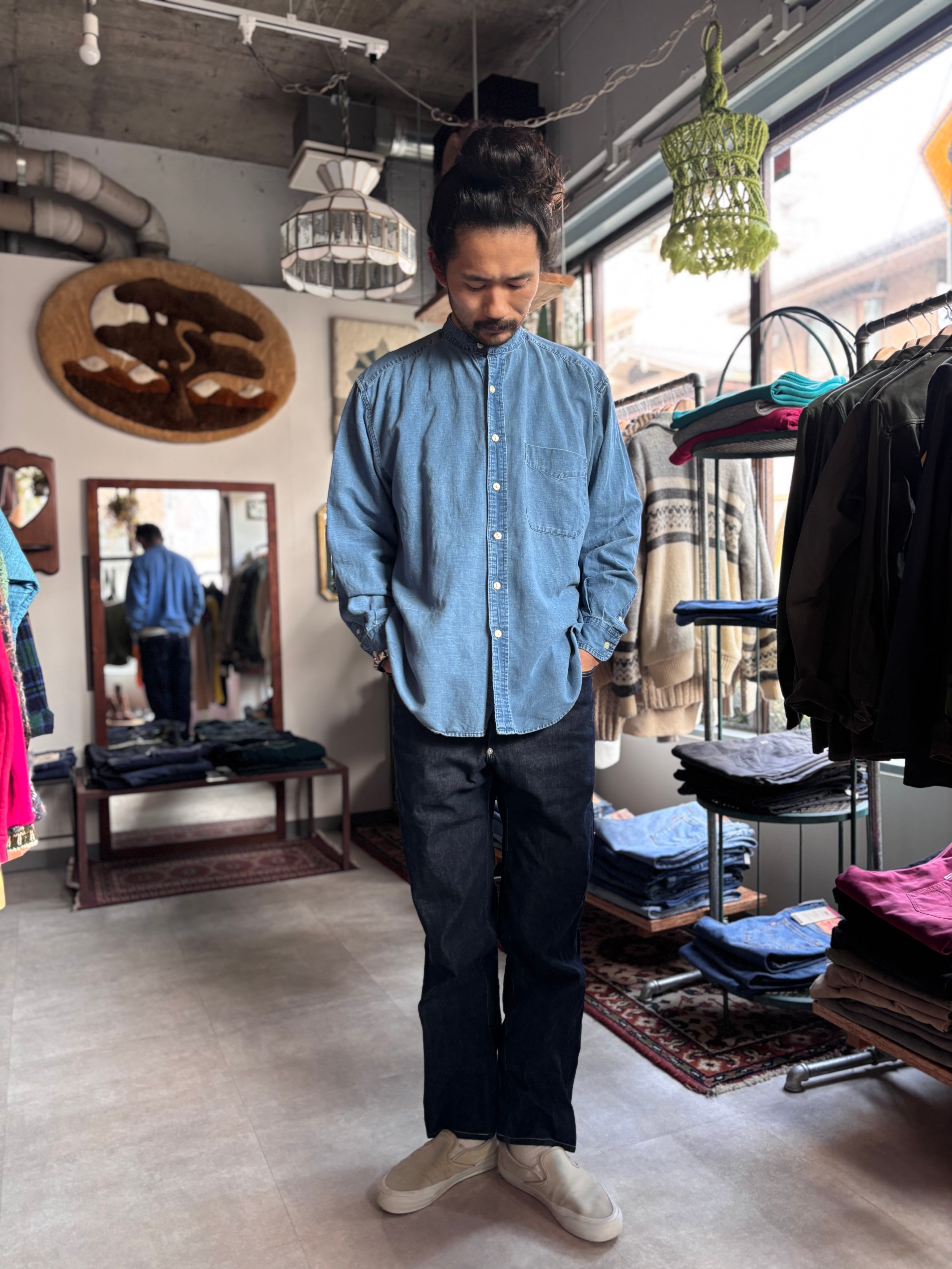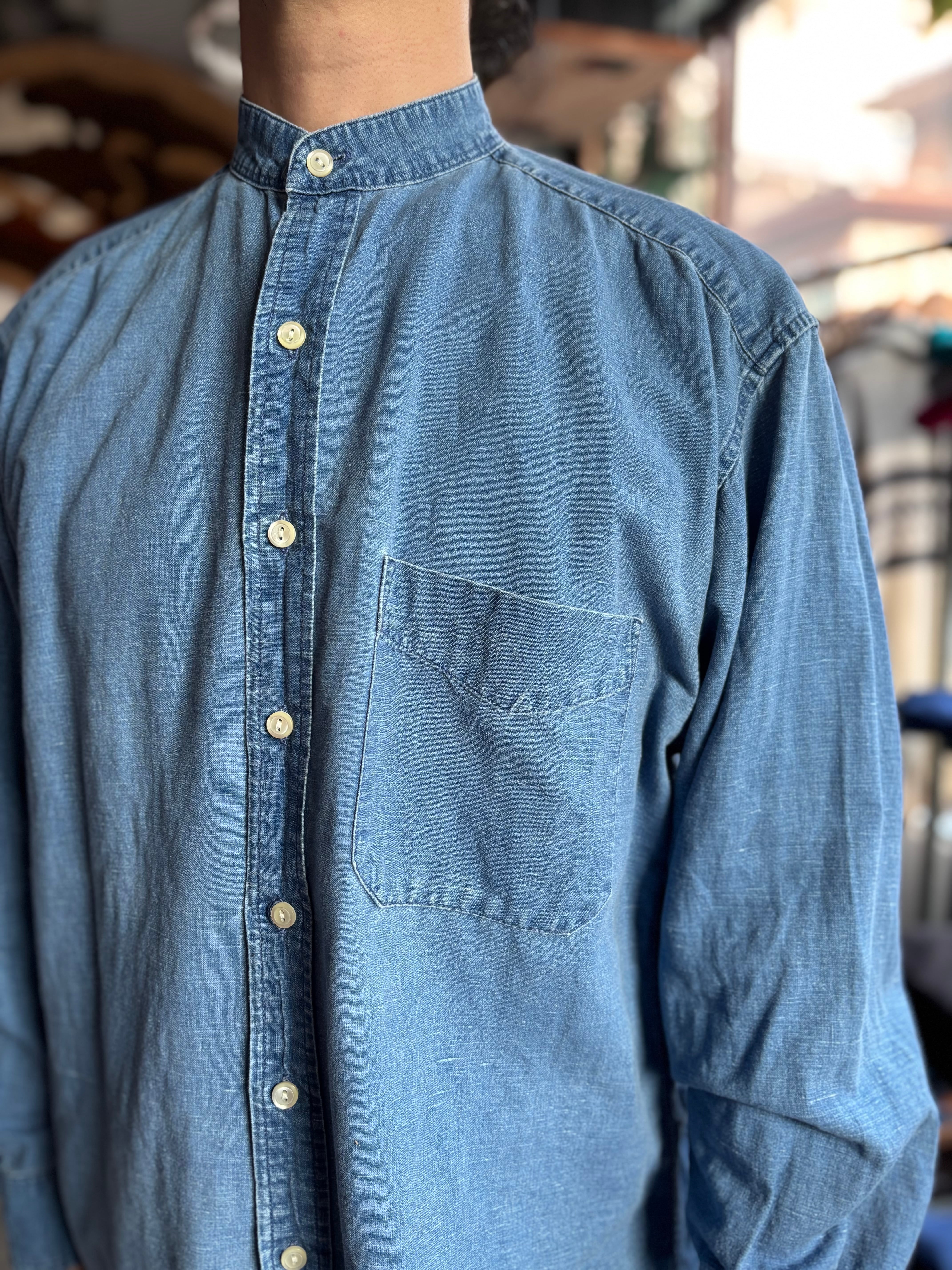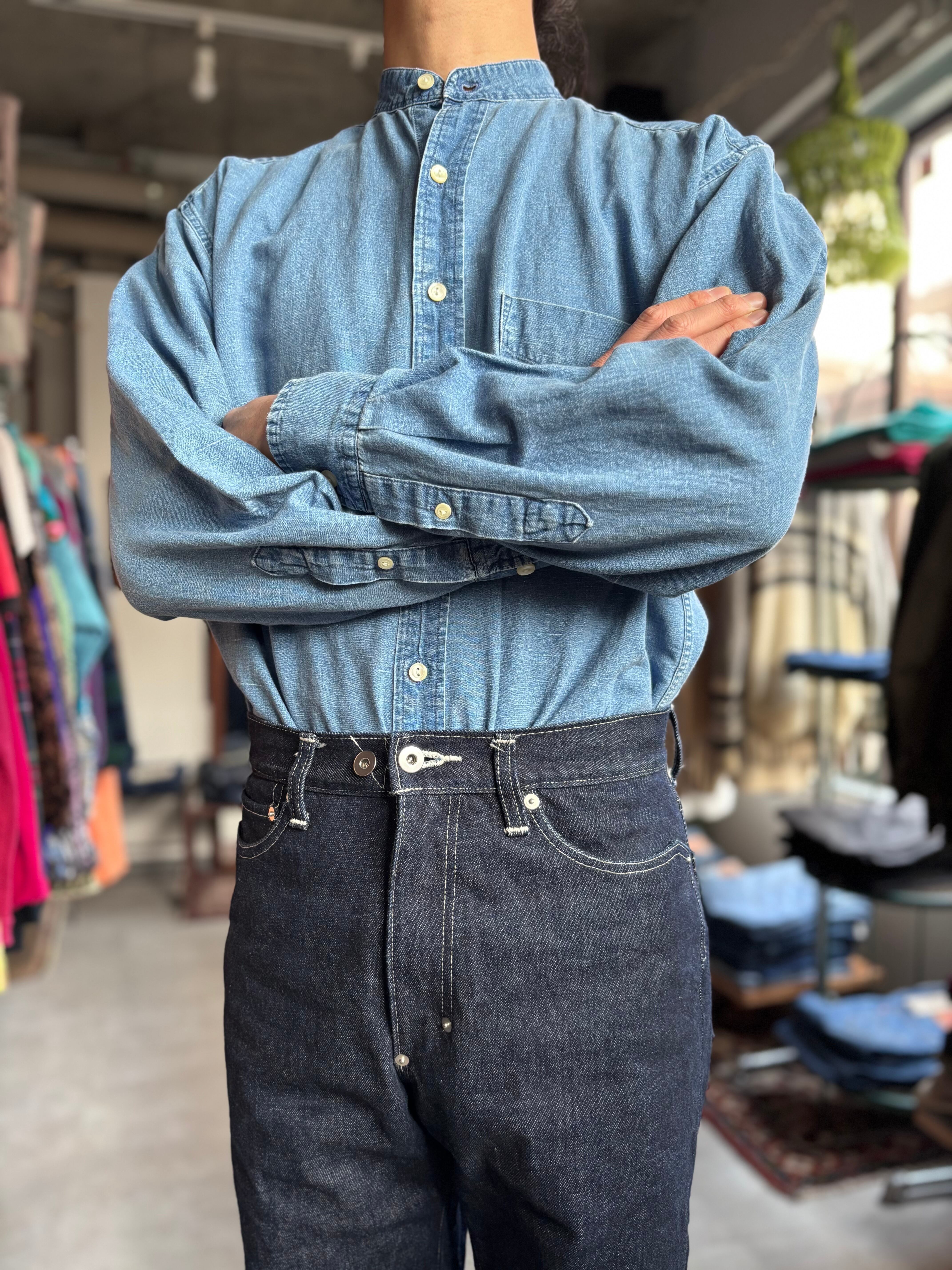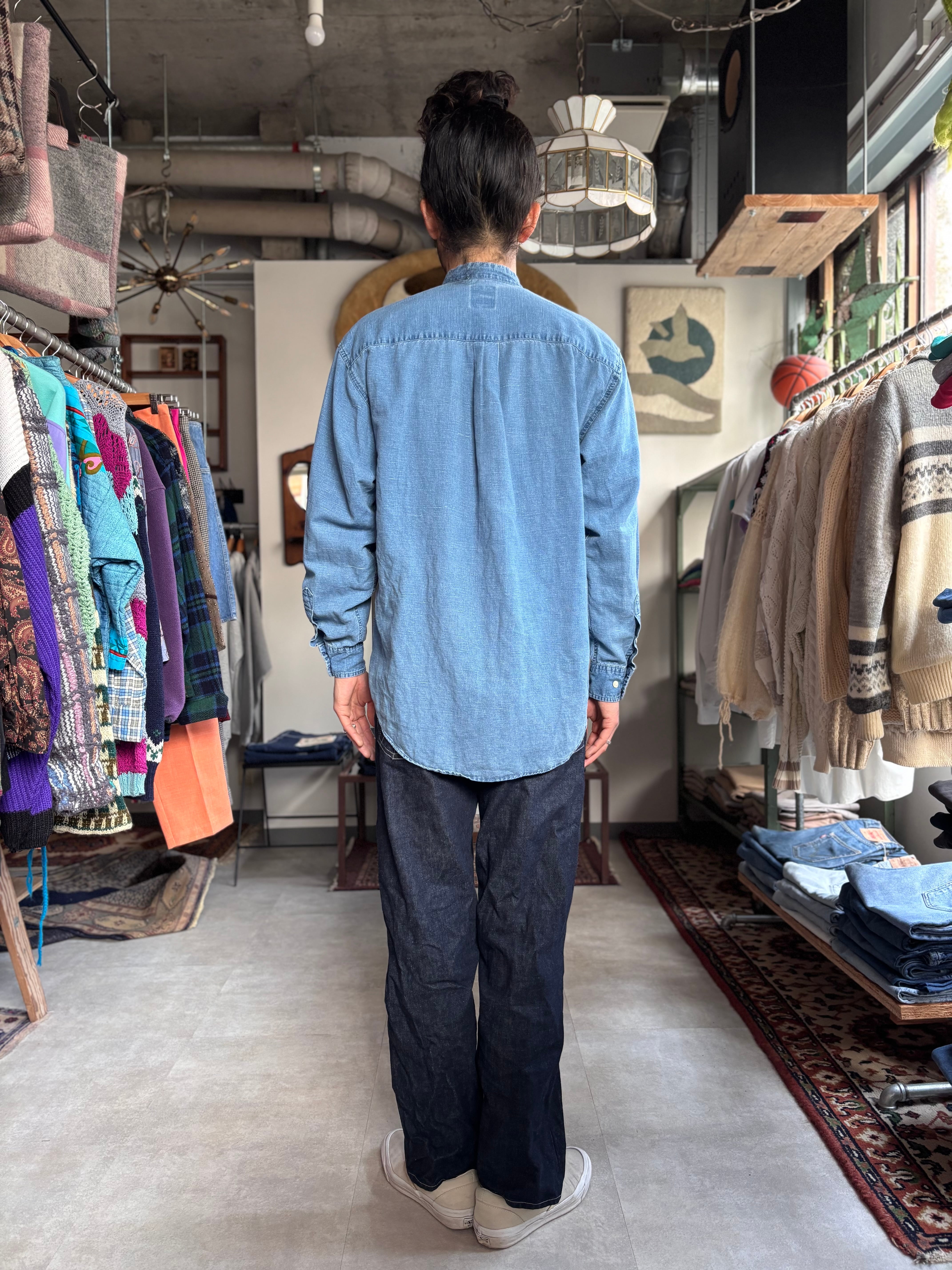 コットンリネン素材。オーセンティックフィット。色落ちした生地にスタンドカラー仕様が雰囲気あります。