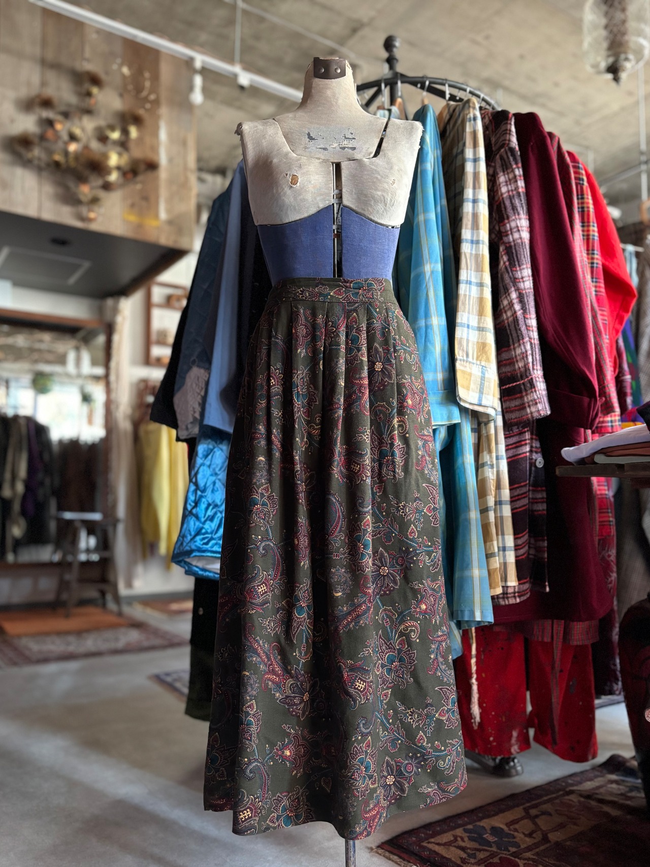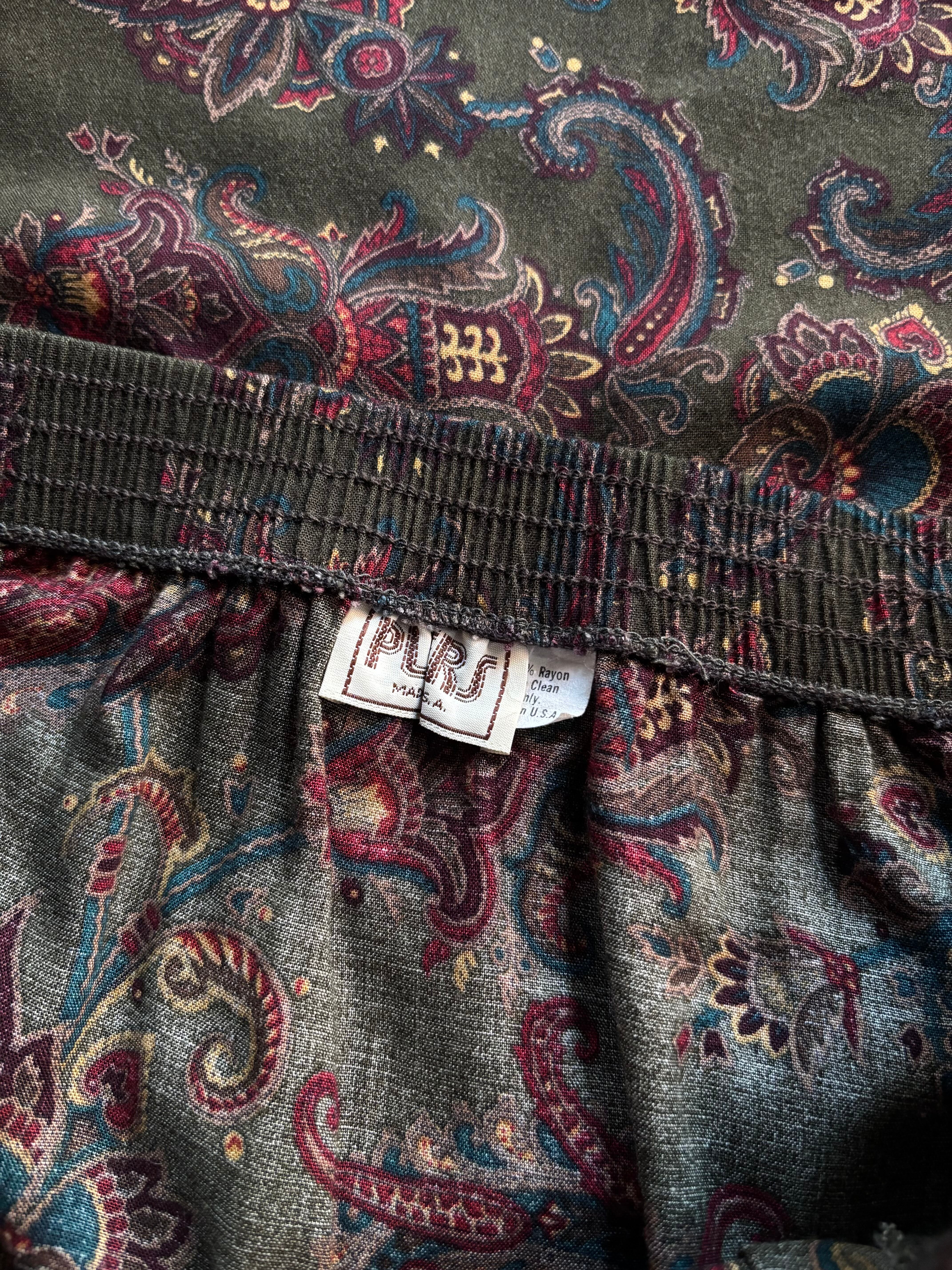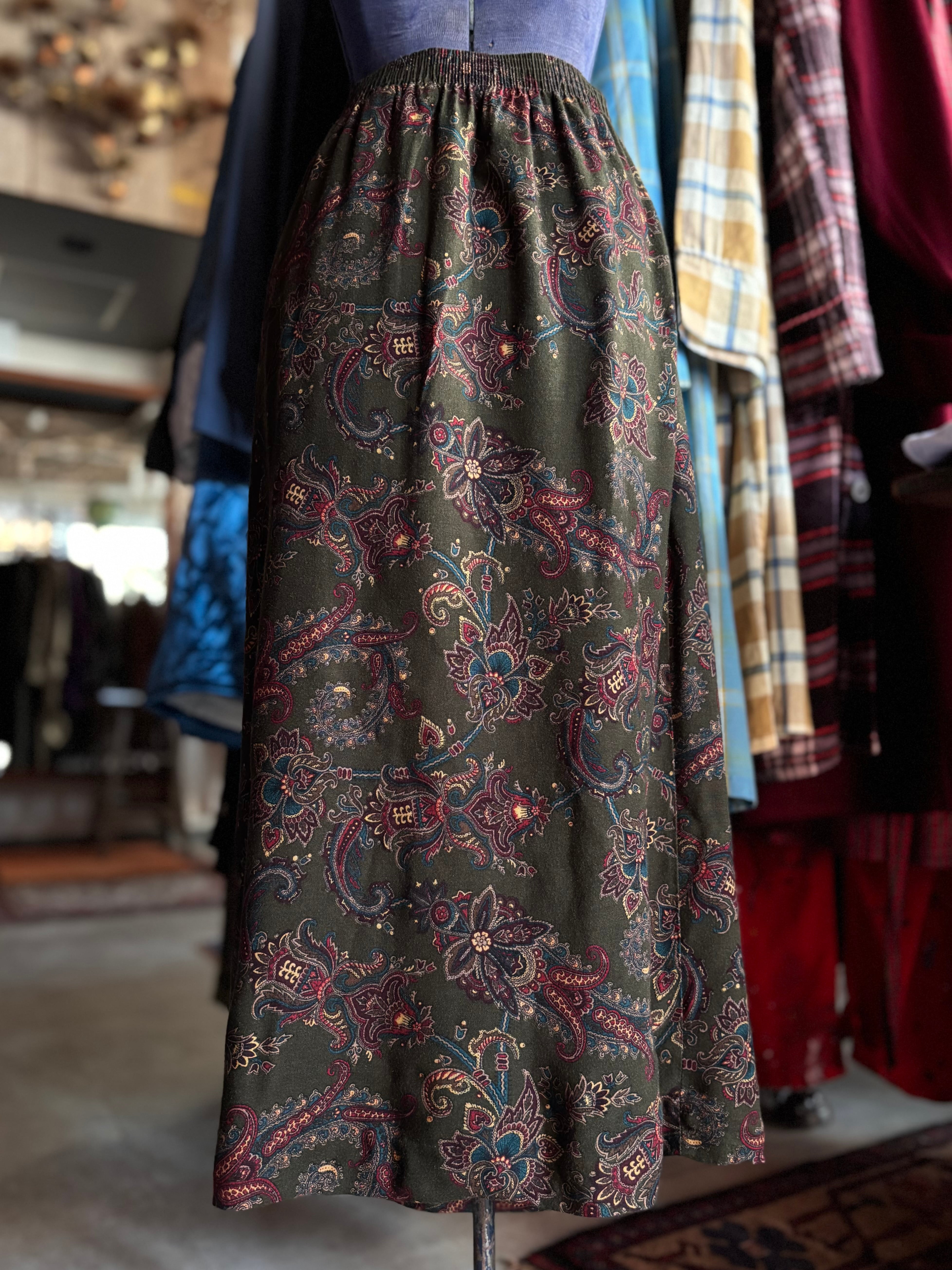 レーヨン生地。バックゴム仕様、ポケット付き。落ち着いたオリーブのペイズリー総柄。カラータイツと合わせていかがでしょうか。