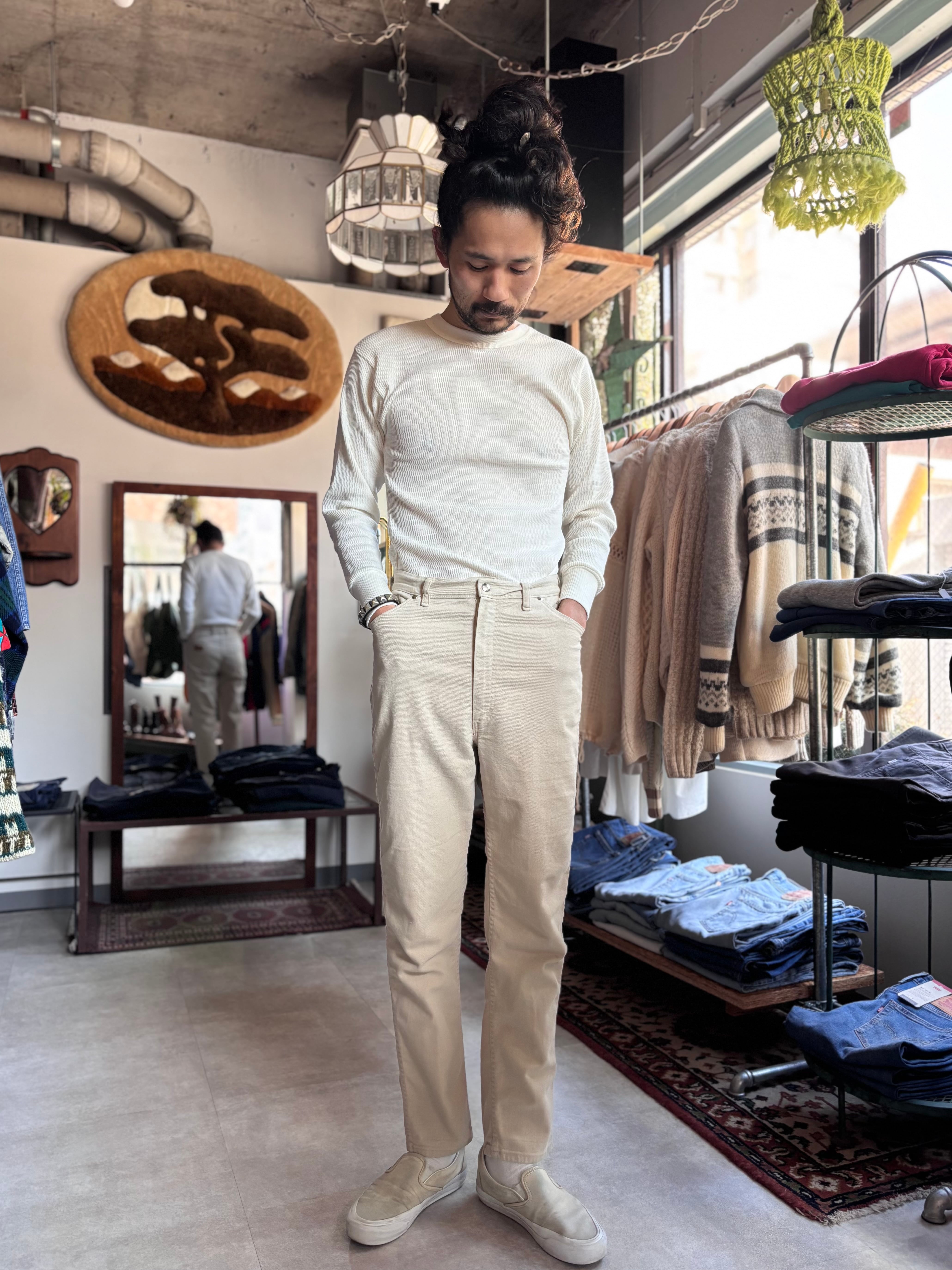 ストレッチのコットンツイル。股上の深いテーパードシルエット。ウィメンスモデルですが男性にもおすすめのビンテージパンツです。