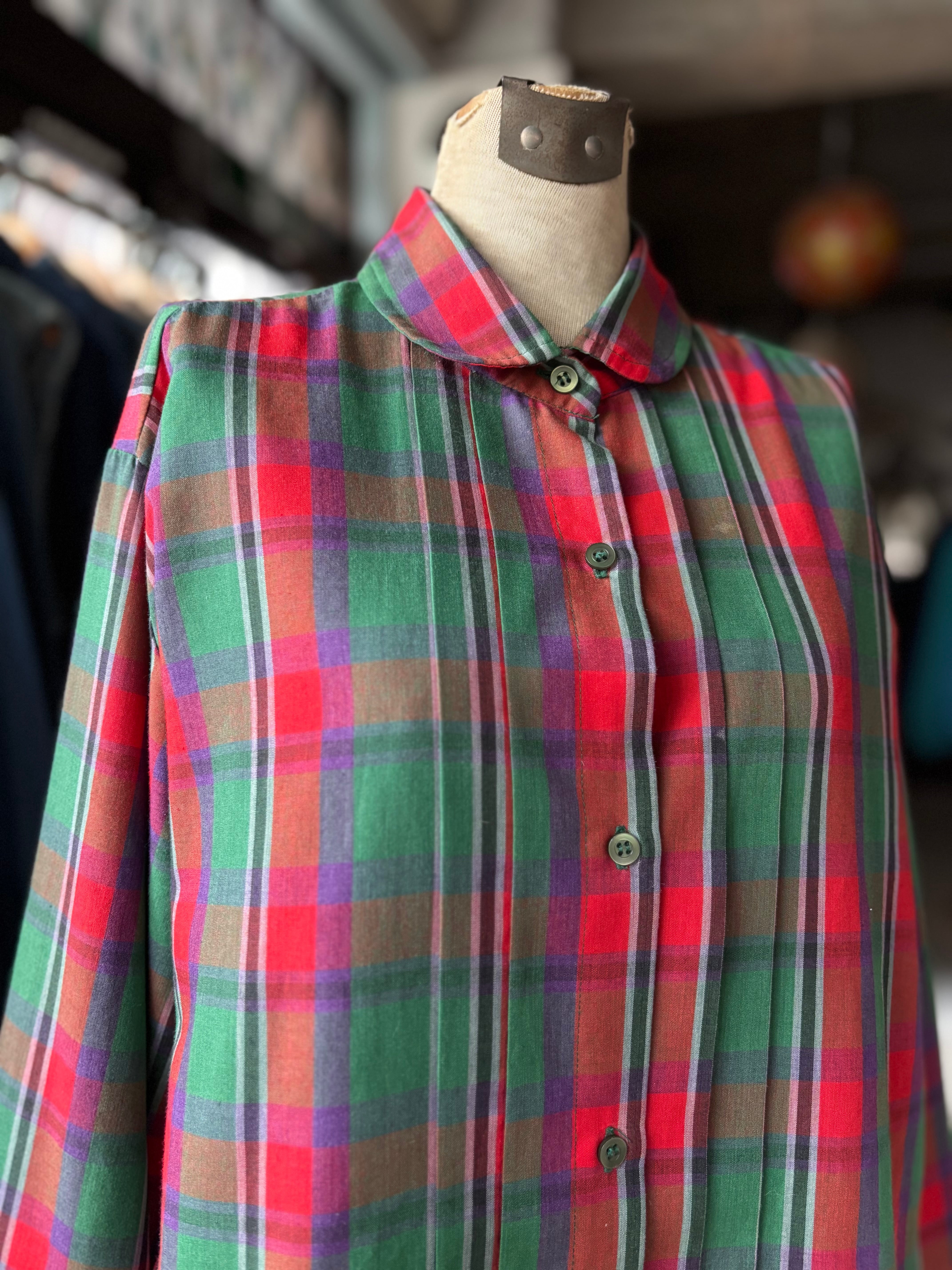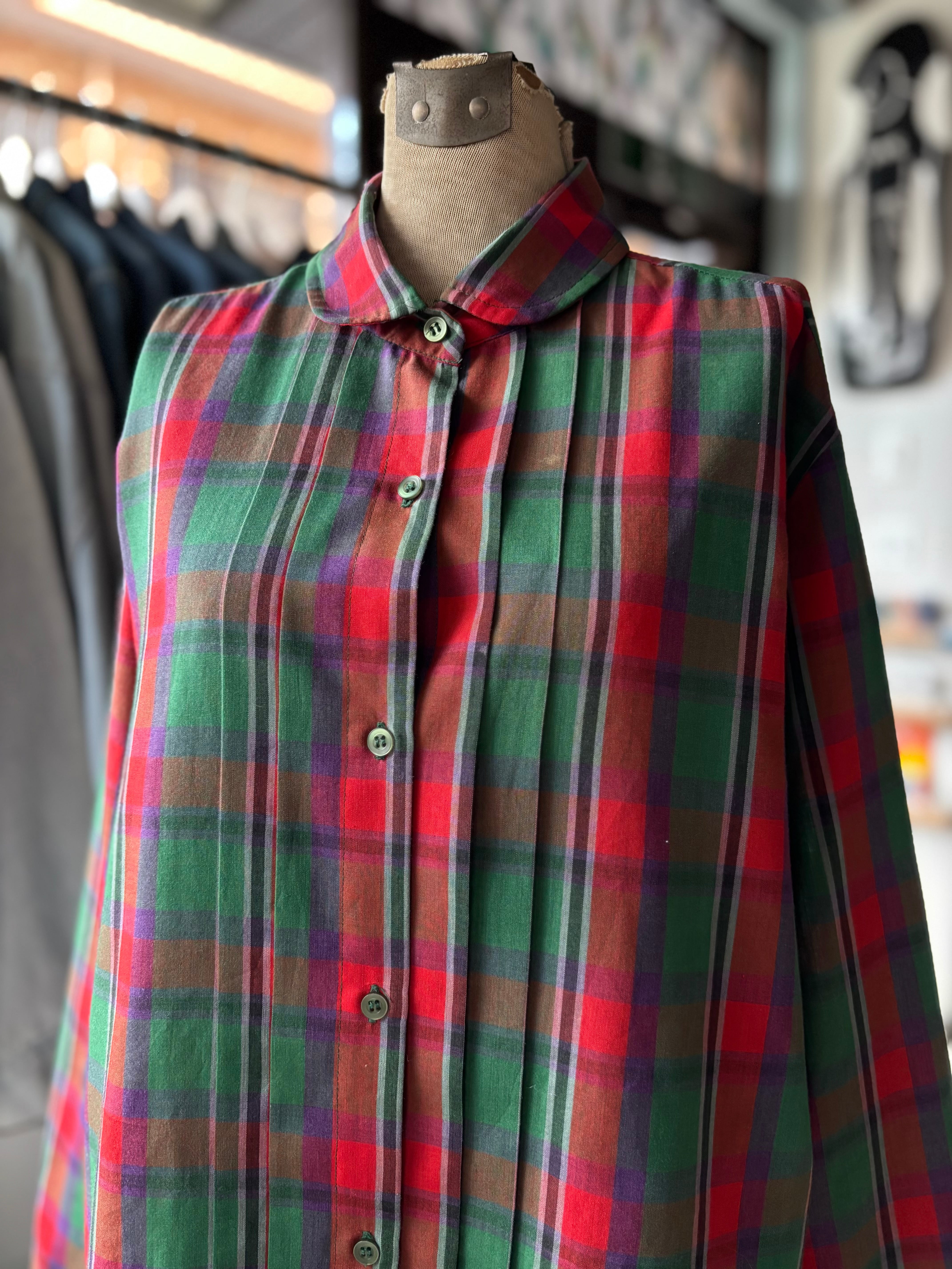 コットンポリ素材。リラックスフィット。ラウンドカラーに、フロントはプリーツデザイン。