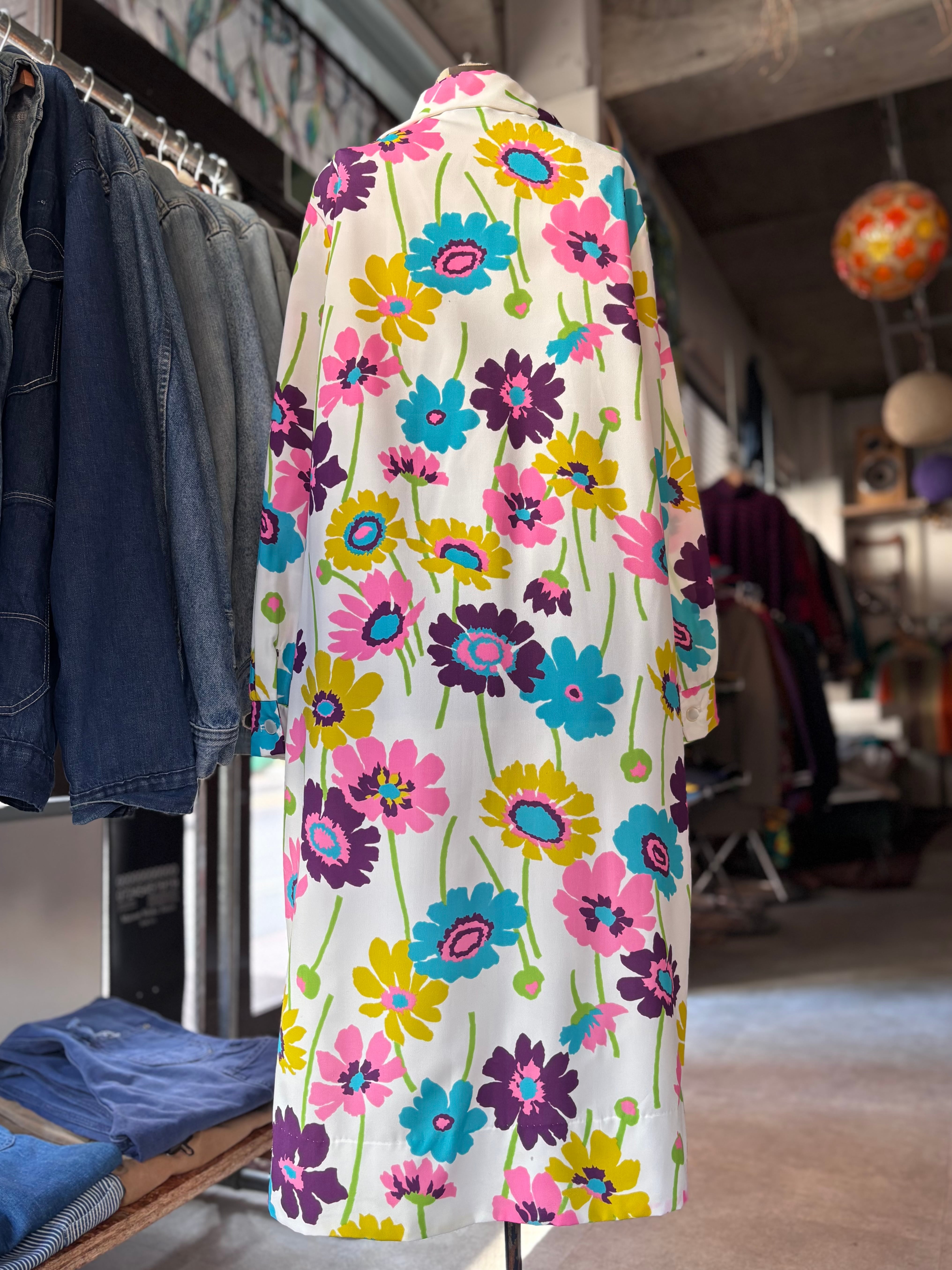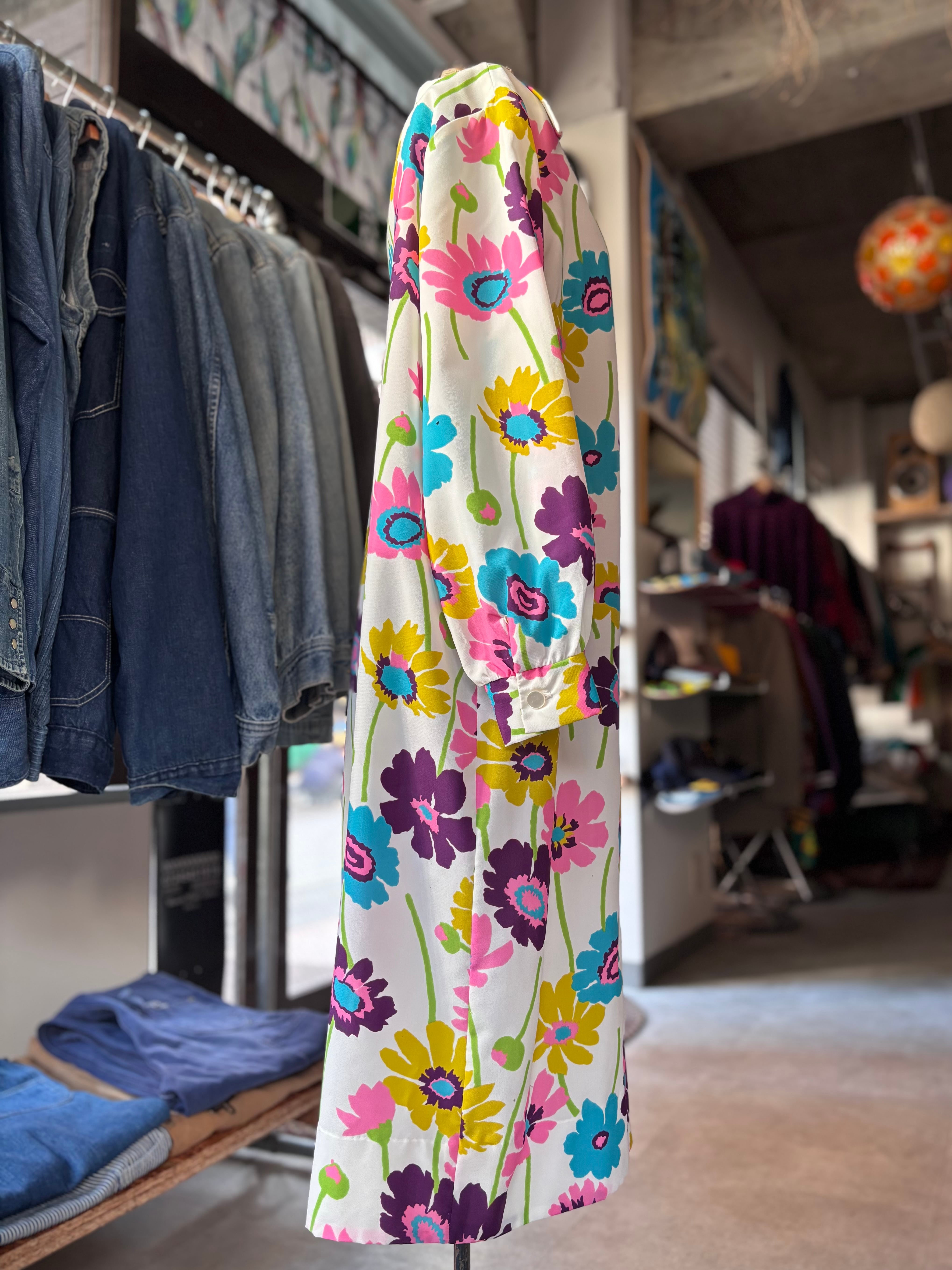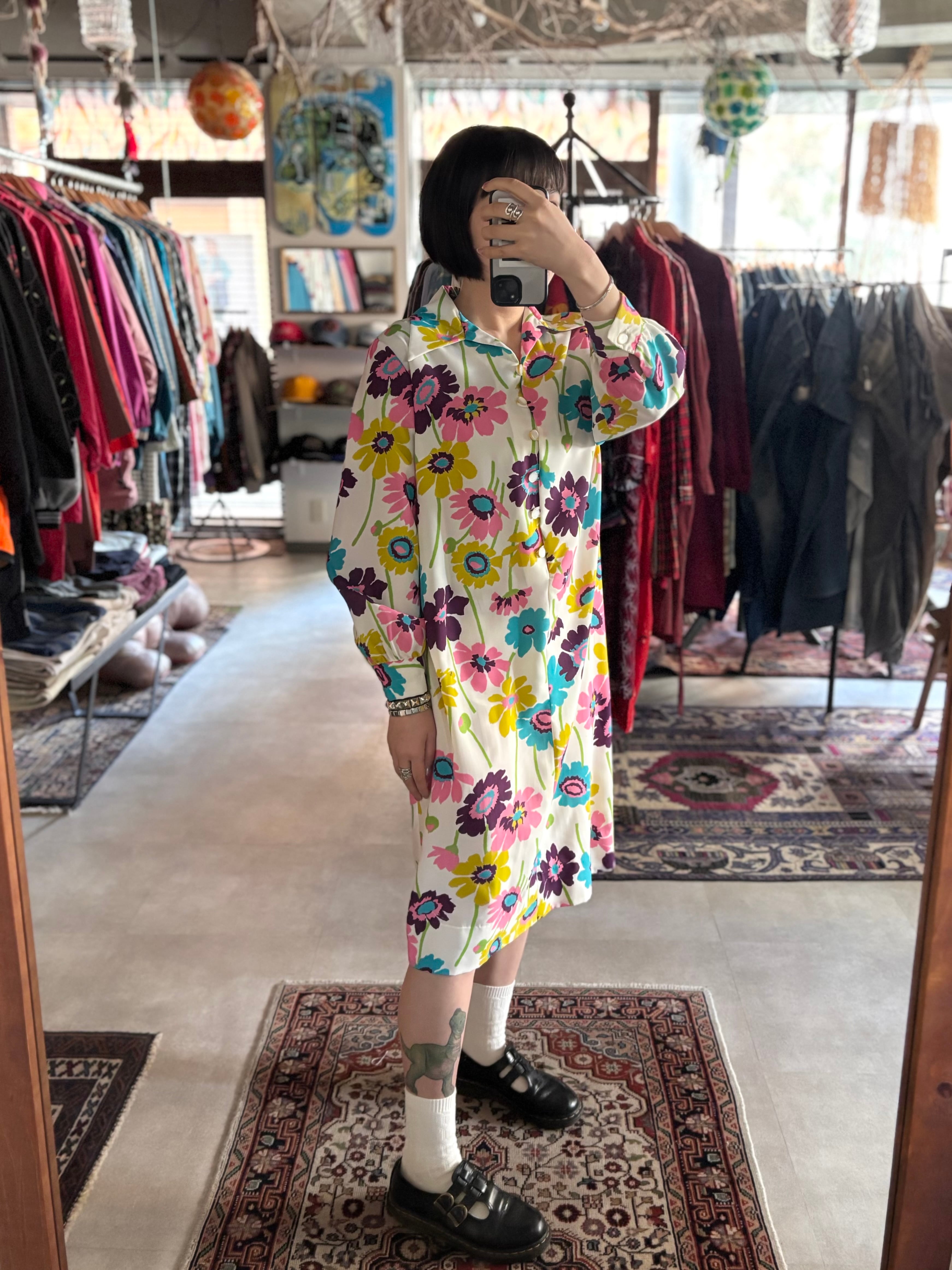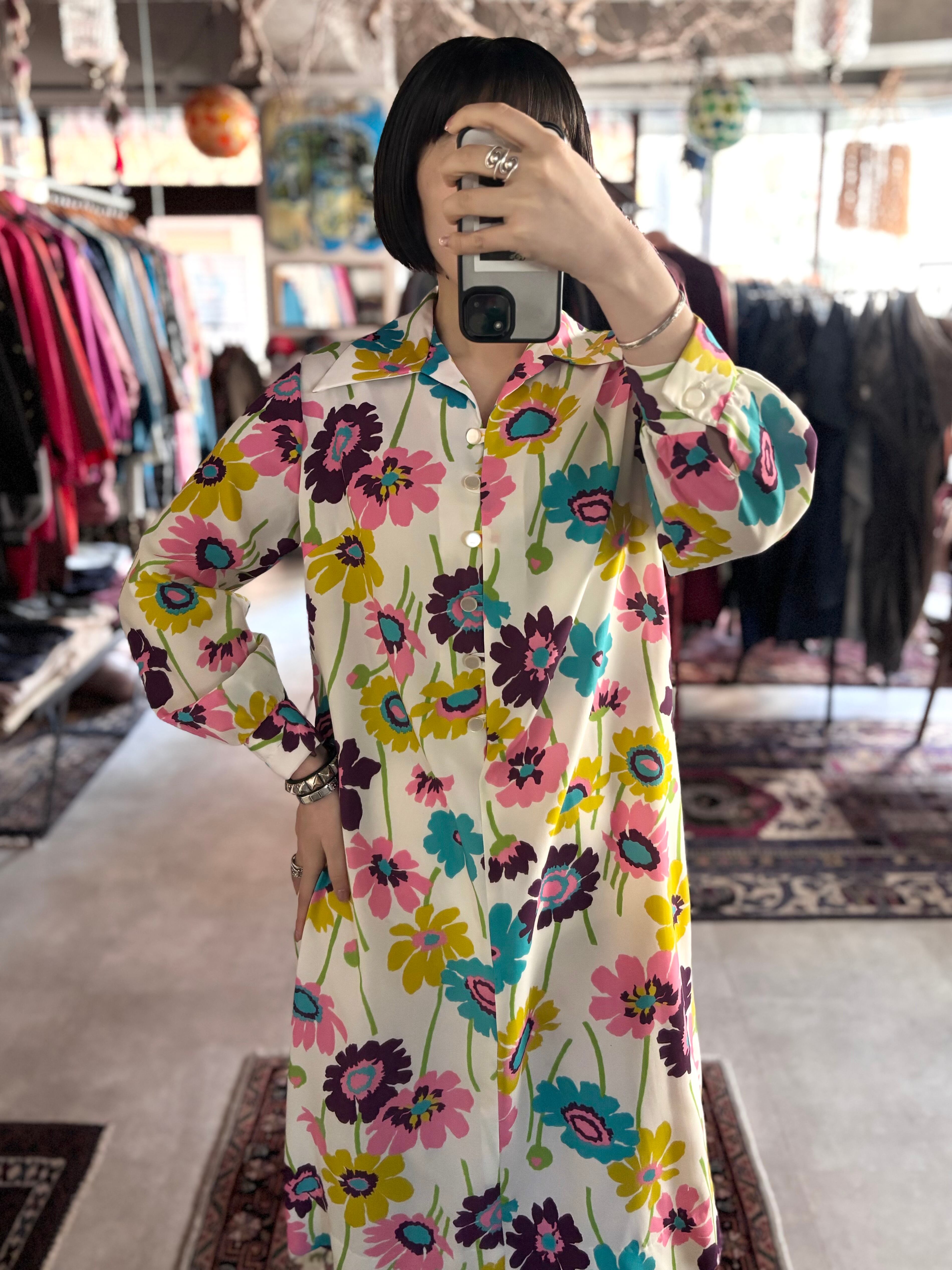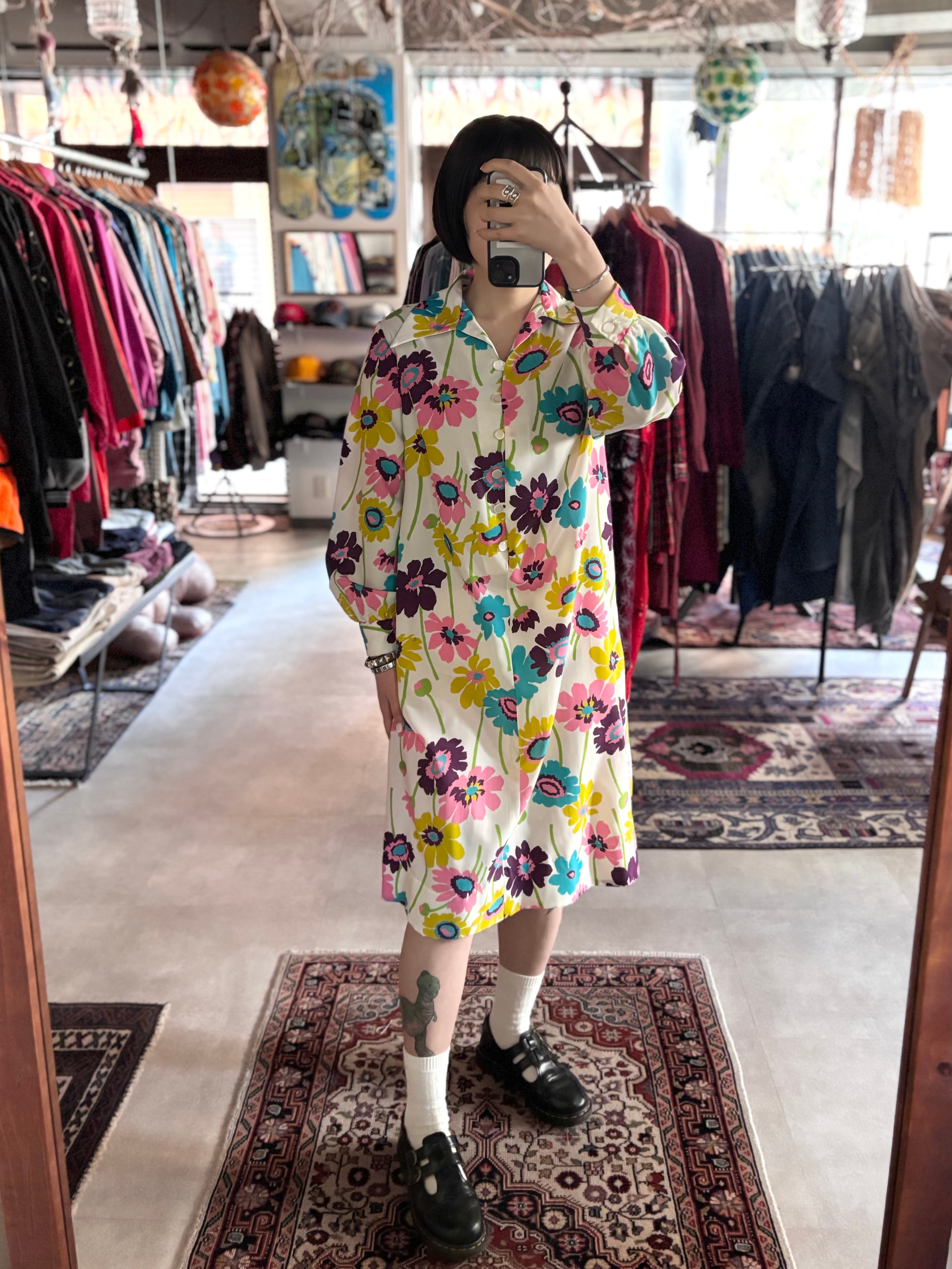 レトロなフラワープリントファブリック。オーセンティックフィット。開襟仕様です。大人におすすめのサイケデリックワンピースです。