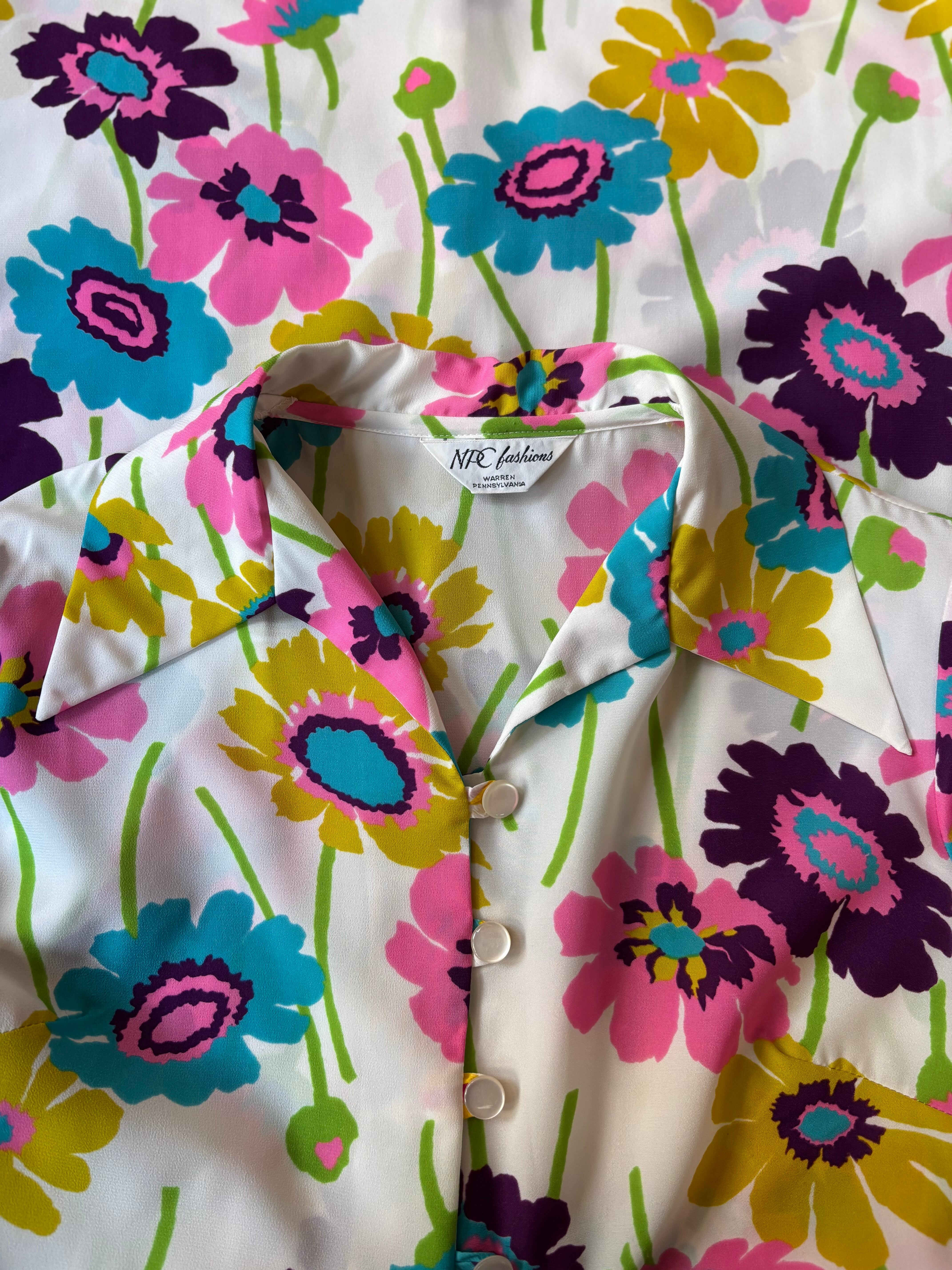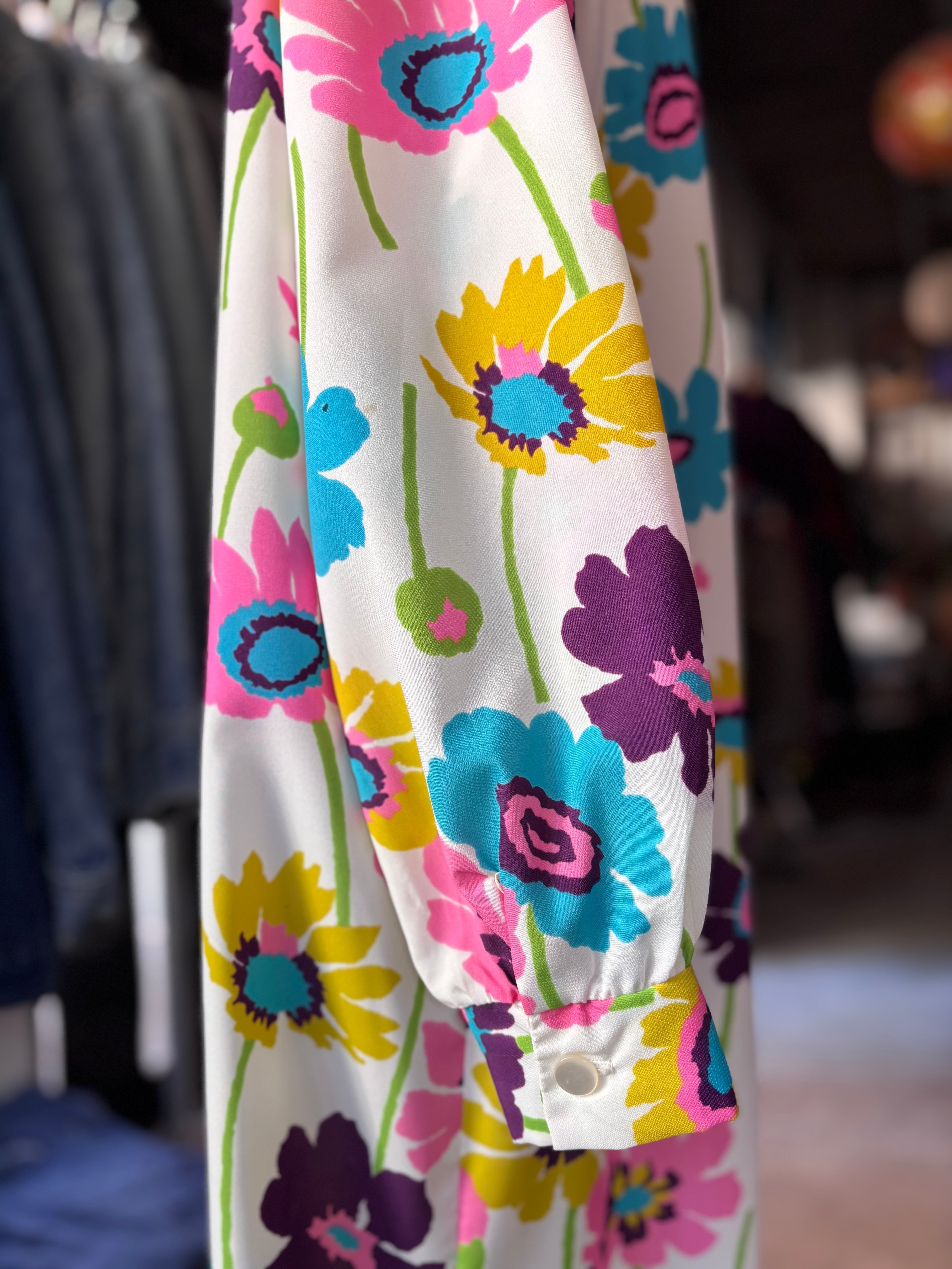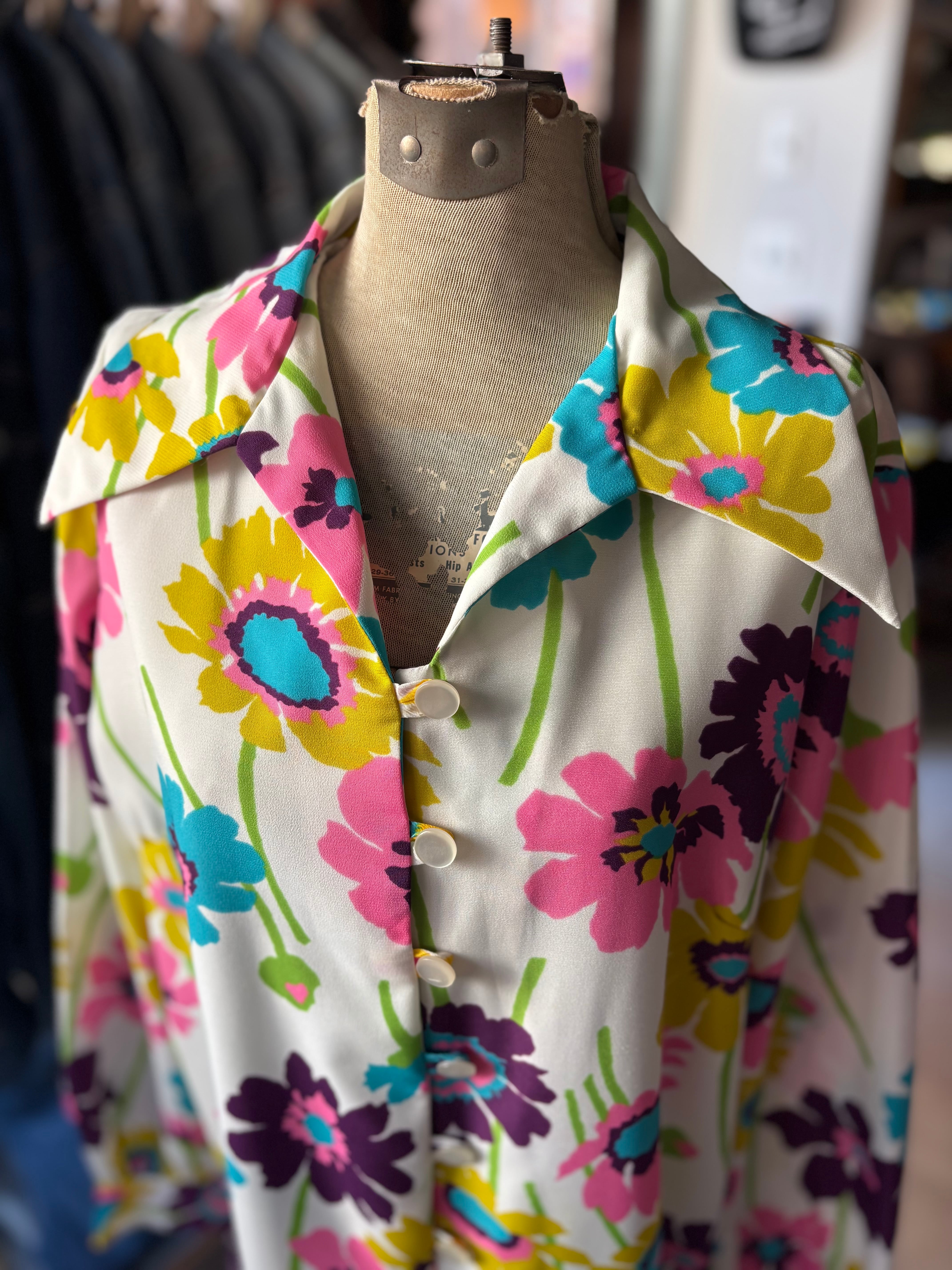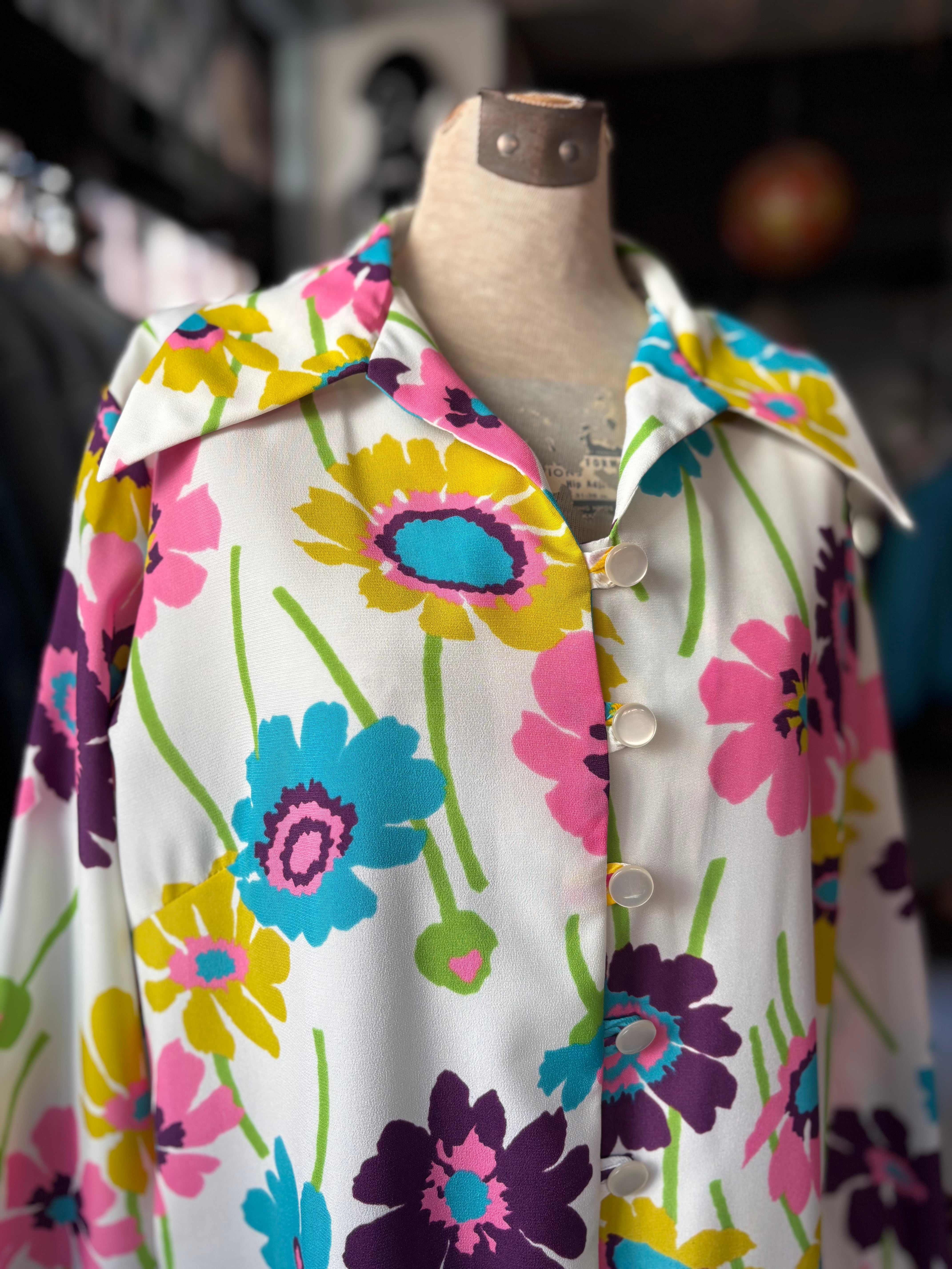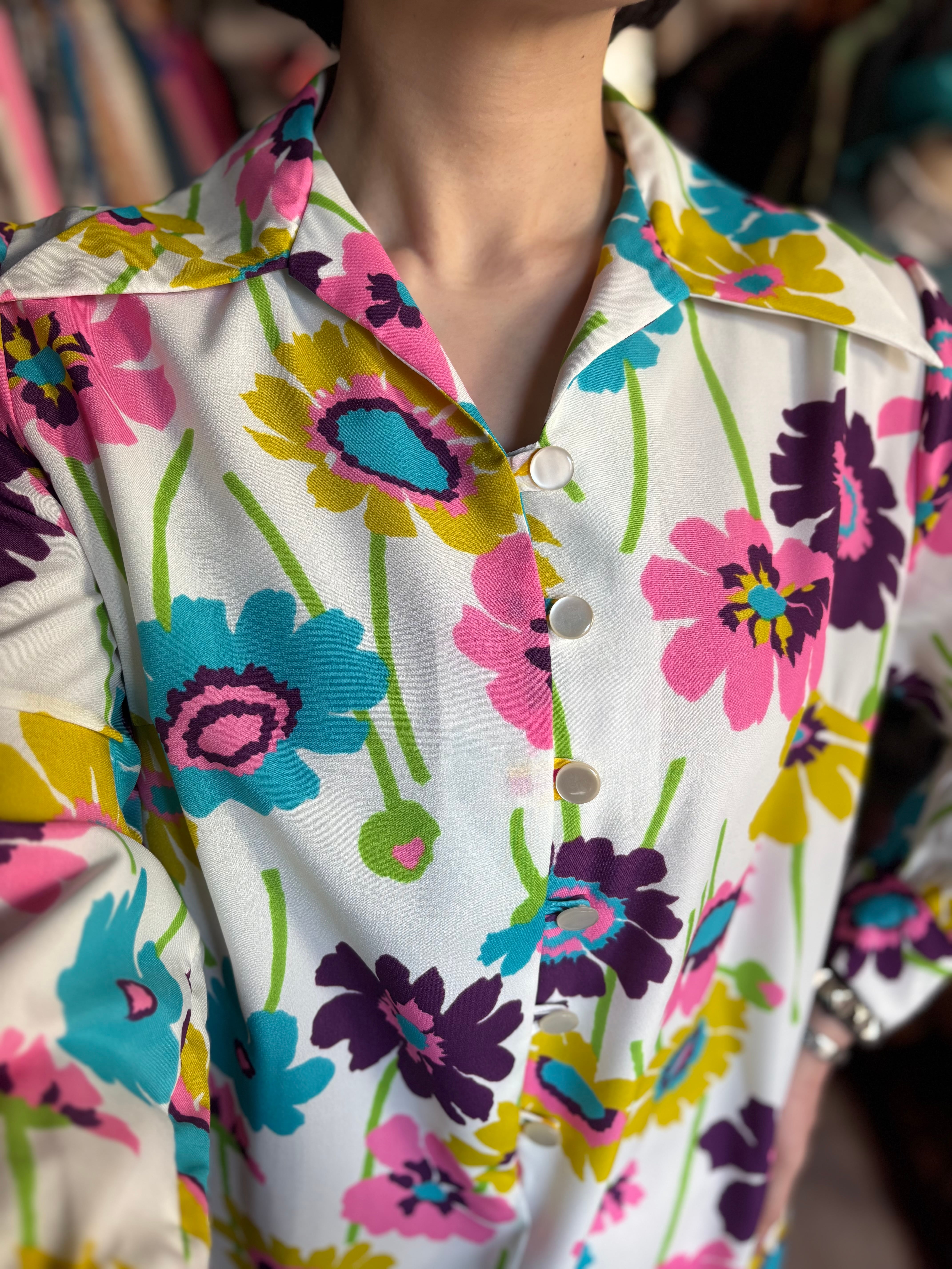 レトロなフラワープリントファブリック。オーセンティックフィット。開襟仕様です。大人におすすめのサイケデリックワンピースです。