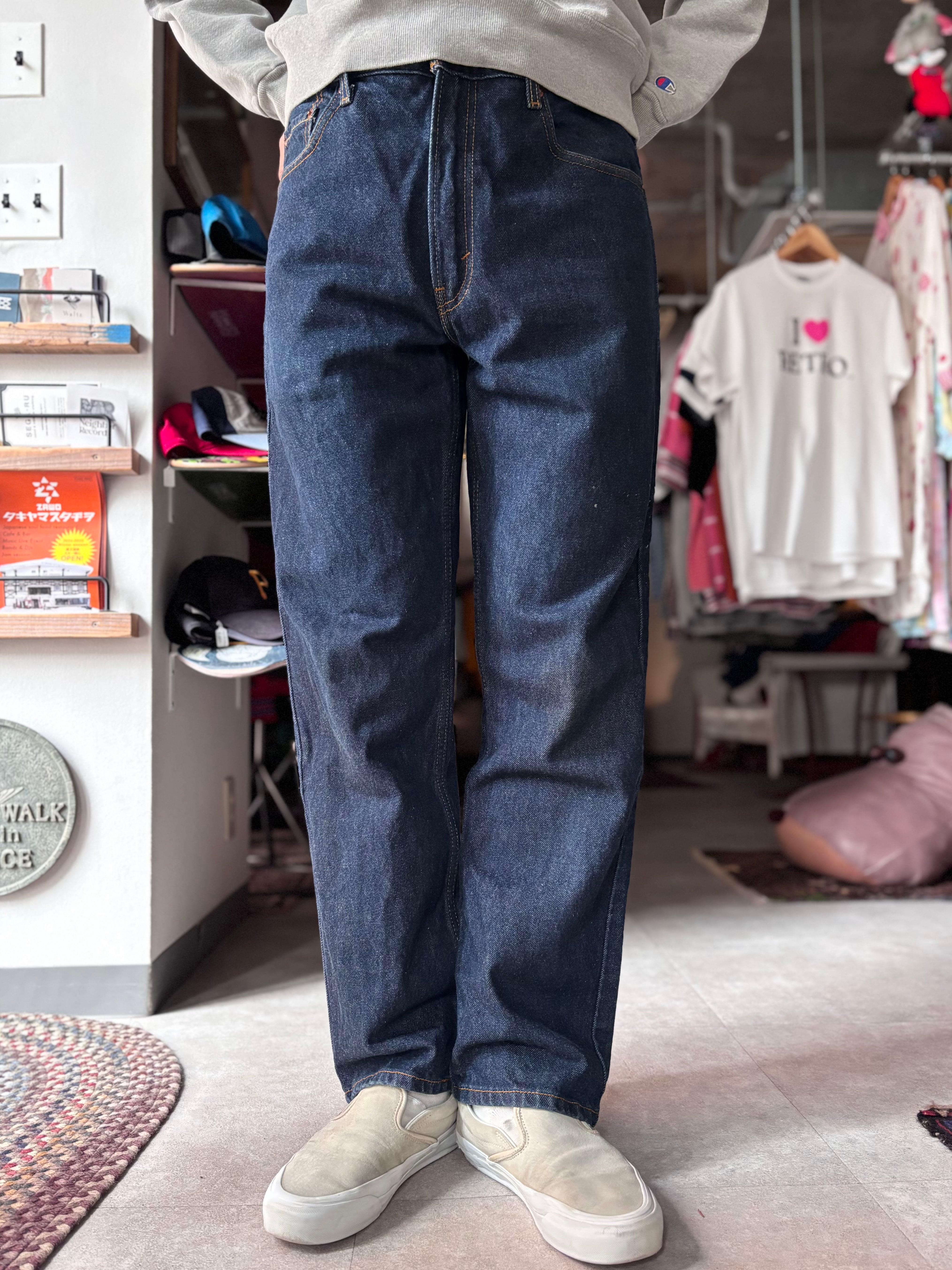 色の残ったブルーデニム。テーパードシルエット。自然なブリーチ跡が良い風合いです。