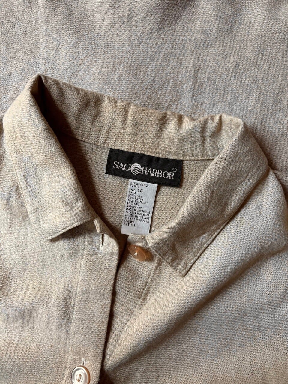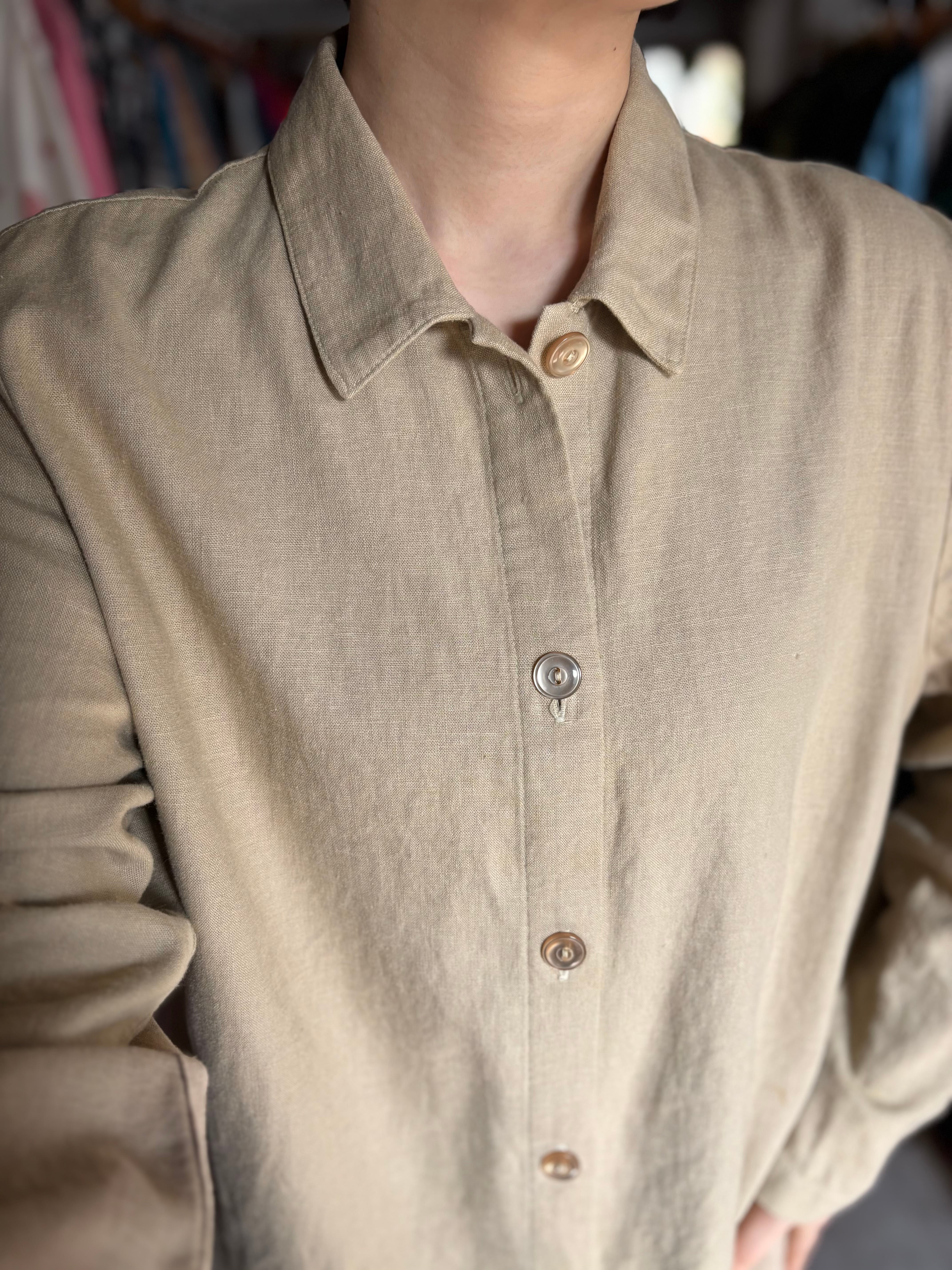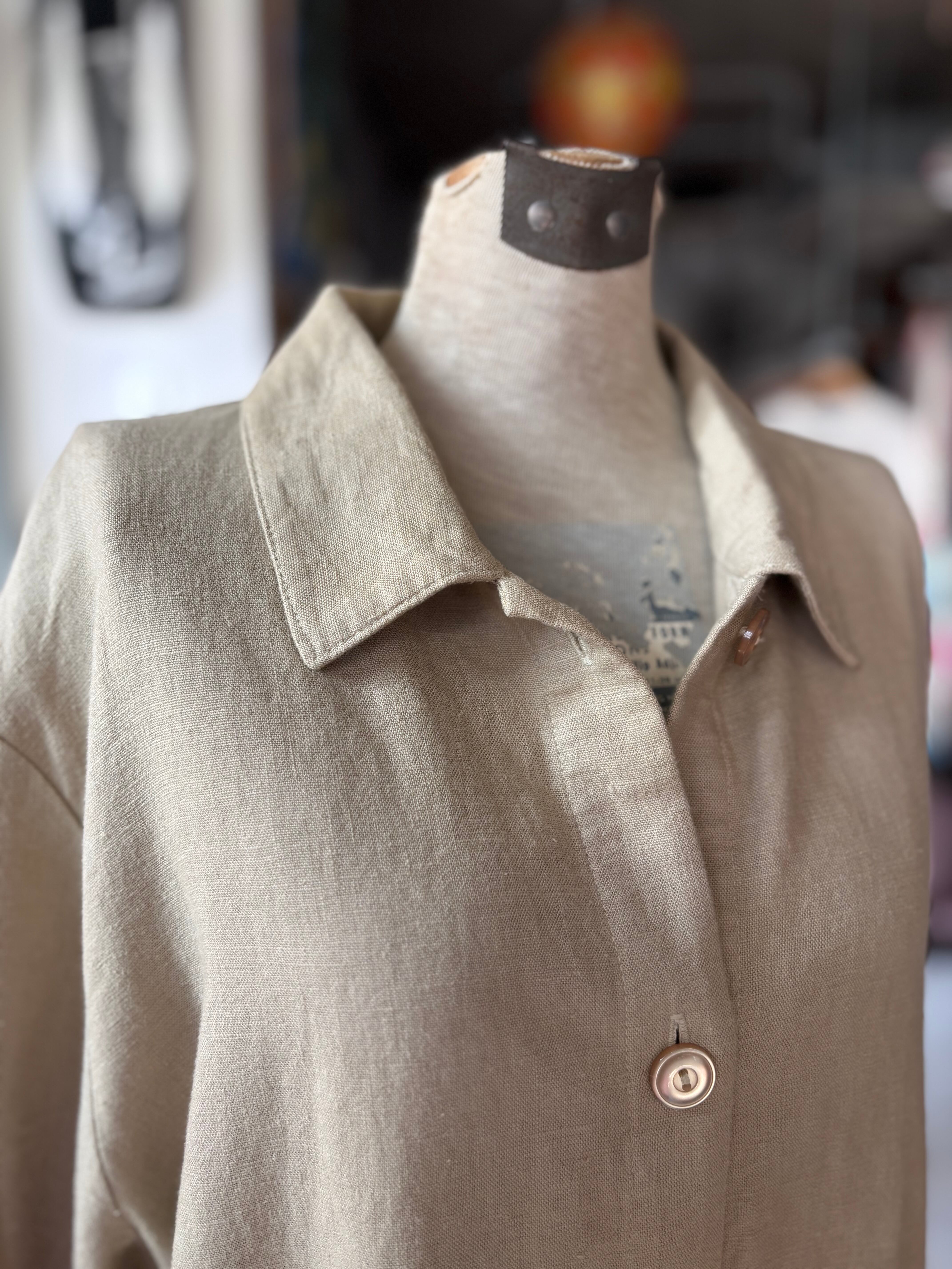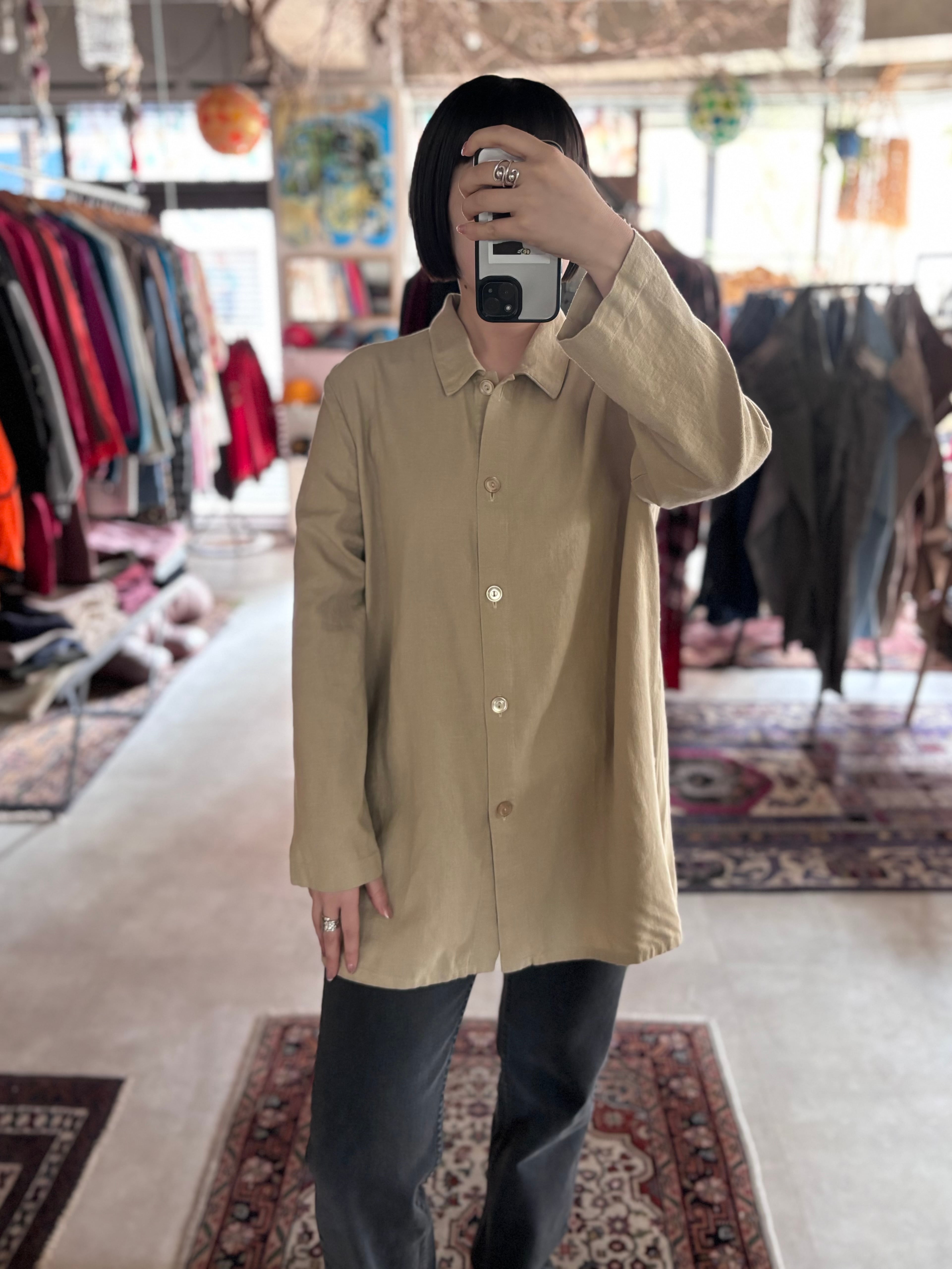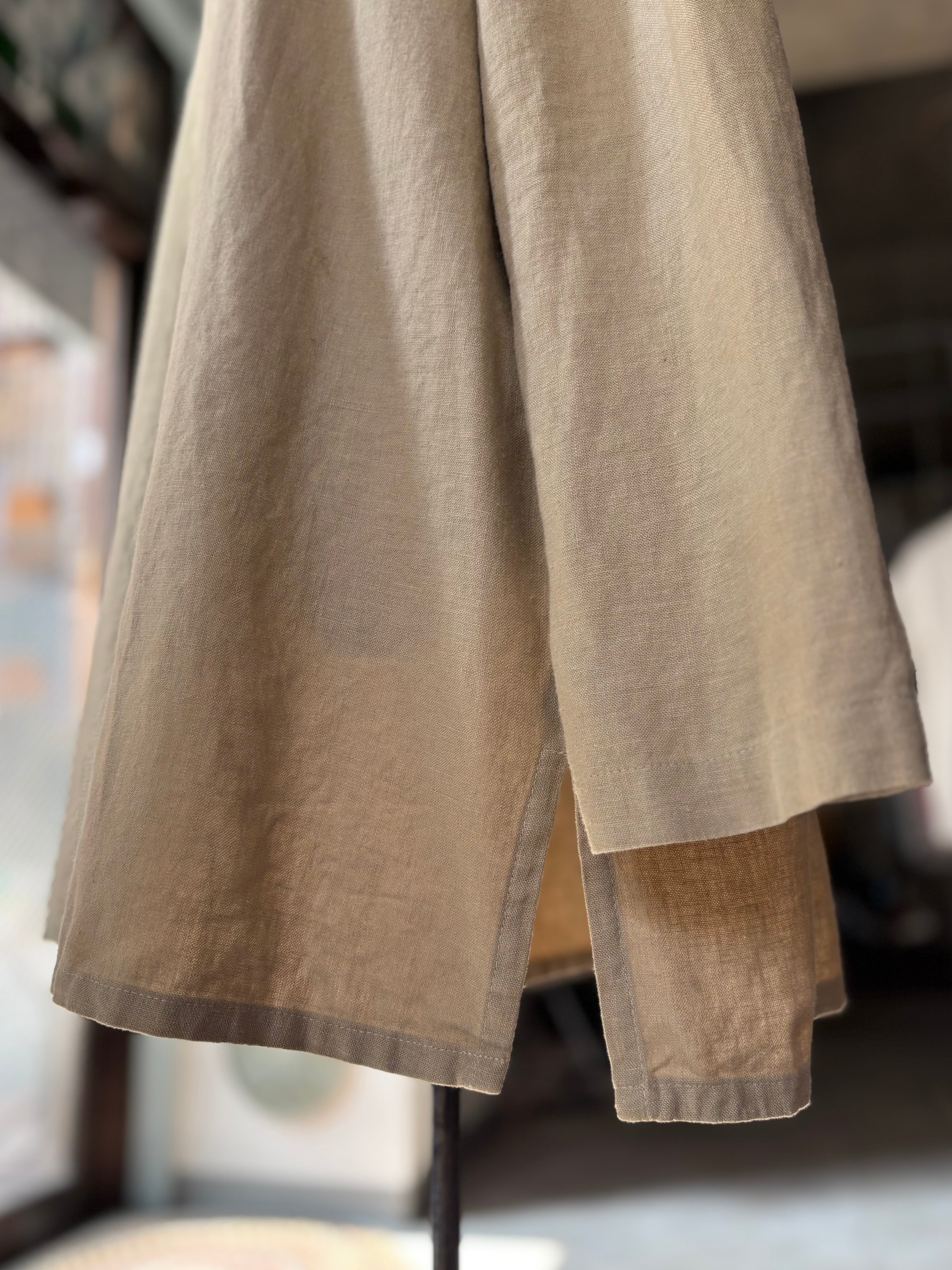 厚手のリネンレーヨン素材。リラックスフィット。羽織りとして使い易い太めの袖です。