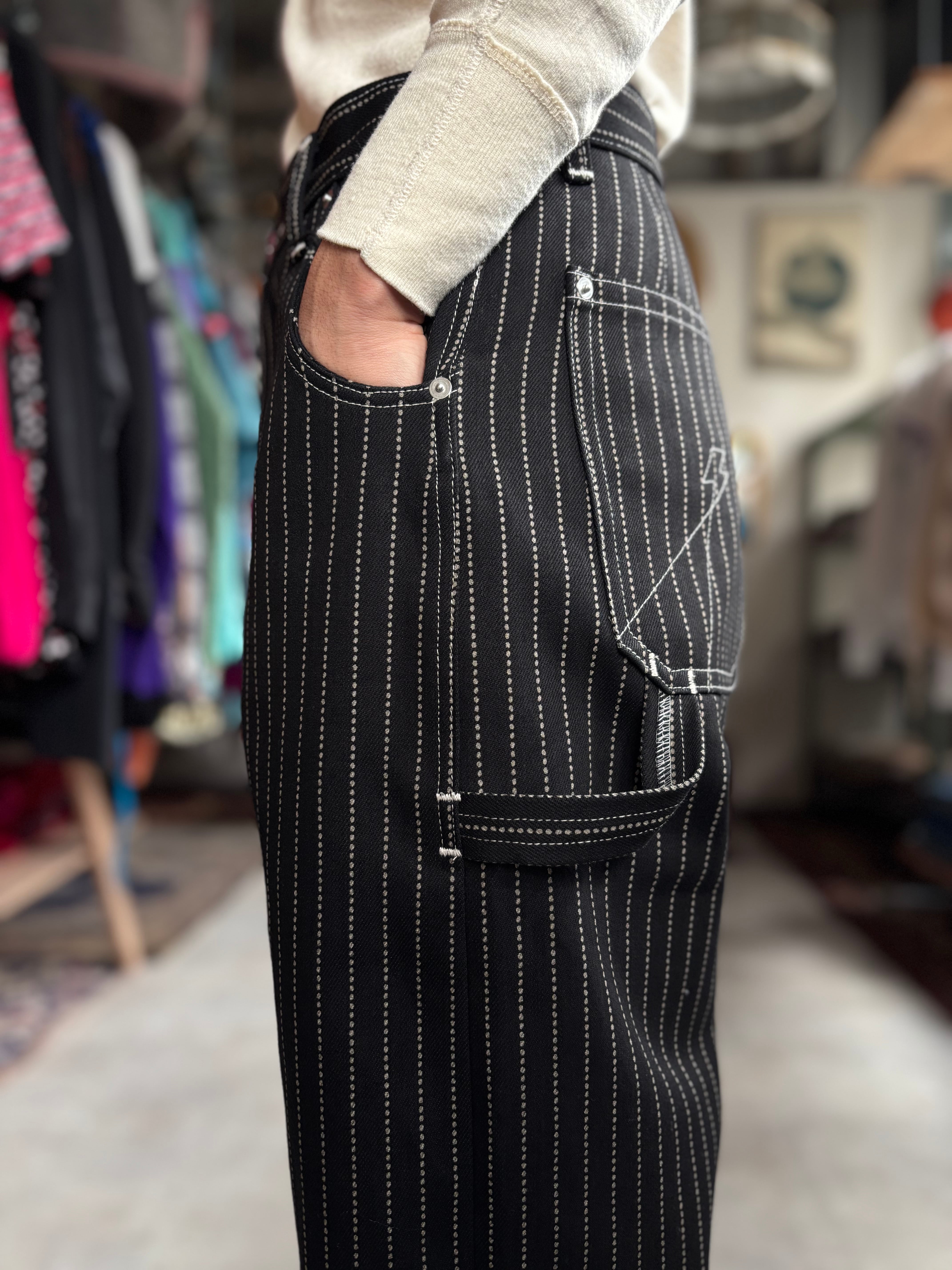 左右のポケットを非対称にデザインし、稲妻からステッチが上下左右に伸びていますが、これは、『古着屋という枠に収まらないショップ』という、WF.デザイナーTIPSから見たBEAGLEの世界感を表現しています。