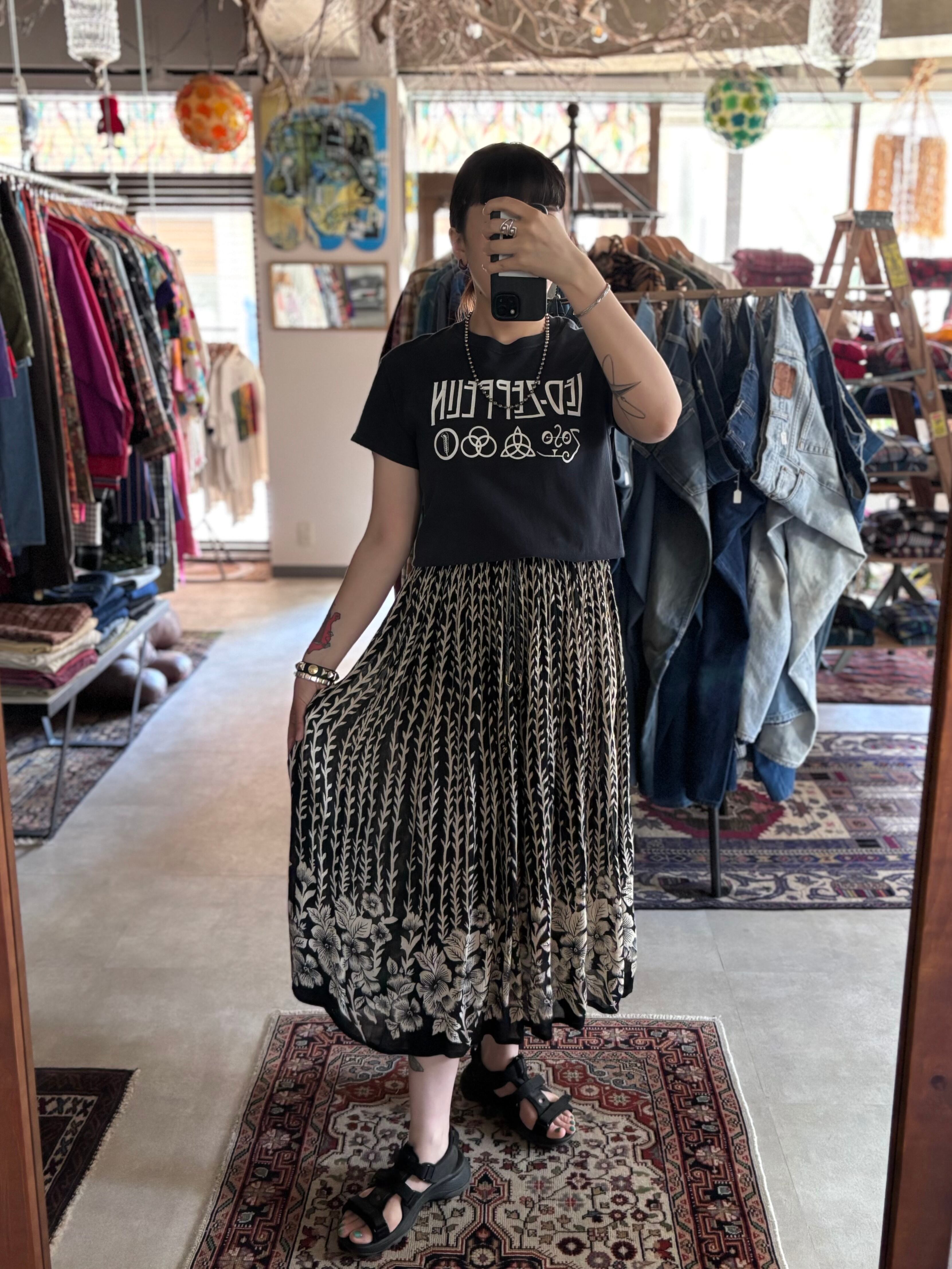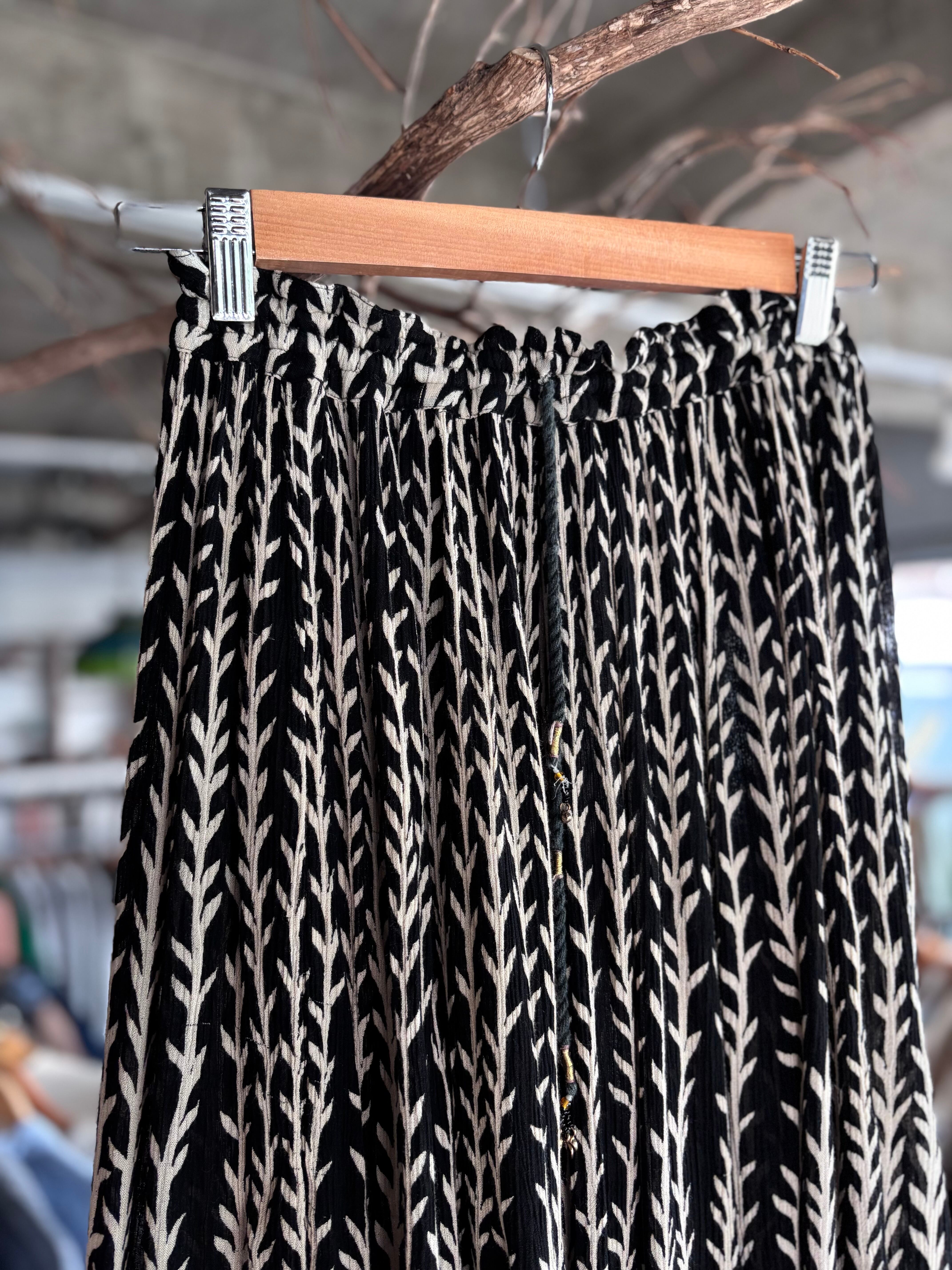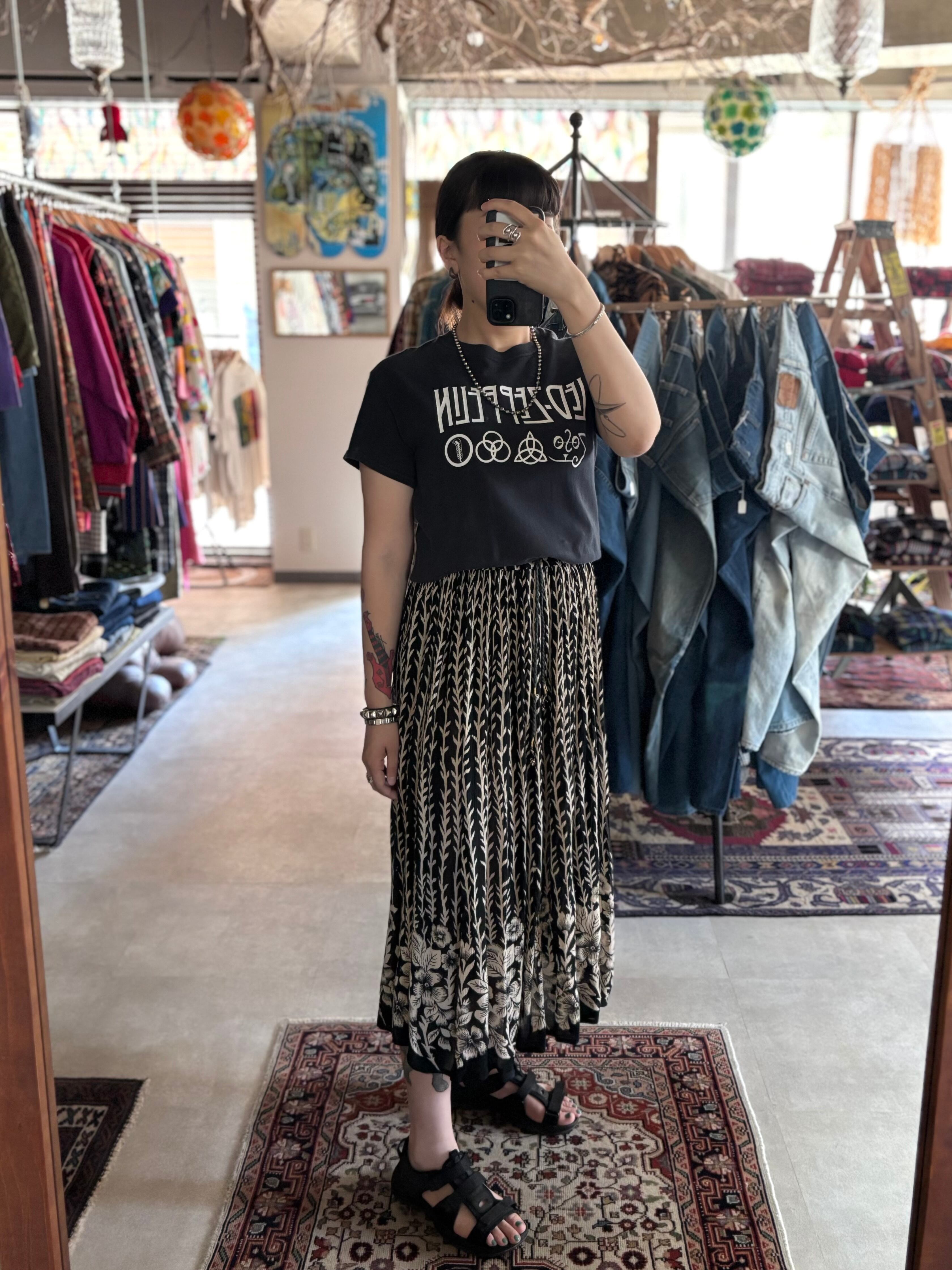 90年代生産のレーヨンスカート。黒地にエレガンスなボタニカル総柄。ウエストゴムで楽な履き心地。程よい丈感で様々なスタイルに取り入れ易いスカートです。