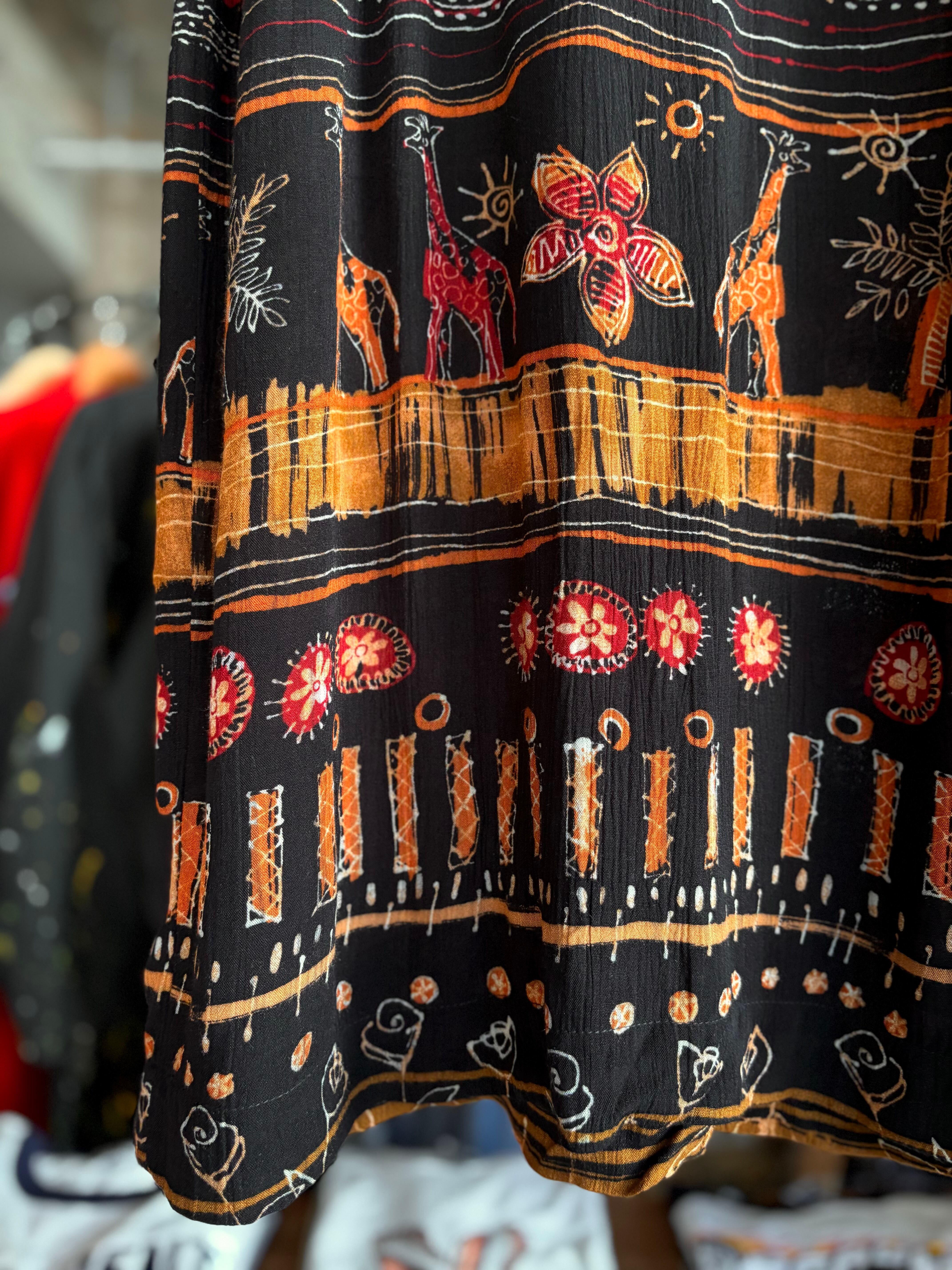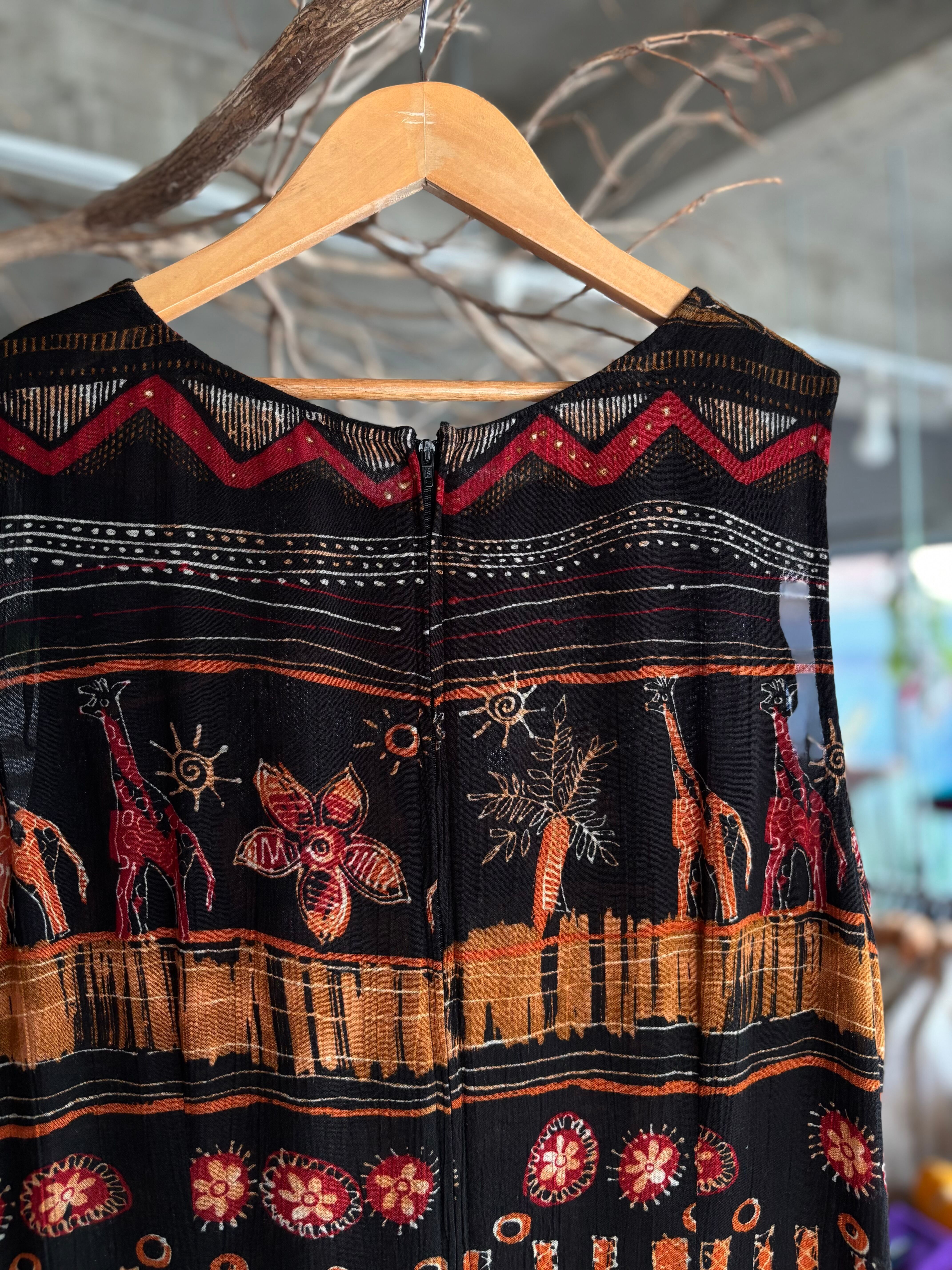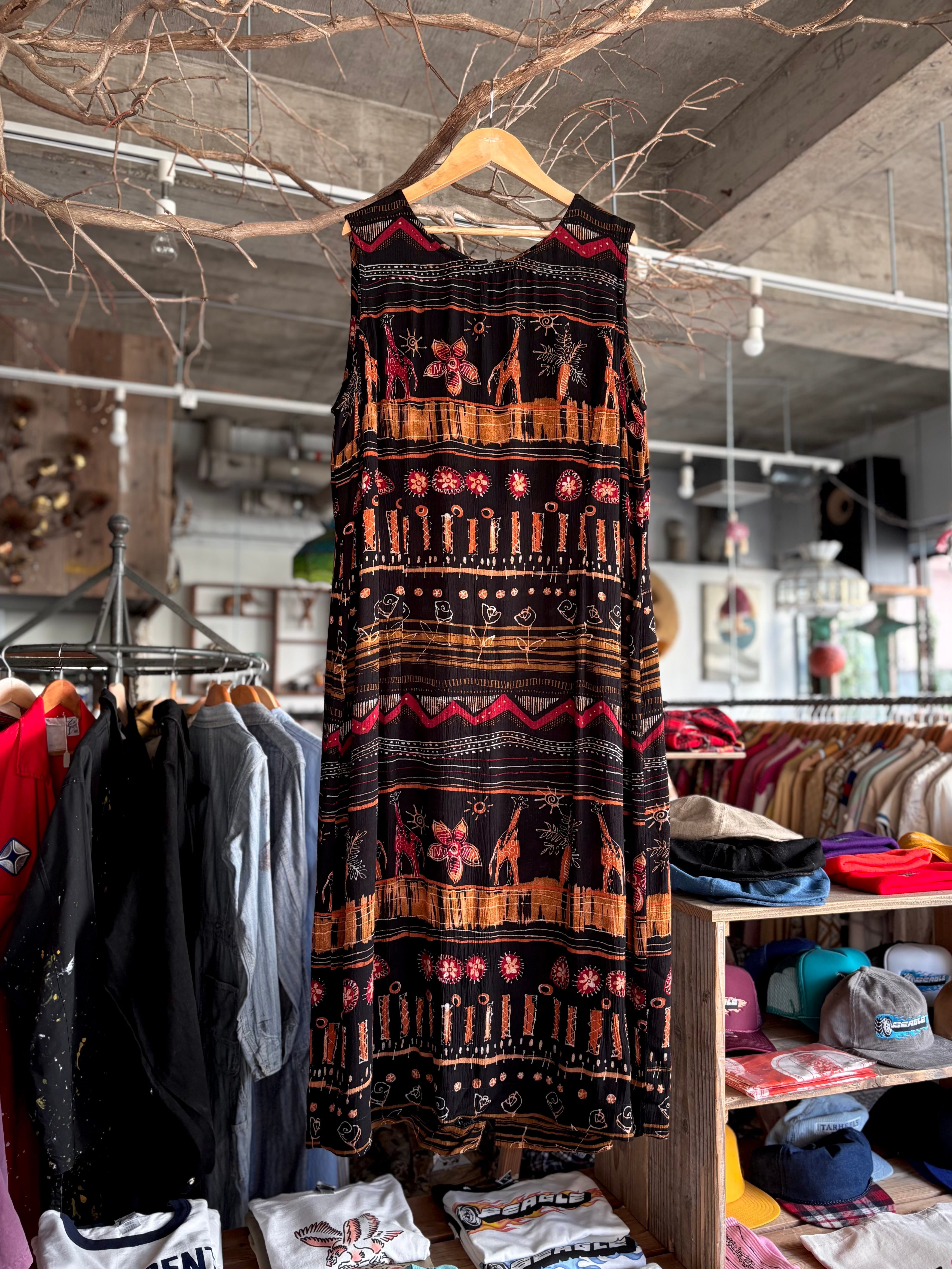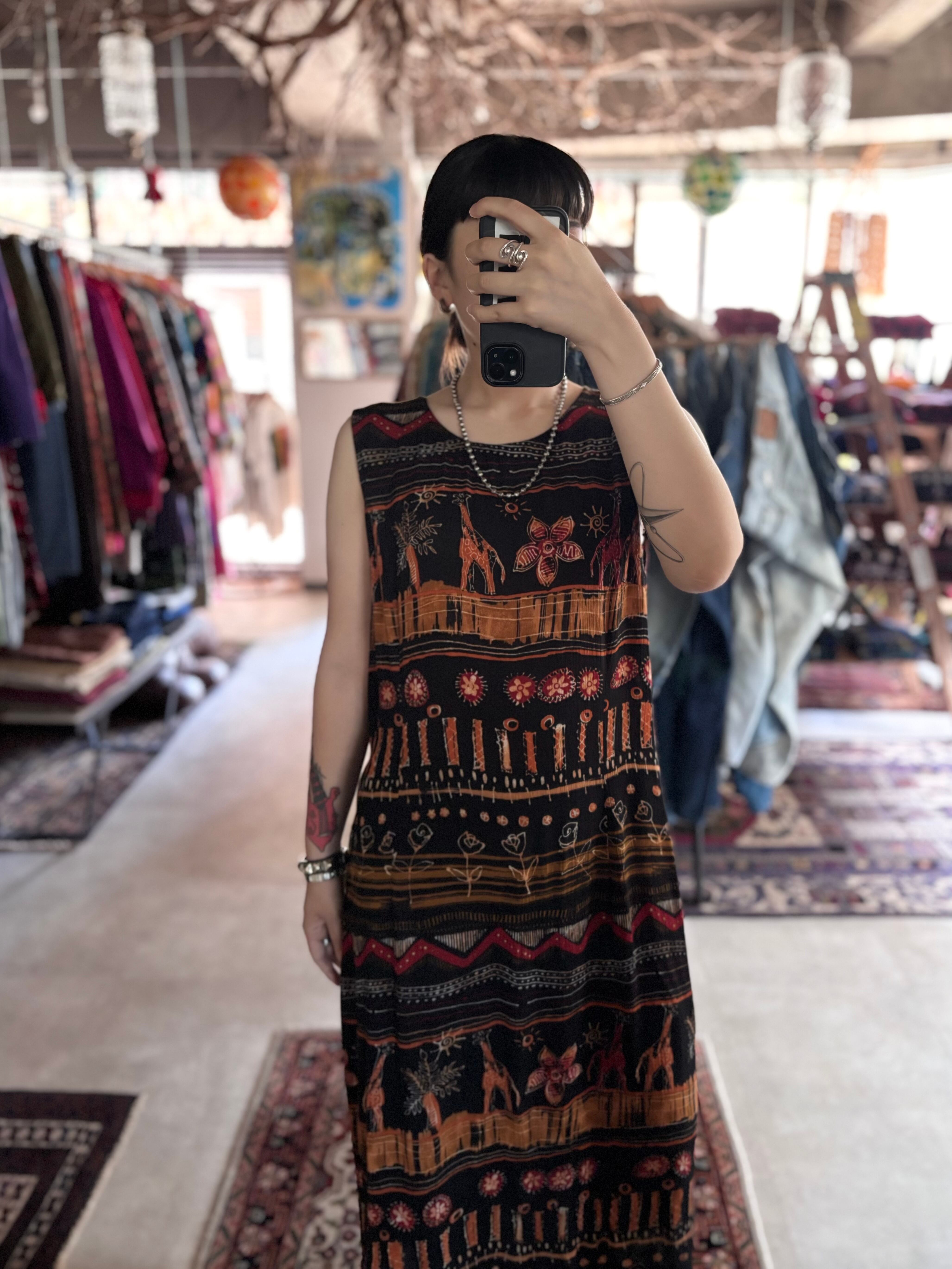 USA MADEのレーヨンワンピース。肌触りの良いレーヨン生地に、絞りの入らないリラックスシルエット。バックジップ仕様に、バックスリット入り。ブラックベースの落ち着いた総柄ファブリック。1枚で着るのはもちろん、レイヤードスタイルにもおすすめです。