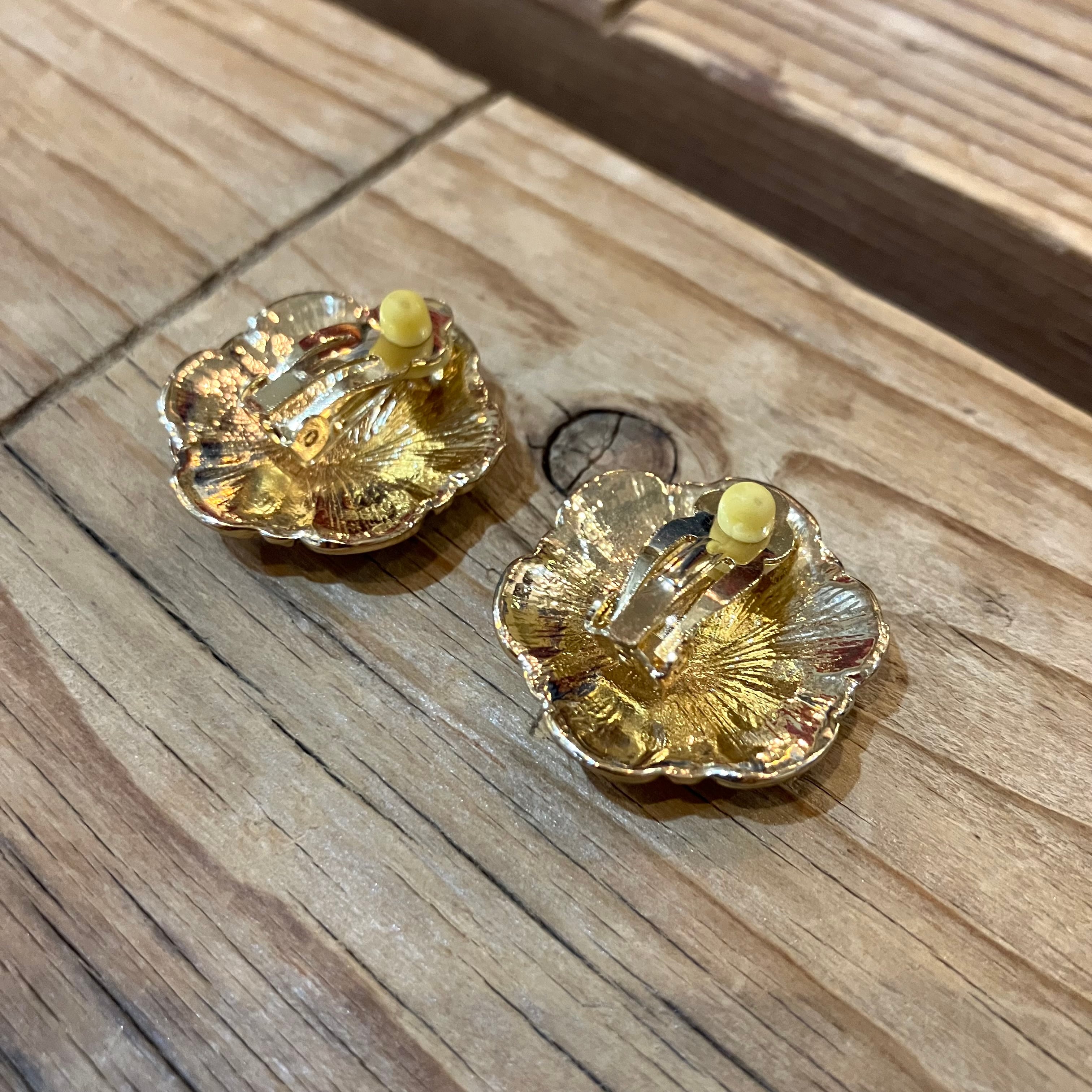 丸みのあるお花のデザインがかわいいエナメルイヤリング。赤・黄・赤紫の絶妙な配色。比較的軽めの着け心地。普段使いにオススメです◎