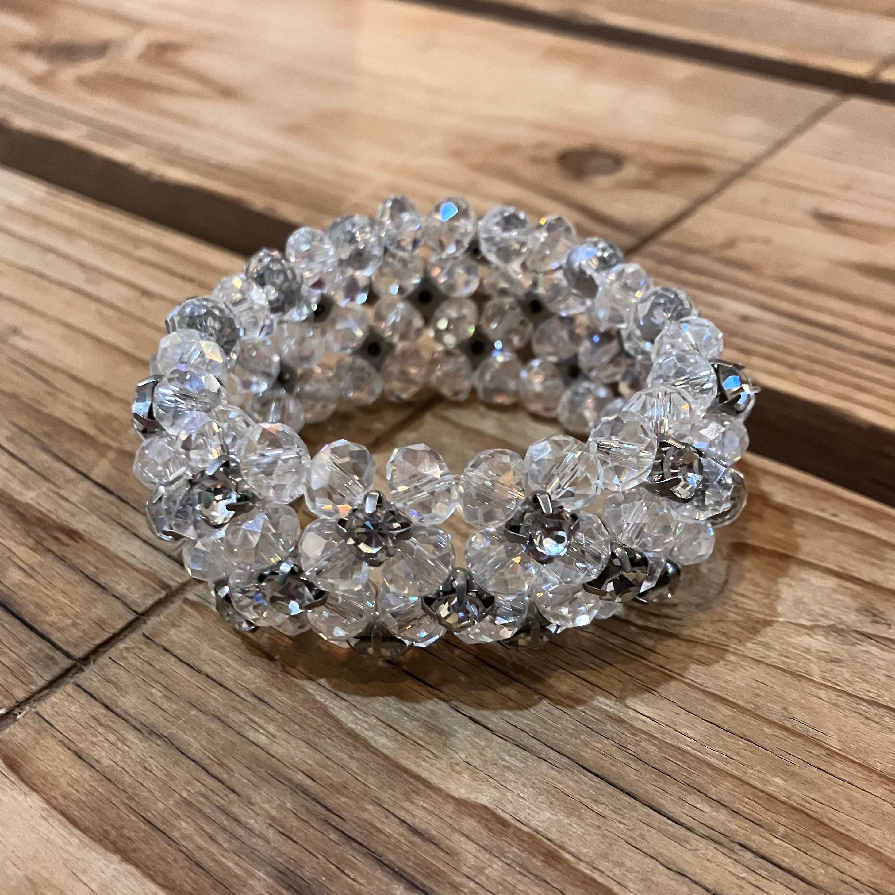 ストレッチタイプのブレスレット。きらめくクリアビーズとラインストーンの組み合わせ。程良く幅広で存在感あります。お呼ばれの場にもおすすめです。