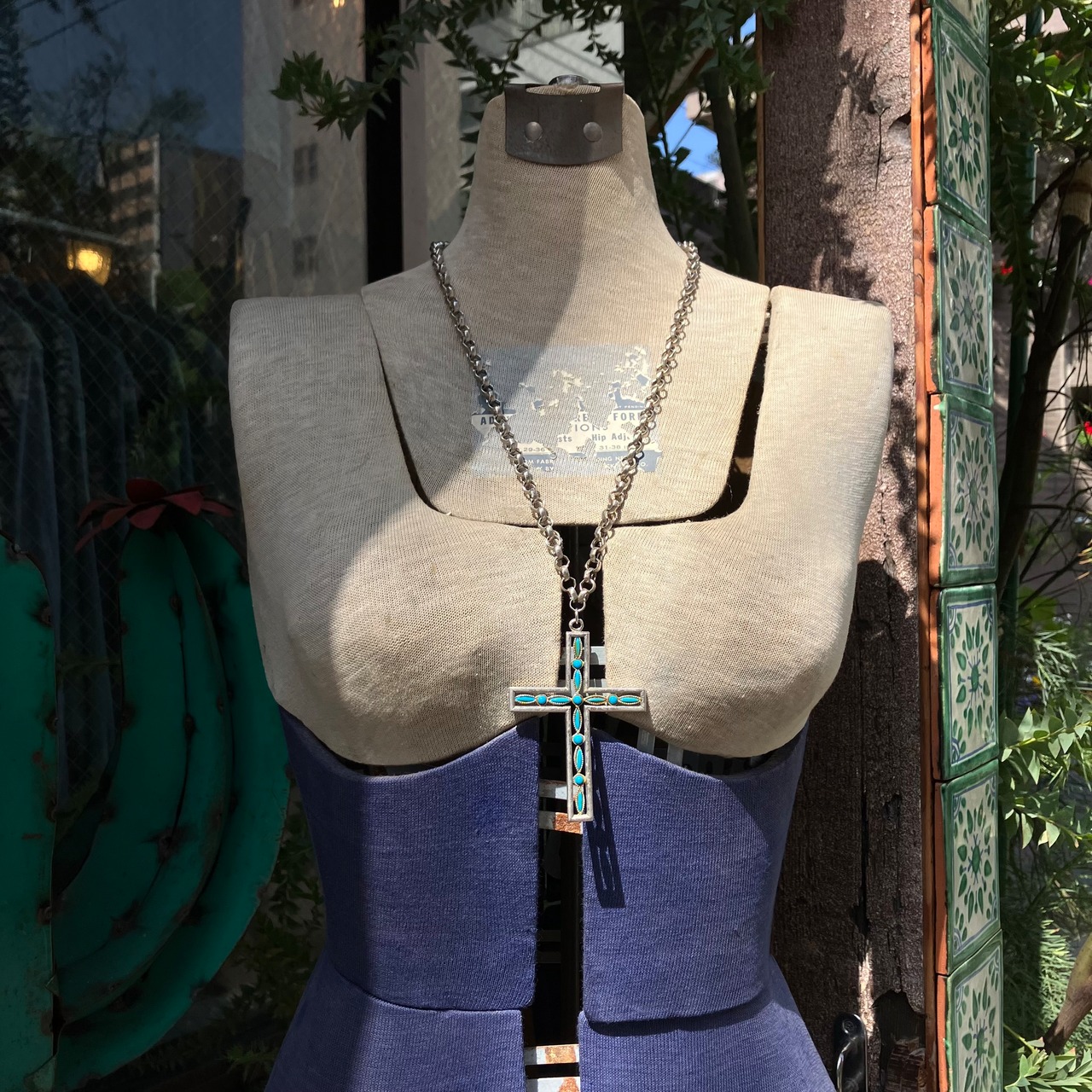 透かしのシルバートーンのクロスにターコイズのイミテーションストーン。