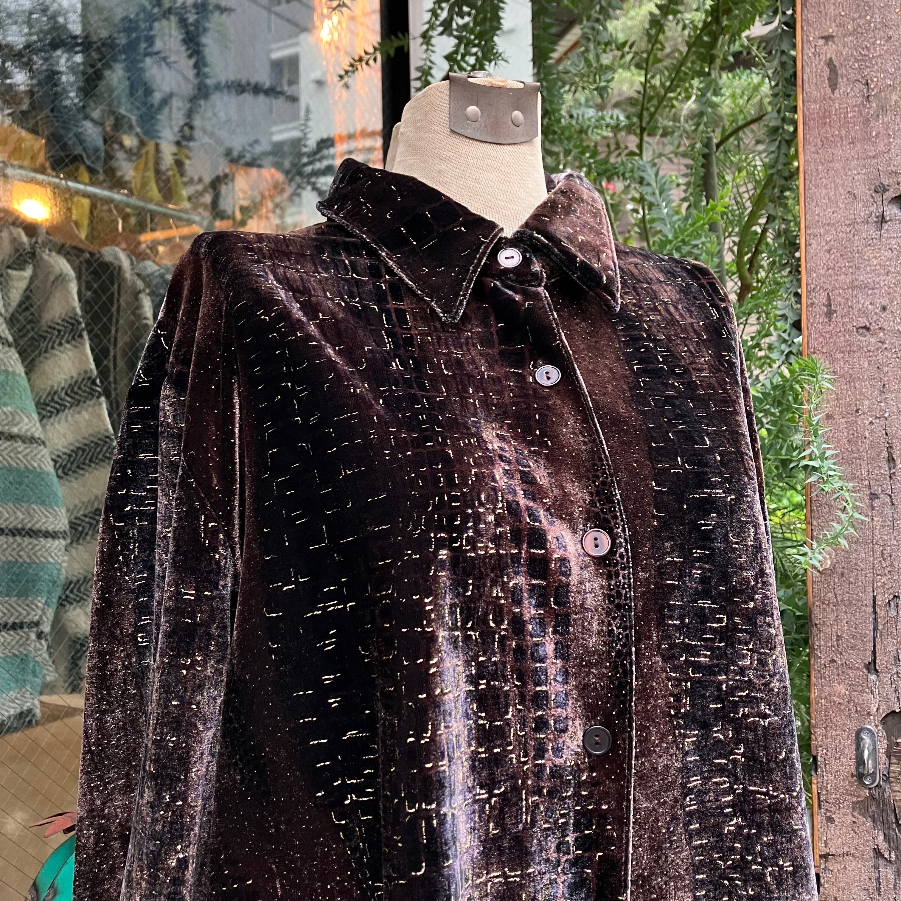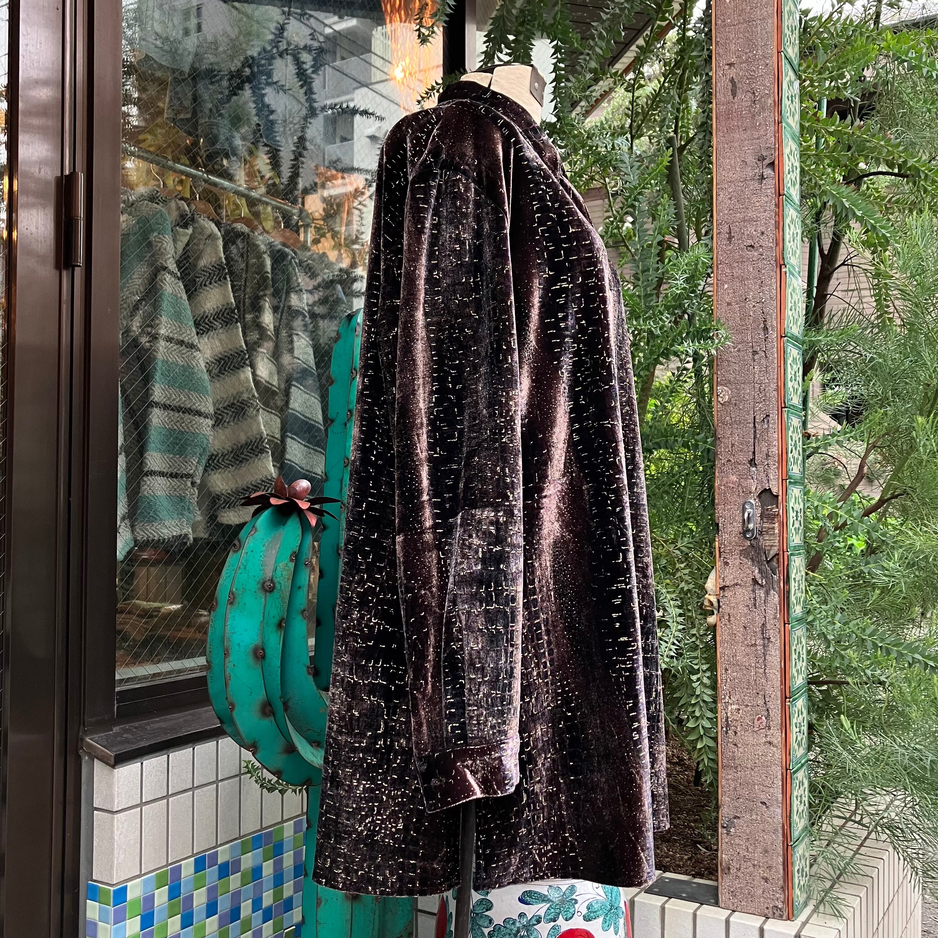 ブラックに近いダークブラウン地のベロア生地にゴールドラメの織り柄が入るロングブラウス。クールかつ上品な印象で、大人の女性におすすめです◎