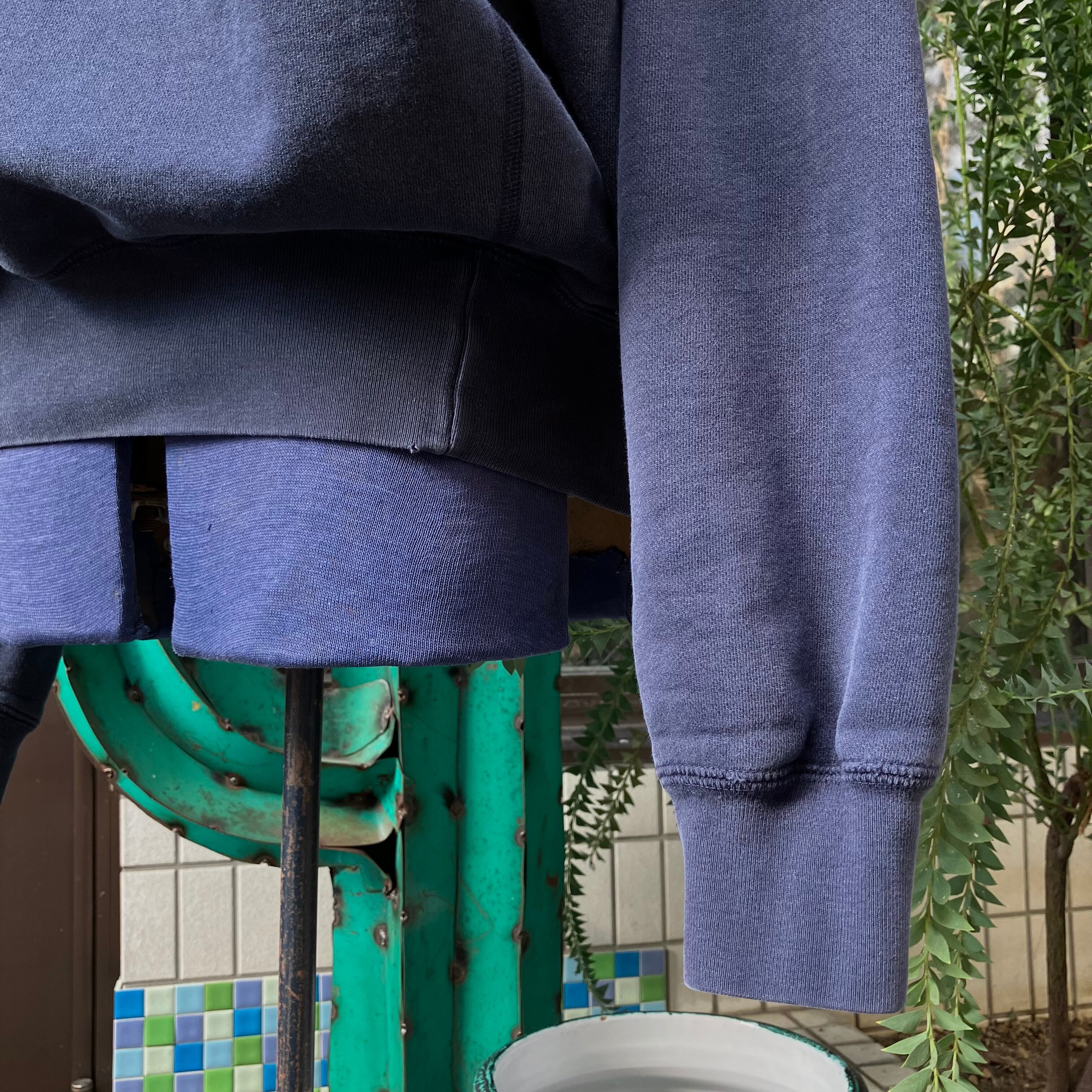 しっかりした厚みのコットン素材。程よい色褪せ感のネイビーカラー。たっぷりした身幅に、短めの着丈と締まったリブが上品なシルエット。