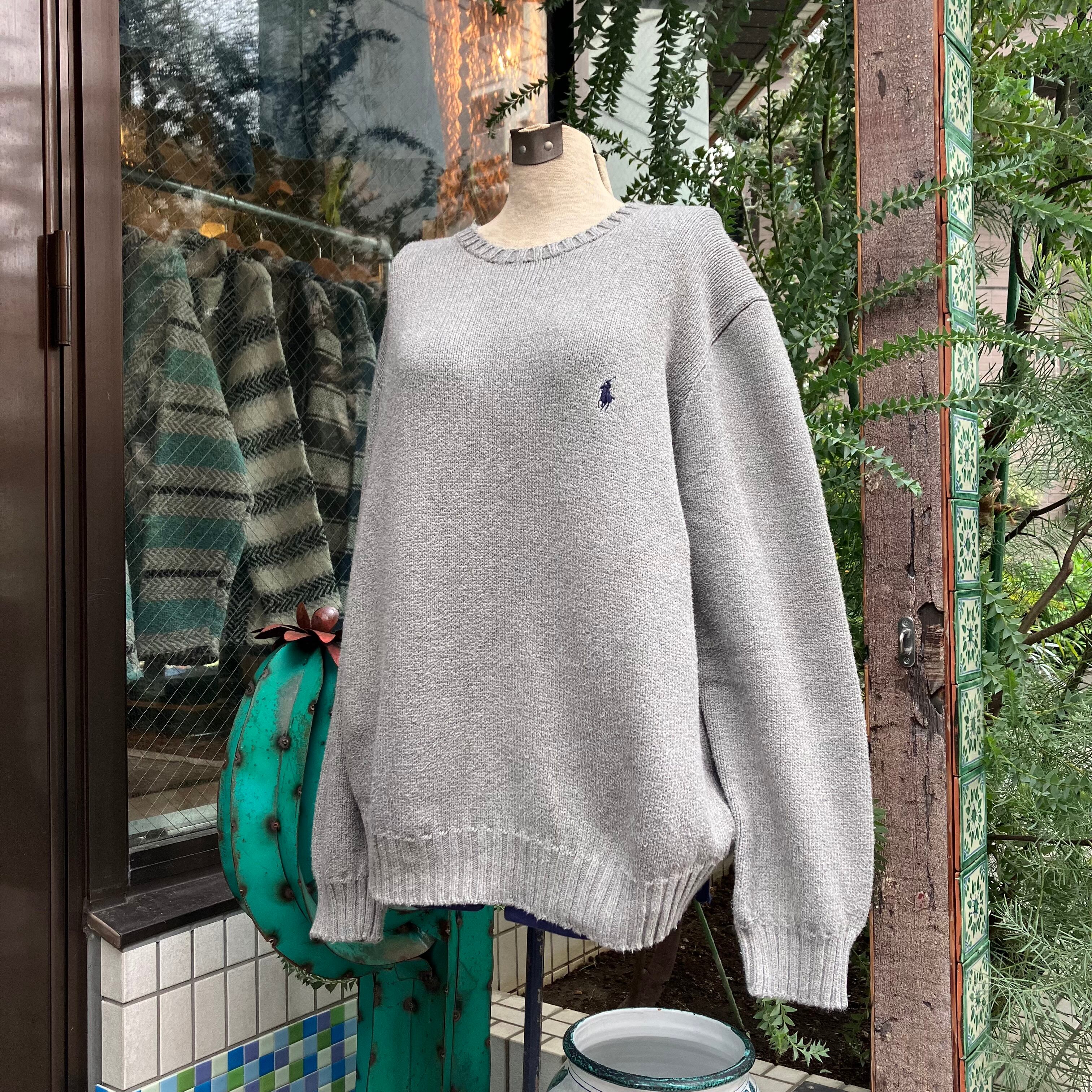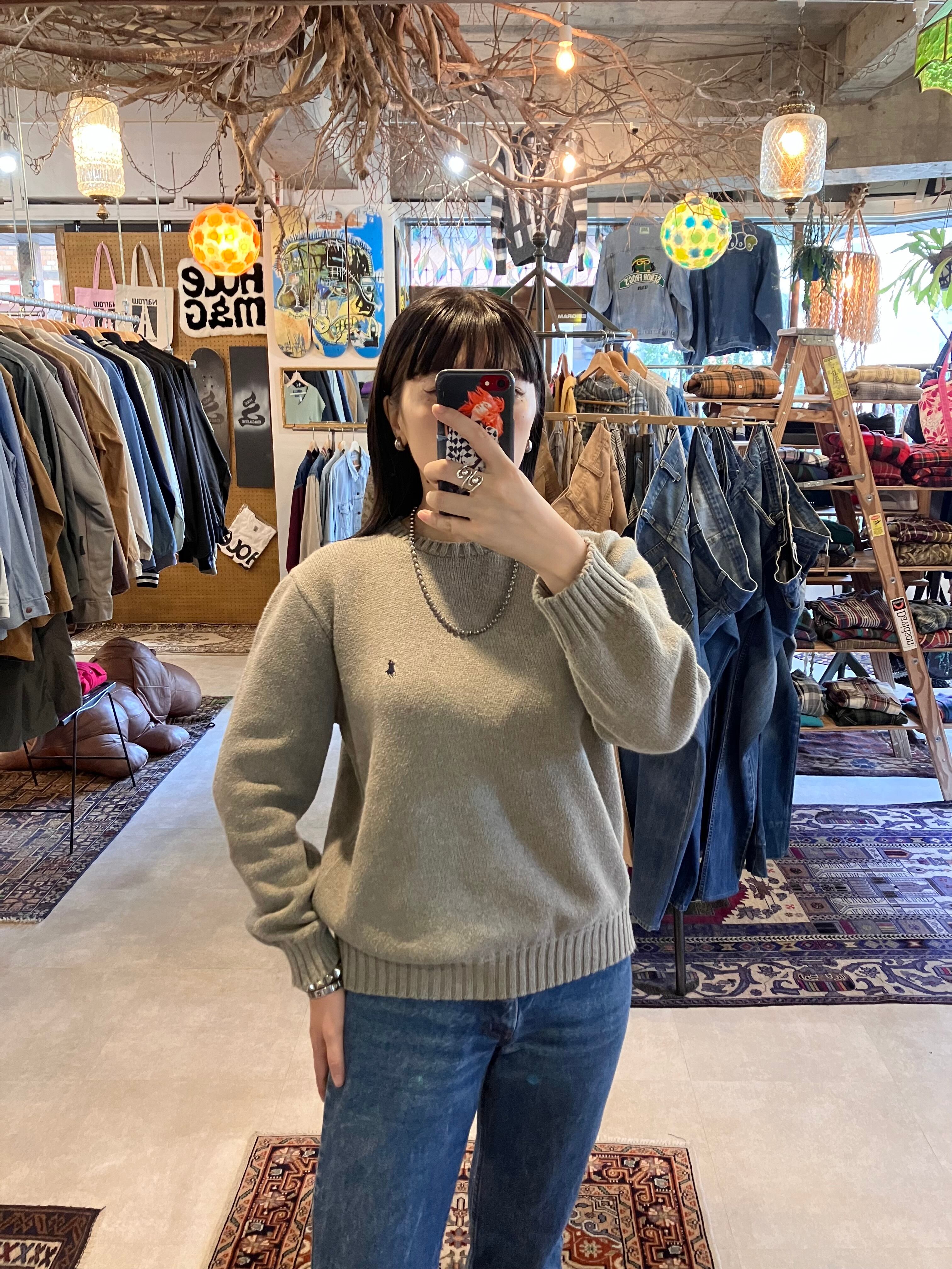 しっかりした厚みのコットンニット素材。程よくゆとりのあるシルエット。カーキとグレーの中間のような落ち着いたアースカラー。