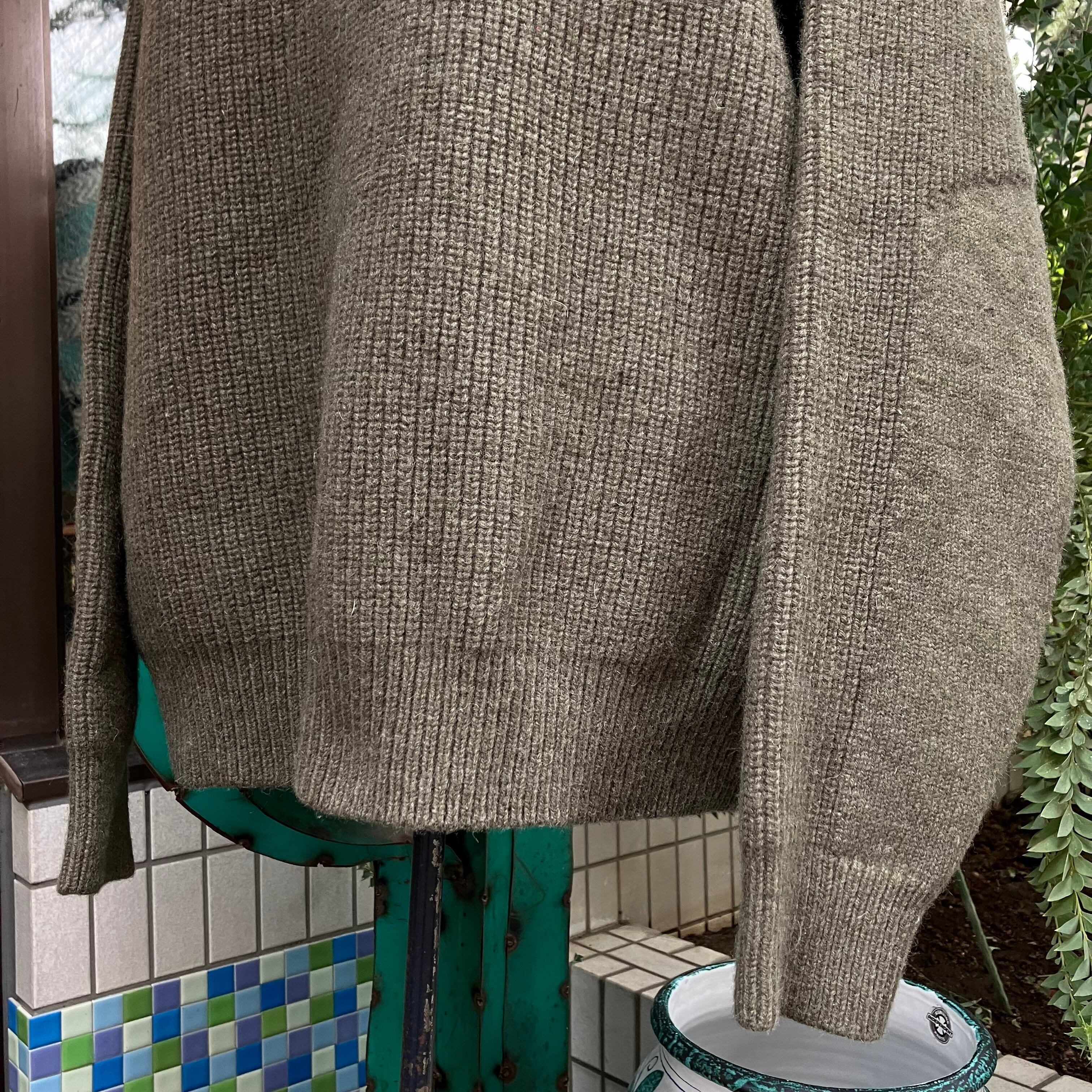 厚みがありながら肌触りの良いメリノラムウール素材。程よくゆとりのあるシルエット。柔らかい印象のカーキカラー。ネック周りには柔らかいフリース生地が施された、ハーフジップ仕様。