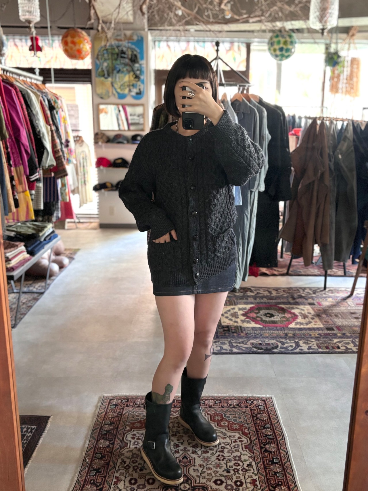 しっかりした厚みのウール素材。膨らみすぎないコンパクトなシルエット。アランニットでは珍しいブラックベースのカーディガンタイプ。生地、編み目ともに質感の良いアイルランド製。ユニセックスでおすすめです◎