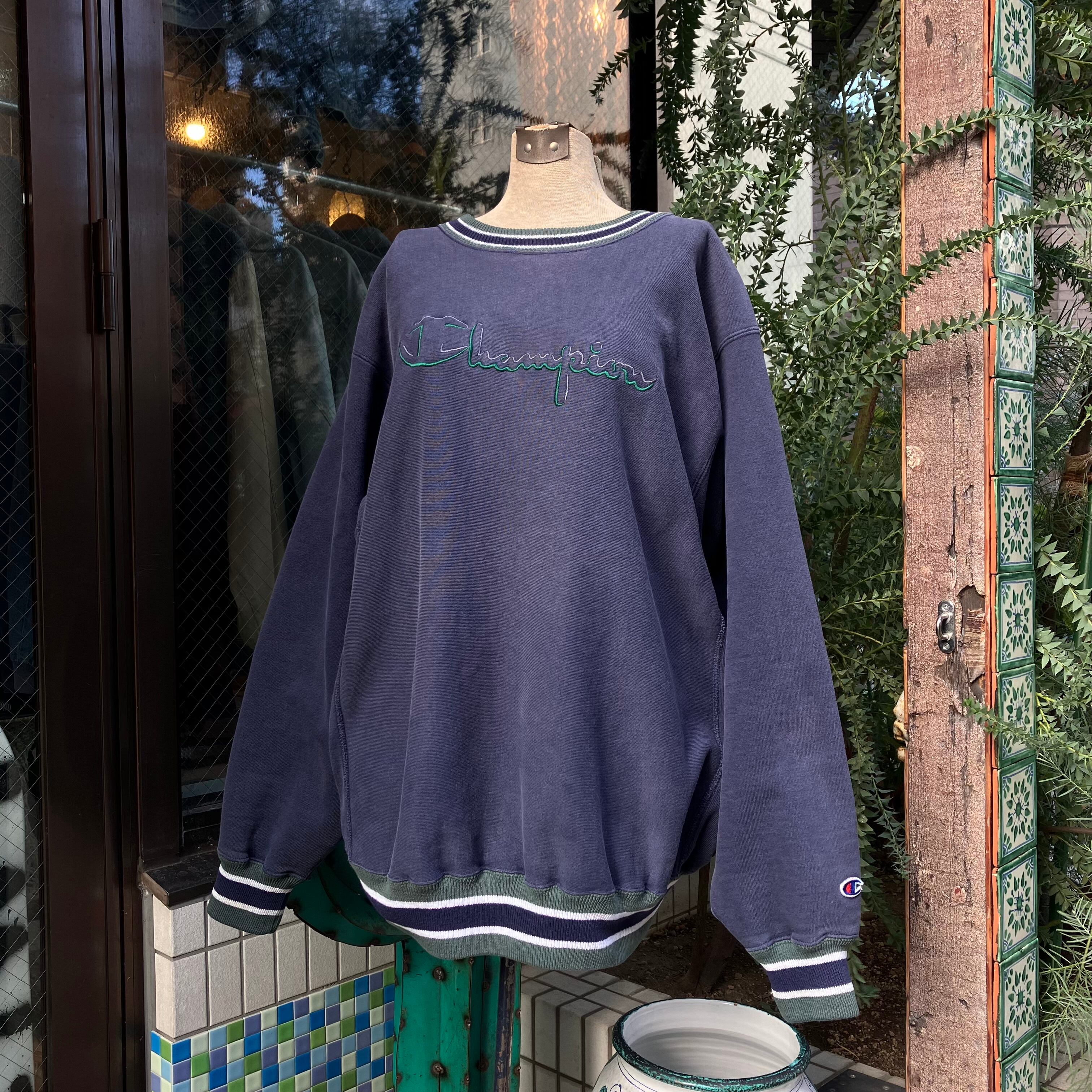 分厚いしっかりとした生地感。フロント刺繍入りでリブはライン入り仕様。定番のビンテージチャンピオン。XL表記、ゆとりのあるシルエット。