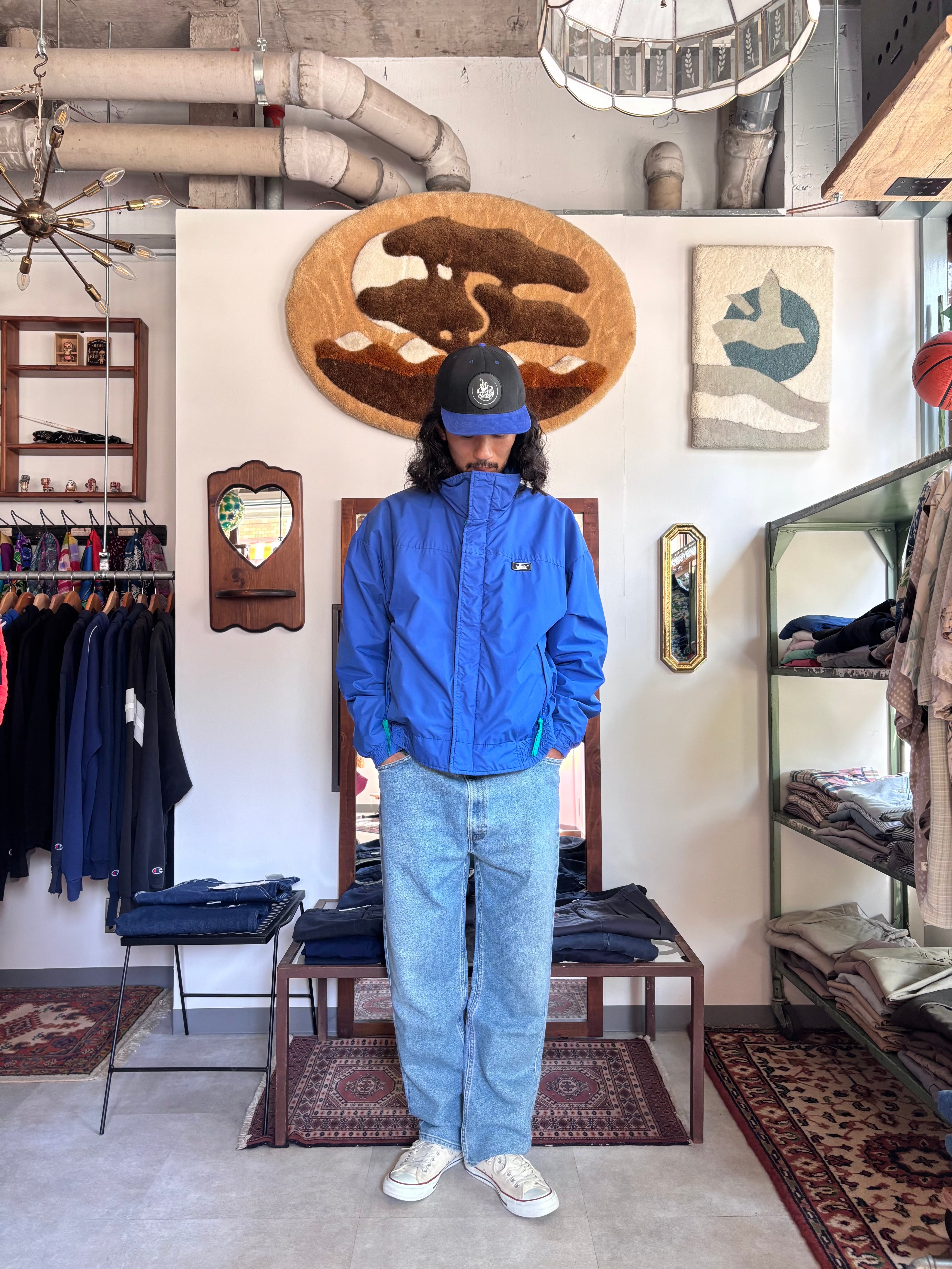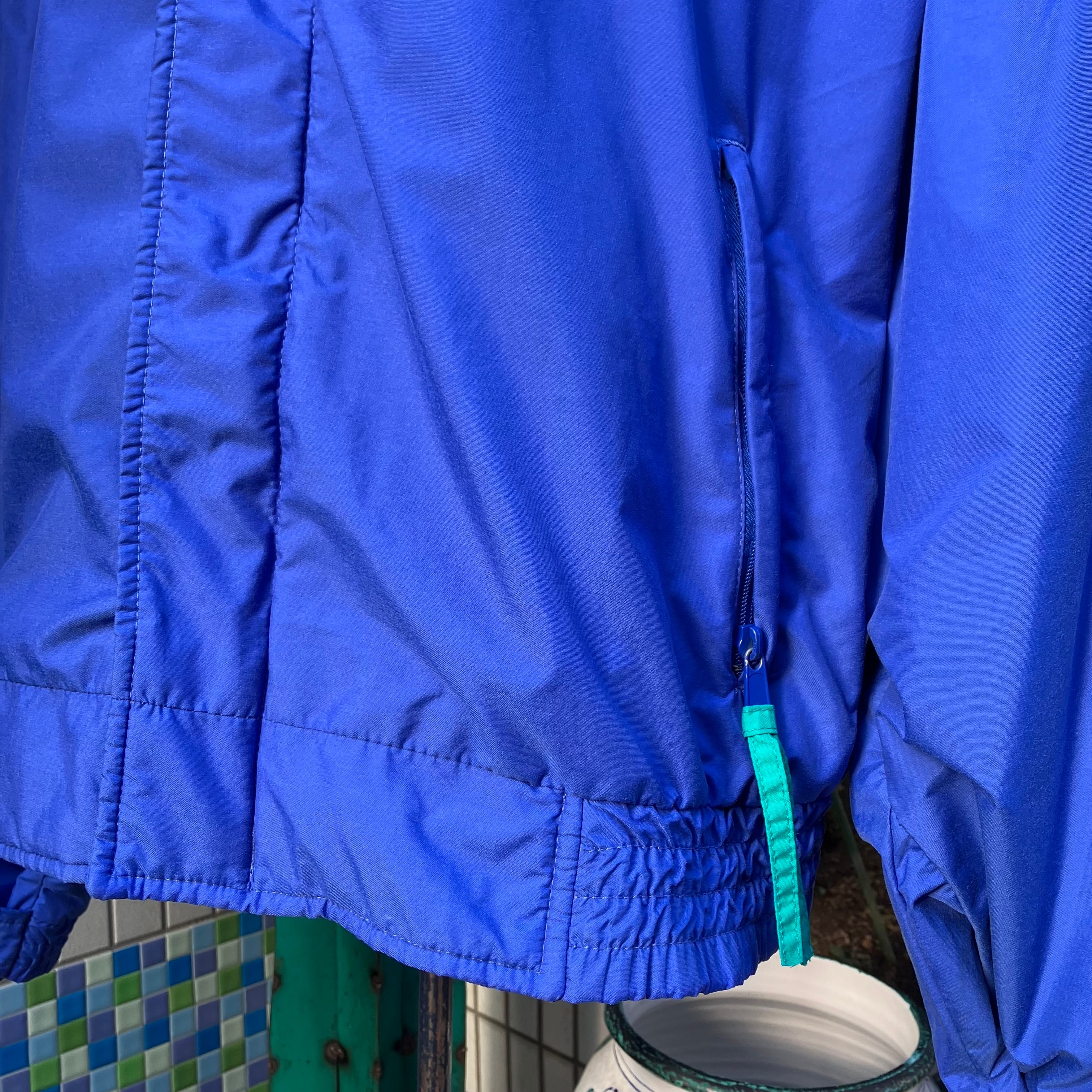 軽い着心地のナイロン素材。リラックスシルエット。ブルーのシェルに、ターコイズライナーがOLD アウトドア感抜群。ジップのプルタブも残る良好コンディション。