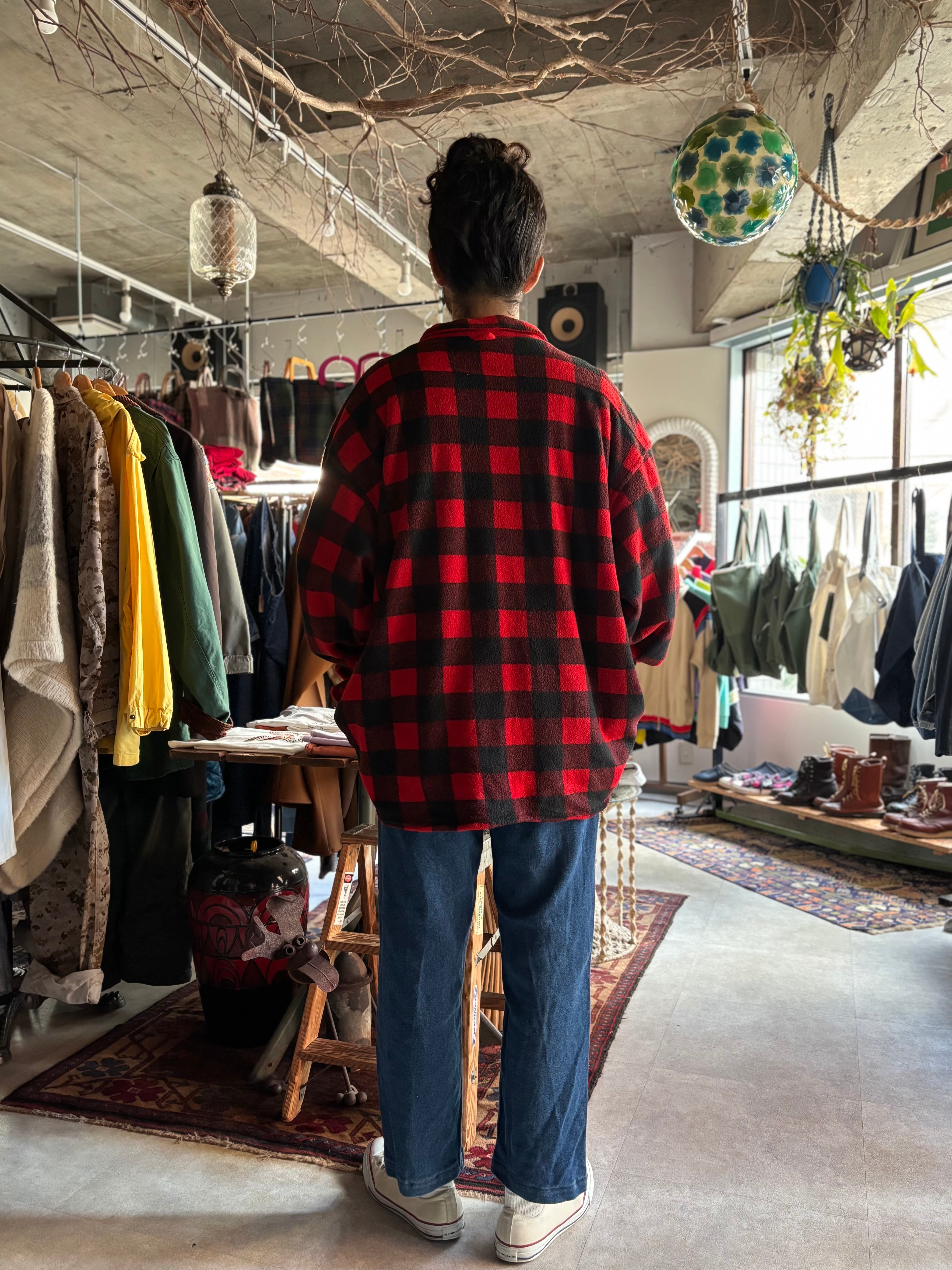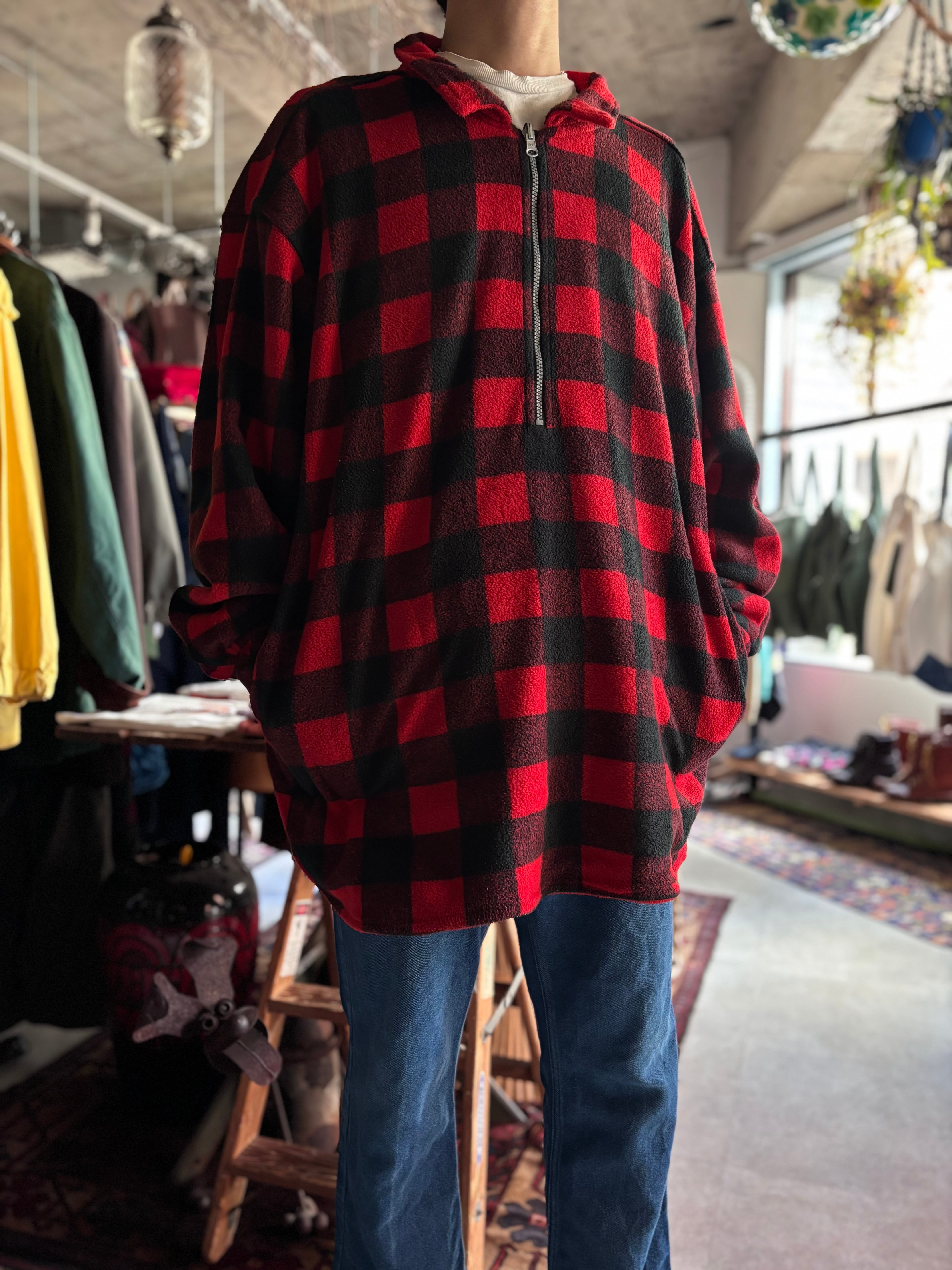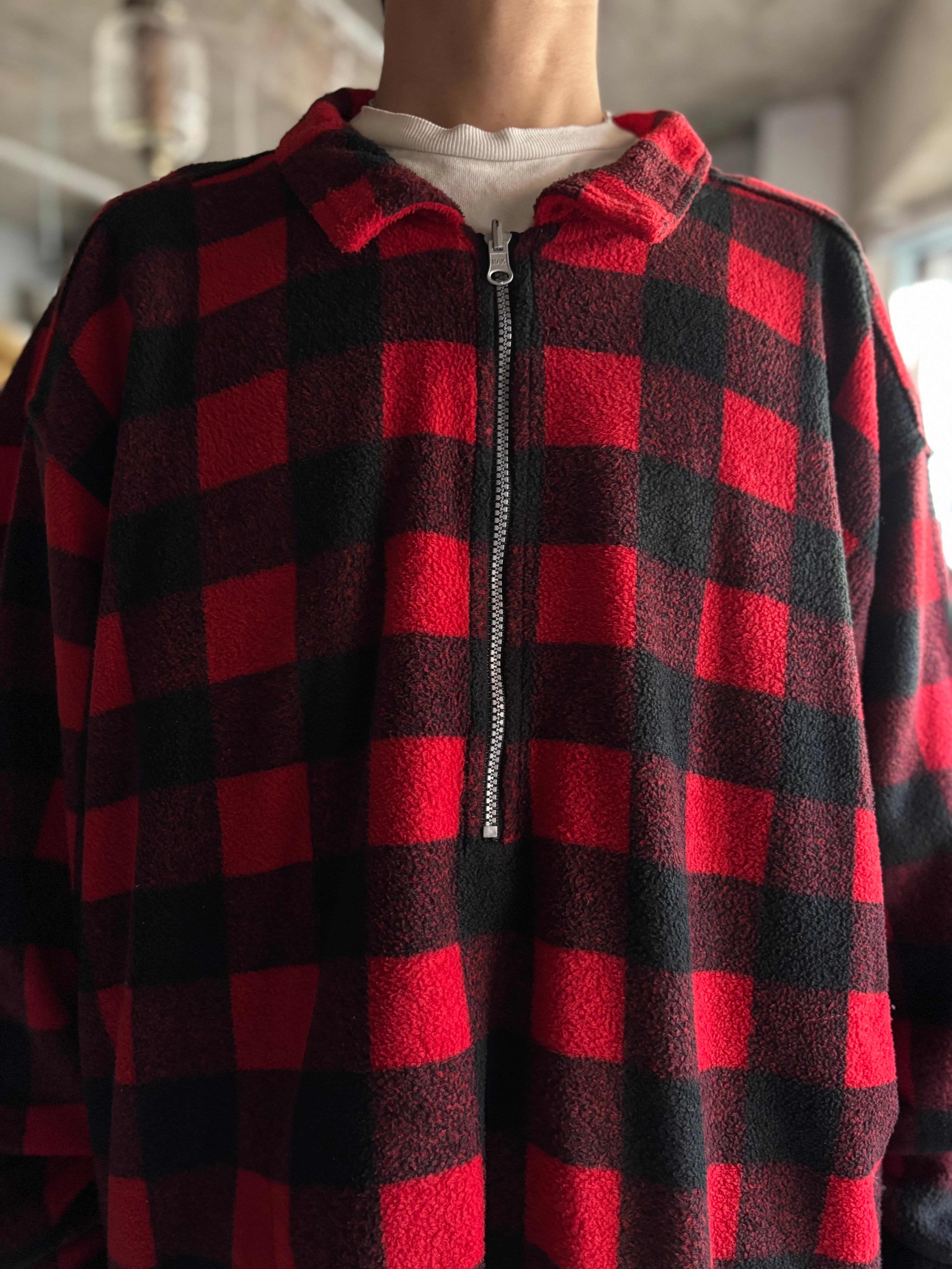 軽く暖かいフリース生地。赤の単色と、赤黒バッファローチェックのリバーシブル。ルーズシルエット。着用時のバランスが抜群な1着。