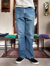 柔らかいストレッチ感のあるデニム生地。履き込まれた自然な濃淡と、ヒゲが入る色落ち。深めの股上に、テーパードのないストレートシルエット。装飾的なバックポケットの飾りステッチ。このタイプの生地特有のマットな色落ちがOLD感強めで良い風合いです。
